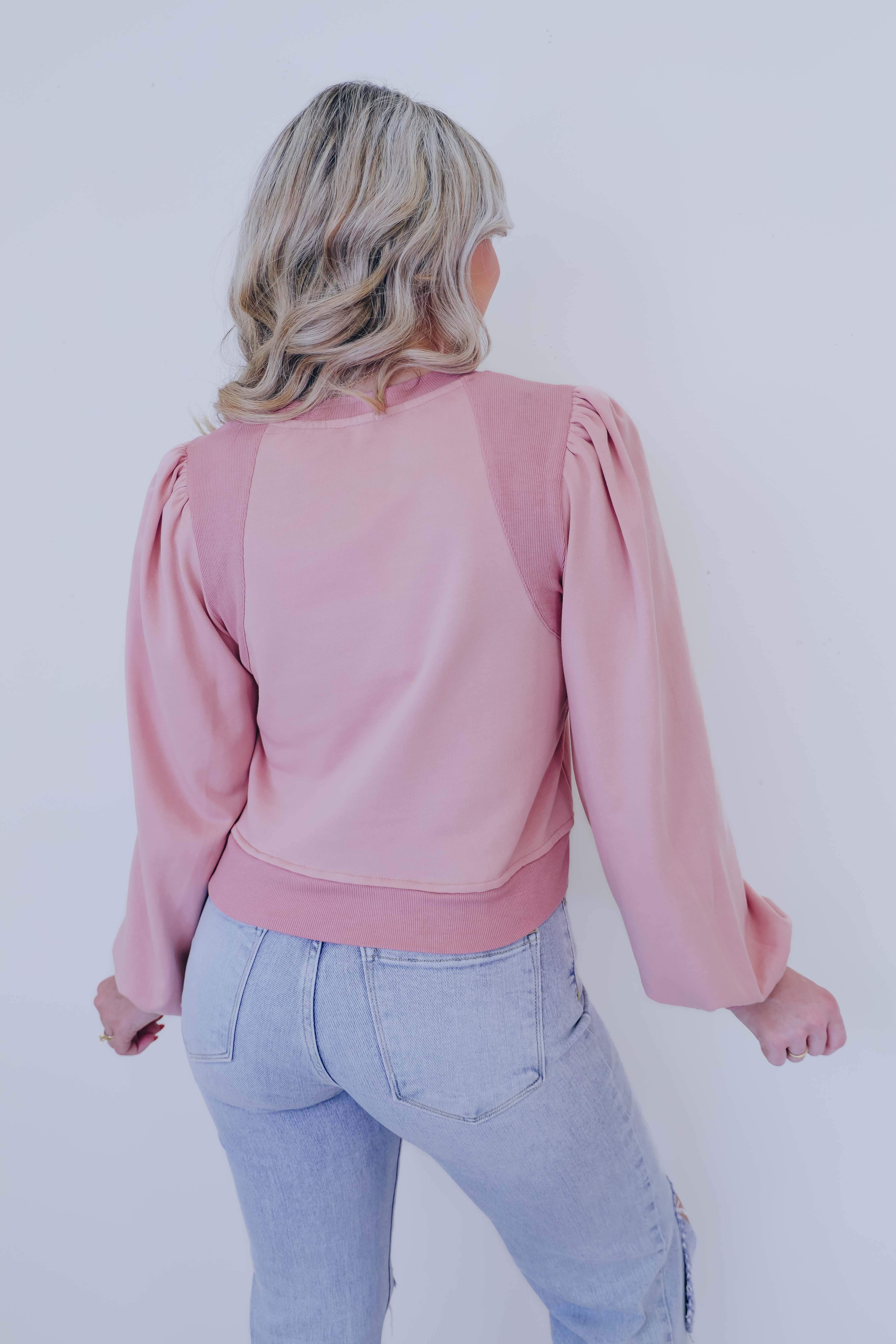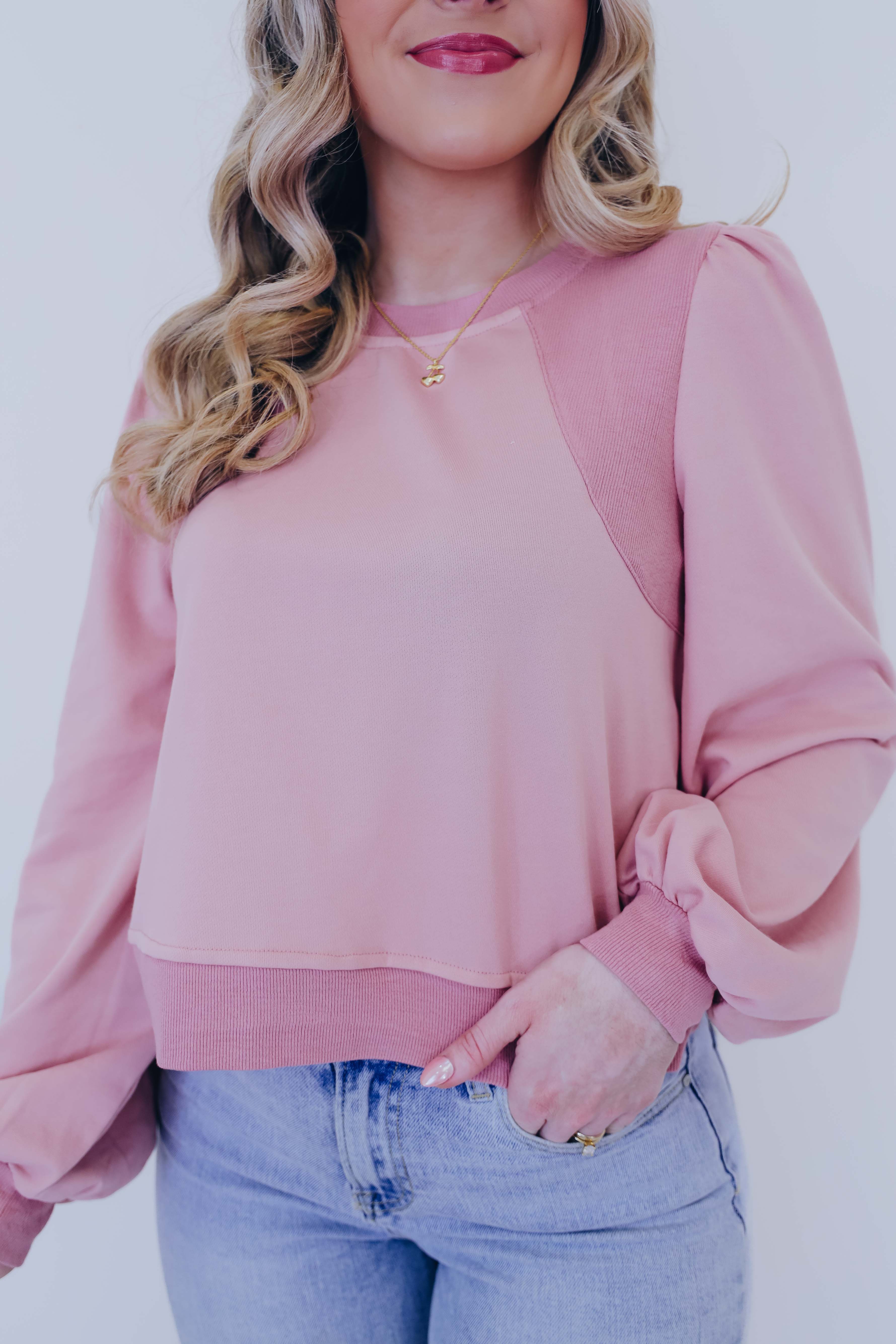 - Features a super soft terry knit fabric, crew neck, textured fabric block detail, puff full length sleeves with ribbed cuff, and a cropped banded hem.