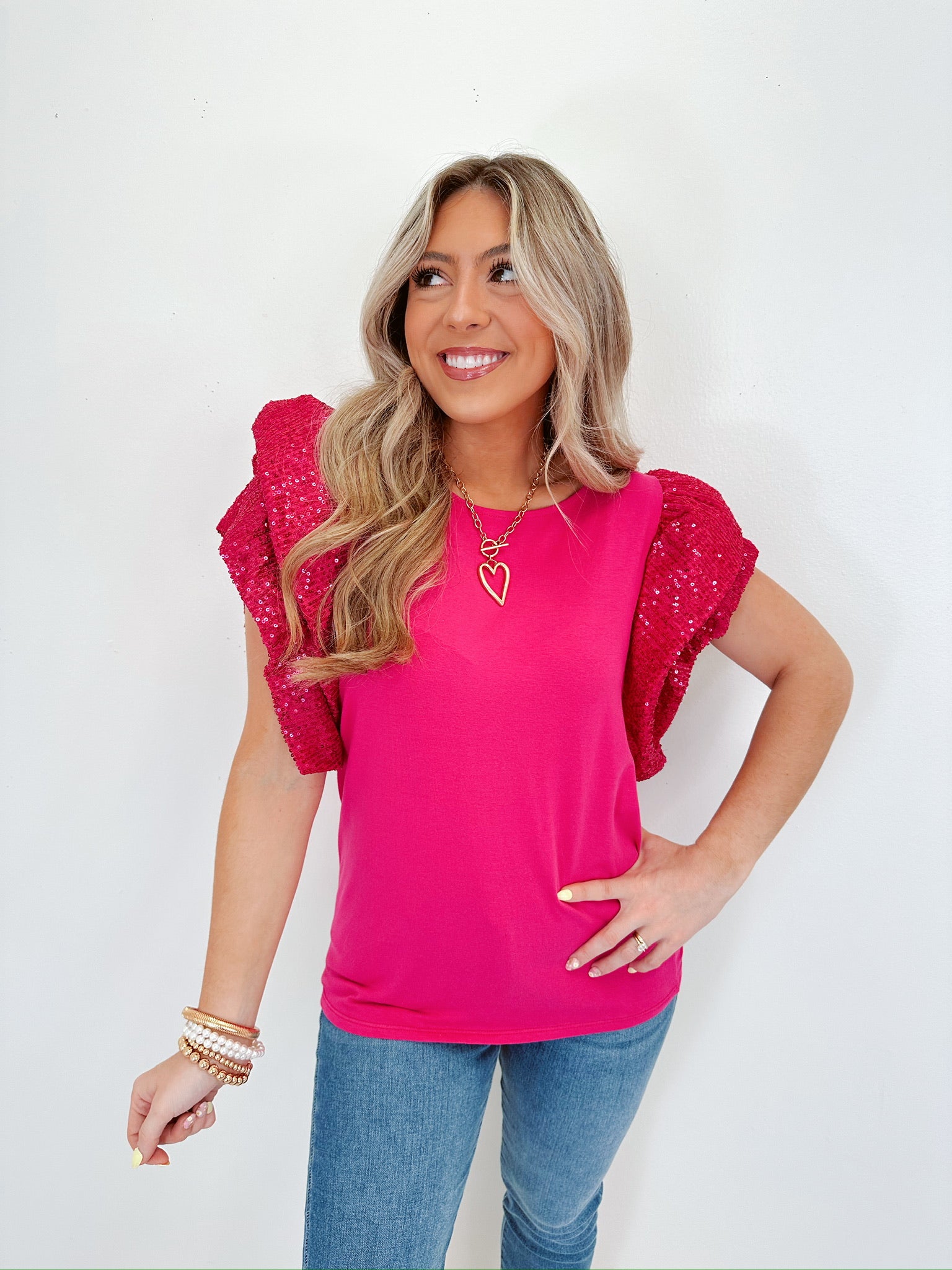 - Add a touch of sparkle to your wardrobe with our Raleigh Ruffle Shoulder Top. It features a trendy sequin ruffle detail on the shoulders, giving an elevated element to a basic tee. Dress it up with a skirt and heels or keep it casual with jean shorts and sandals for a fun errand day fit.