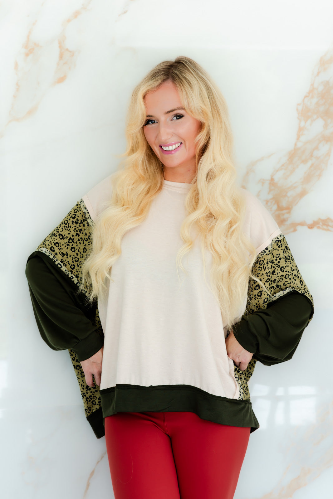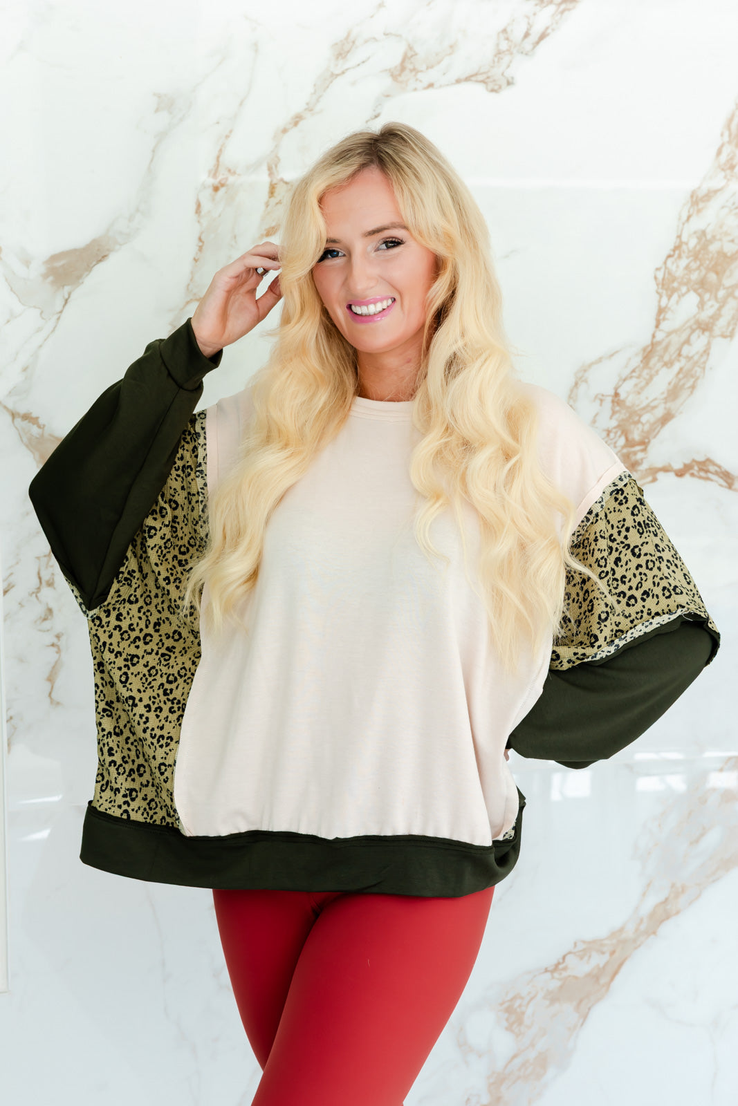 Bring a touch of wild to your everyday style with our Fierce Fusion Sweatshirt. Designed with a soft cream body and contrasted by bold animal print sleeve panels, this pullover blends cozy comfort with an elevated boutique look. The drop-shoulder silhouette and oversized fit give it an effortless, relaxed vibe, while the solid color blocking on the sleeves and hemline adds balance and structure.