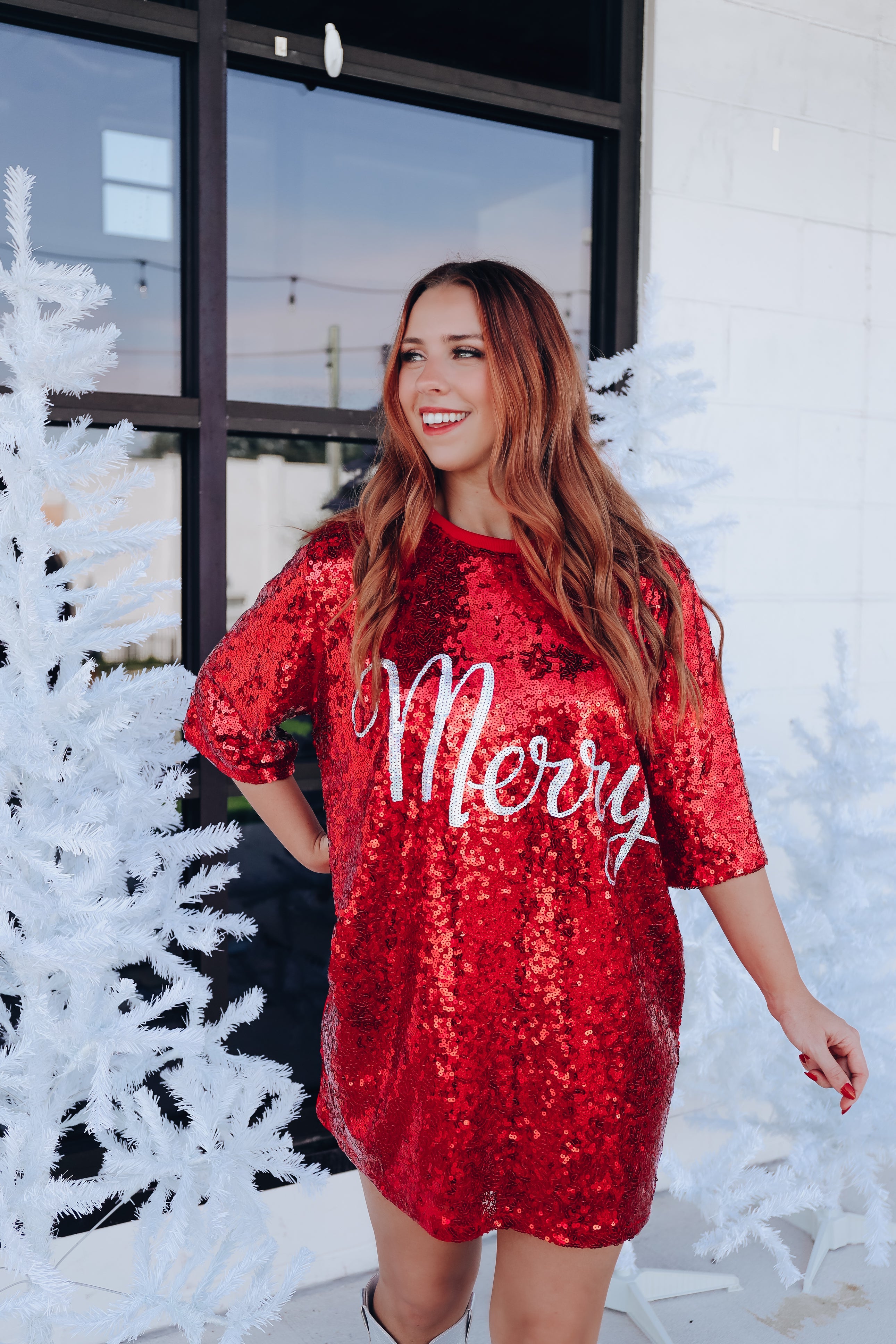 - Features a crew neck, short sleeves, full inner lining, sequin front and sleeves, with a cursive sequined white "Merry" graphic.
