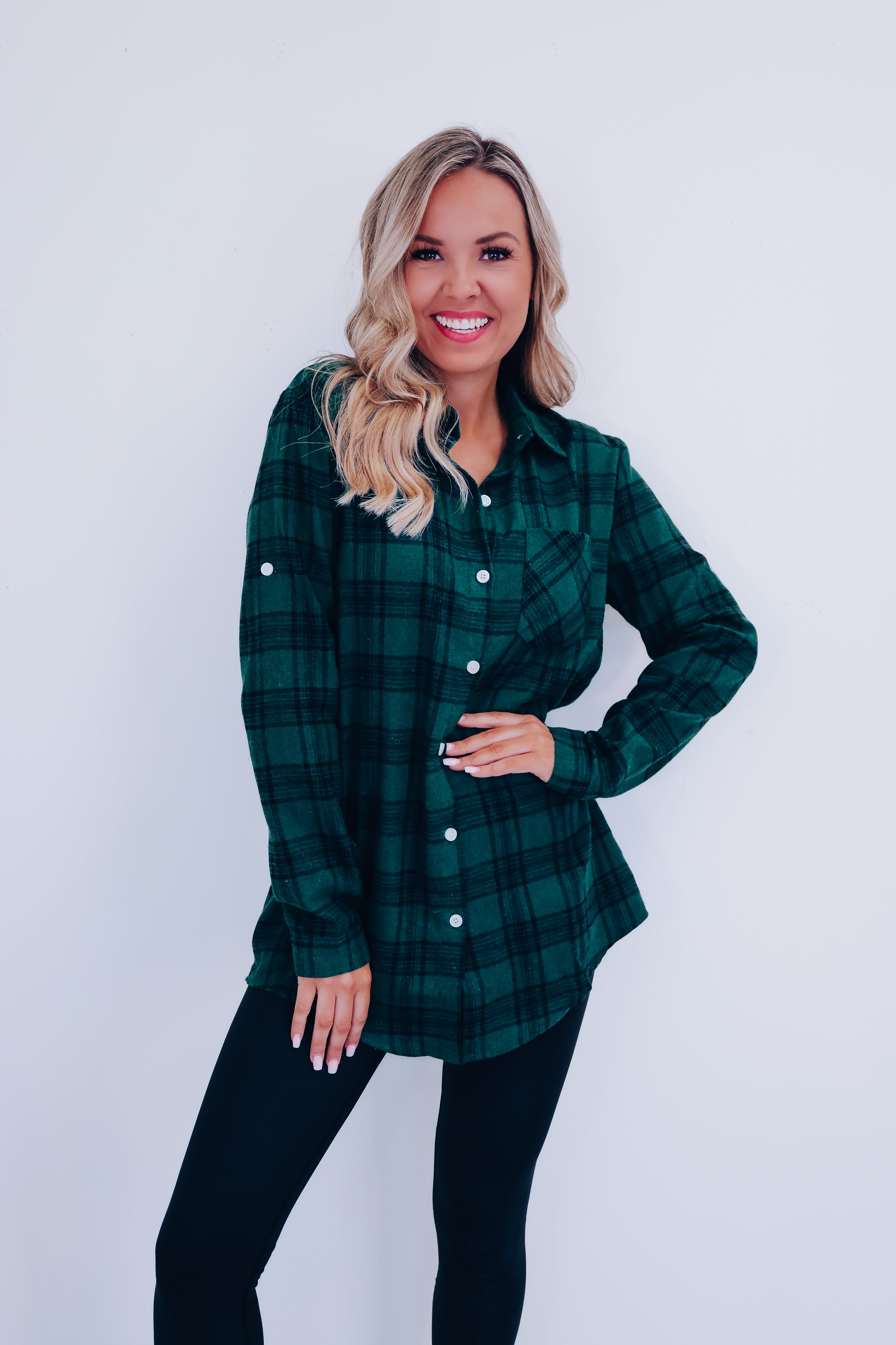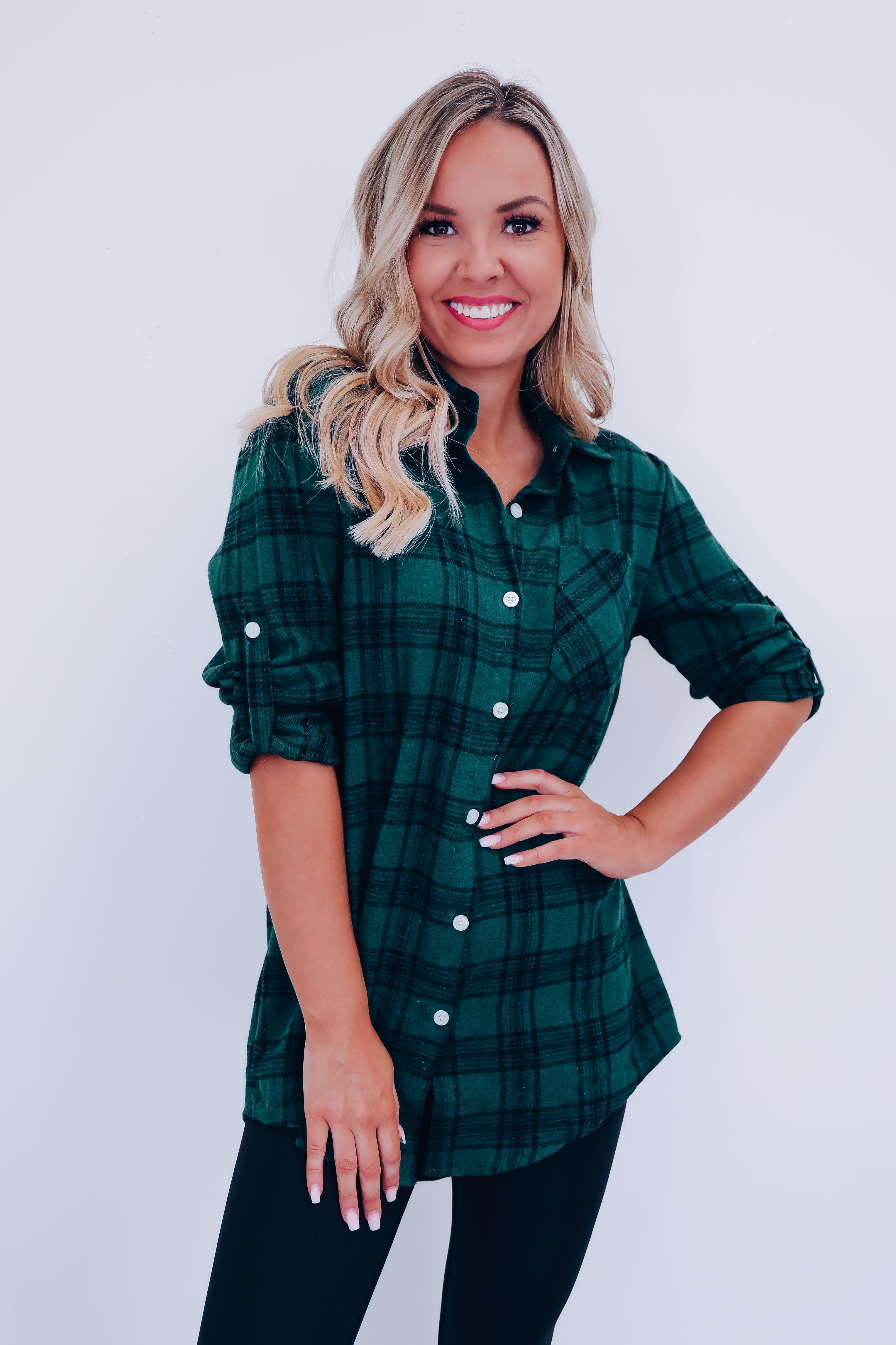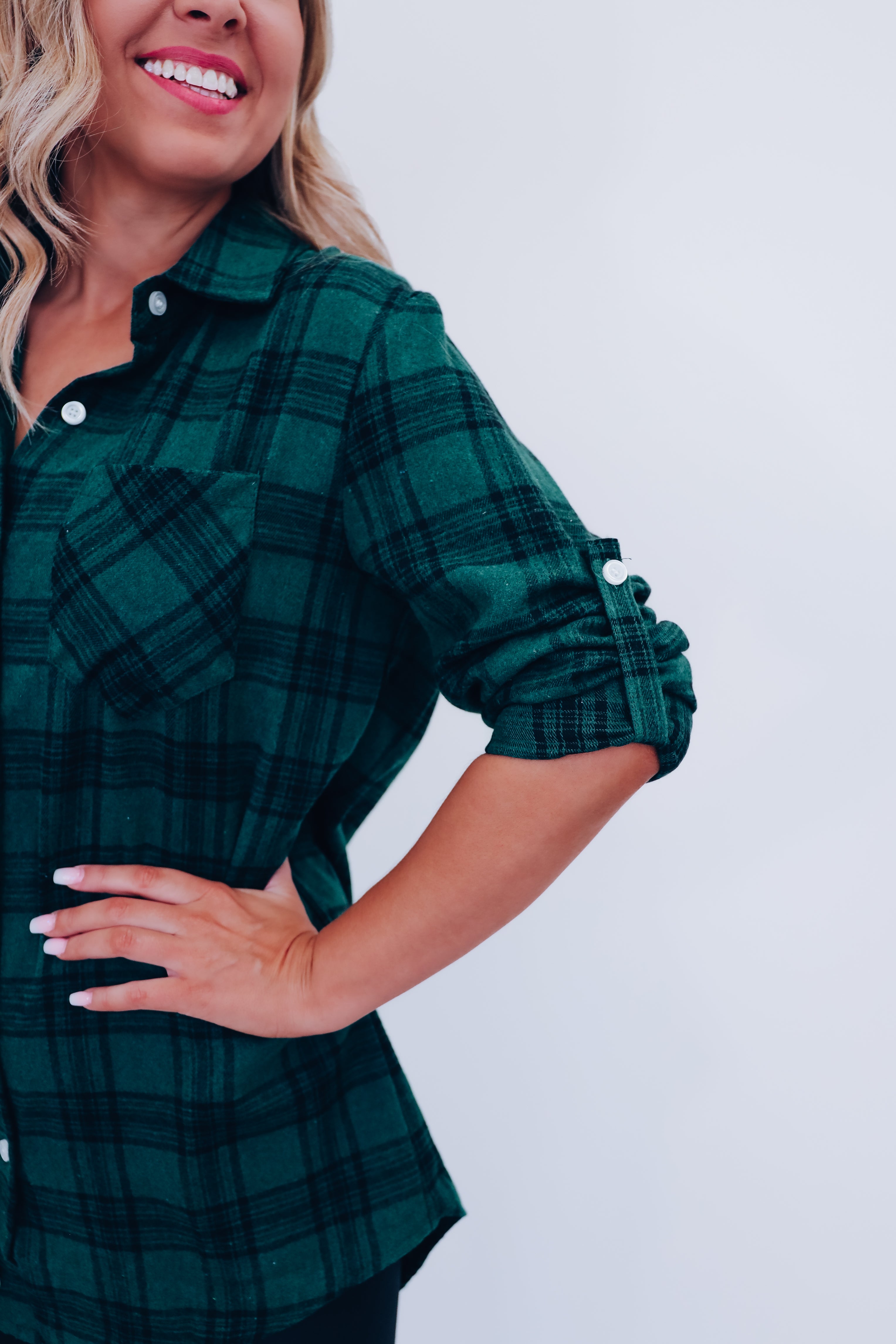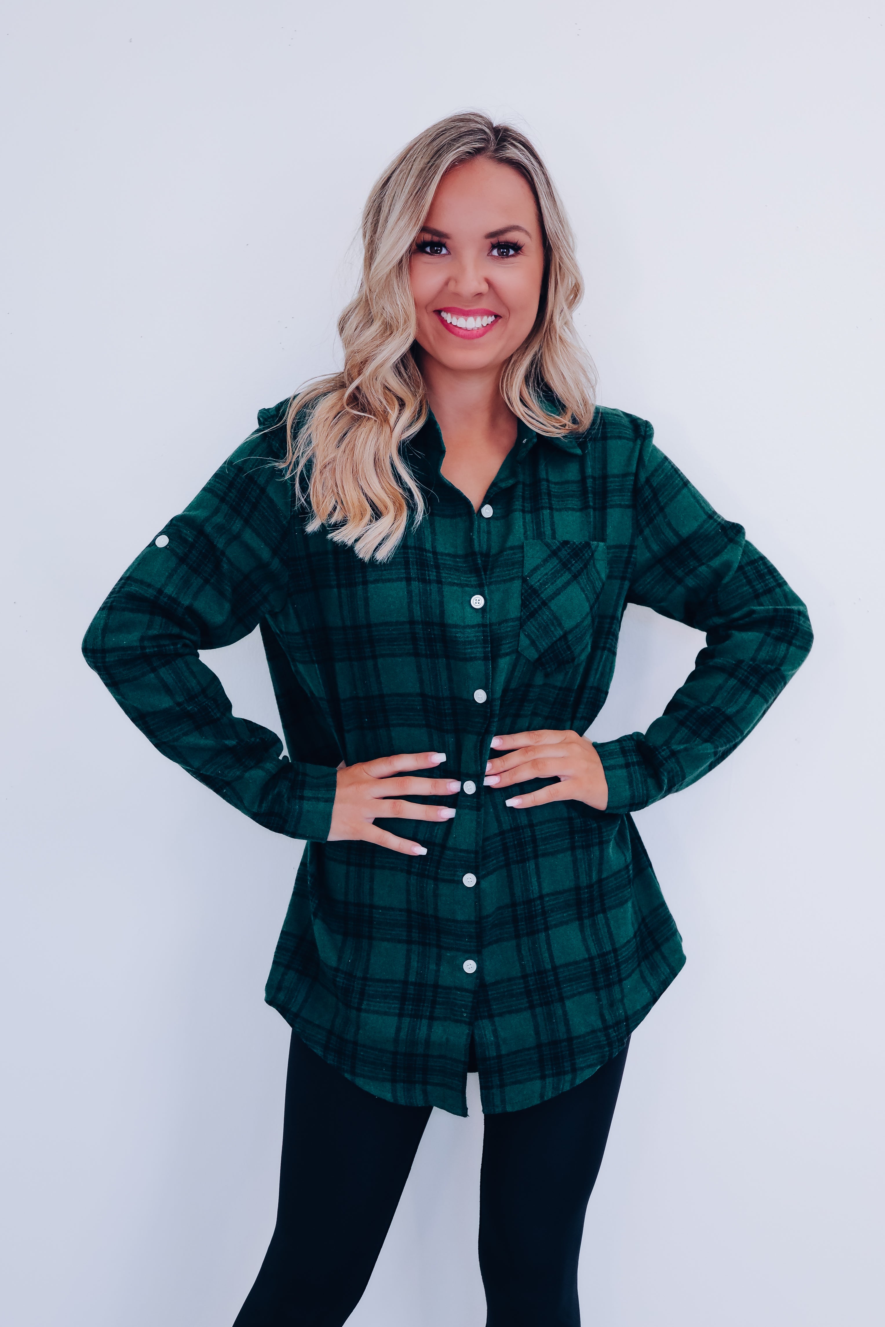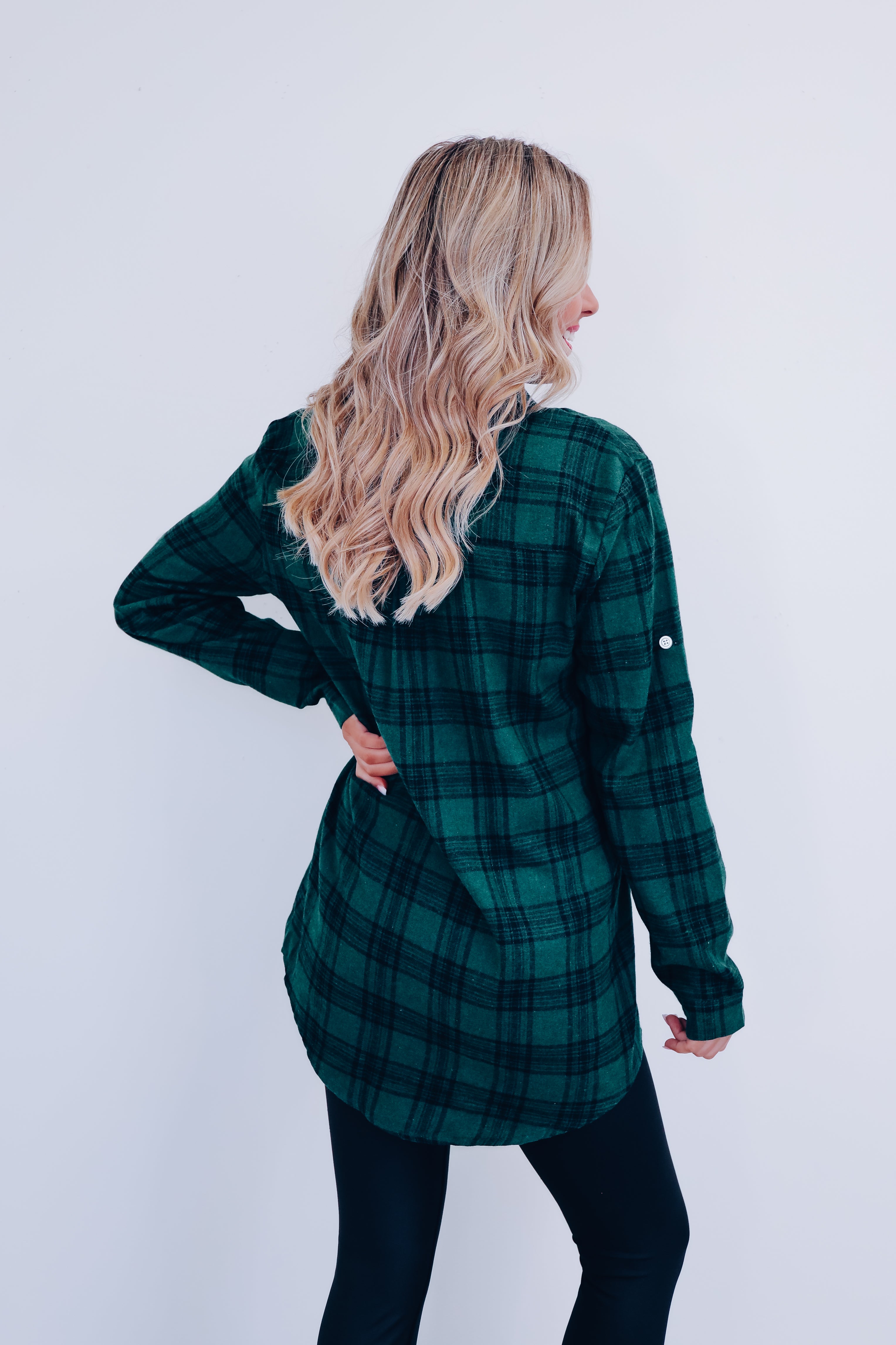 - Features a super soft plaid flannel fabric, a collared button down front, a drop shoulder, full length sleeve with button cuff and ability to be rolled up to 3/4 inch sleeve, a long length rounded hem, plus a front patch pocket.