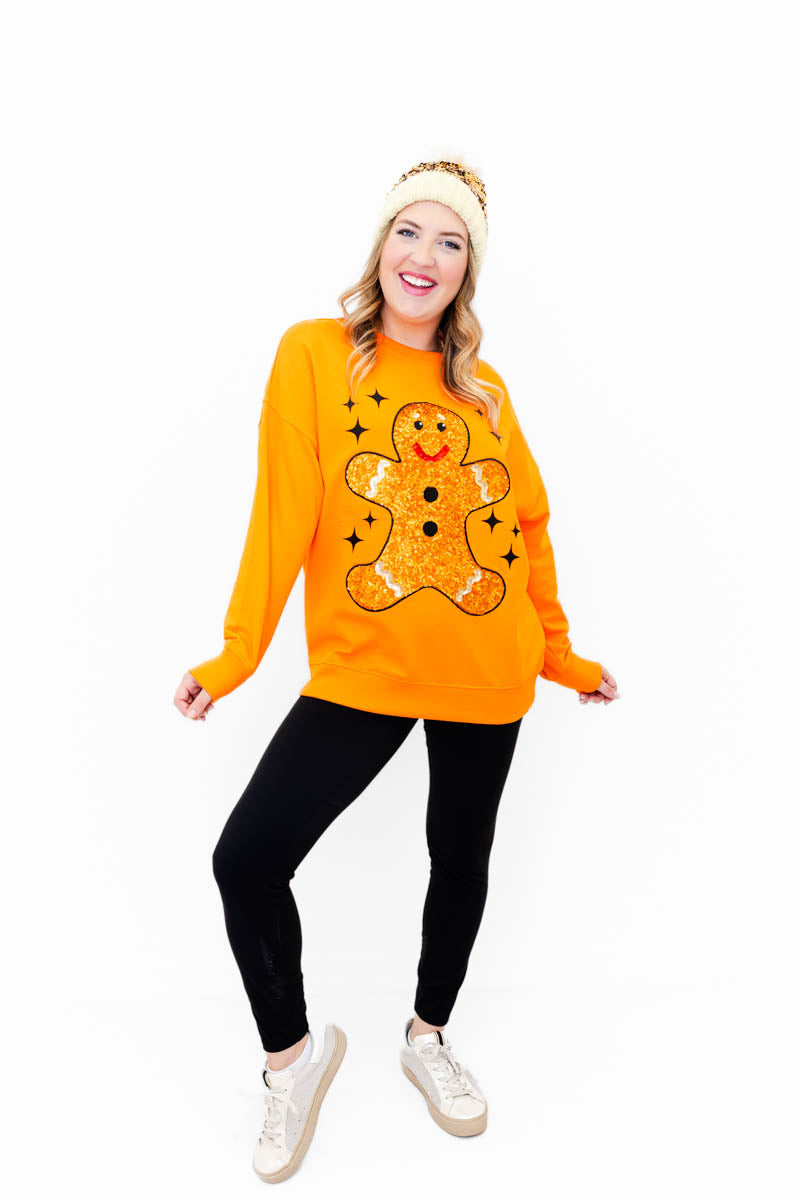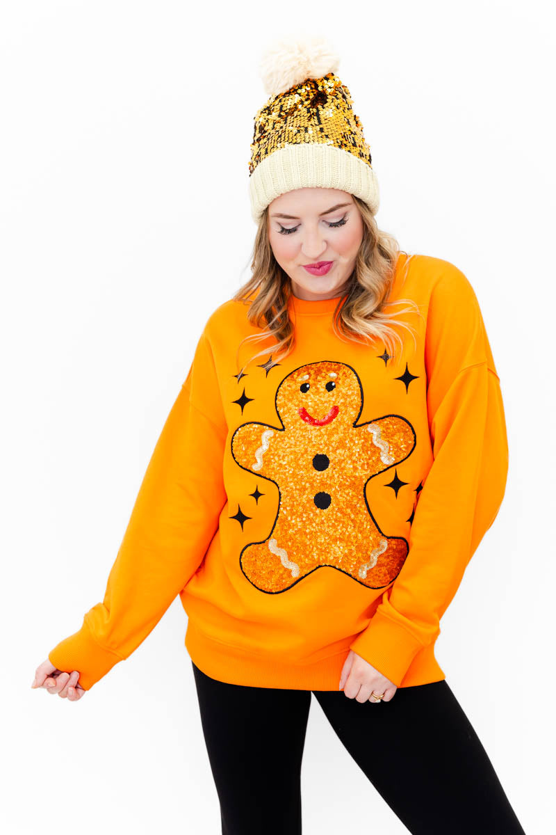 This bright and cozy pullover features an oversized sequin gingerbread design that’s as sweet as it gets! From cookie swaps to holiday parties, this statement piece brings all the festive sparkle and fun your season needs.