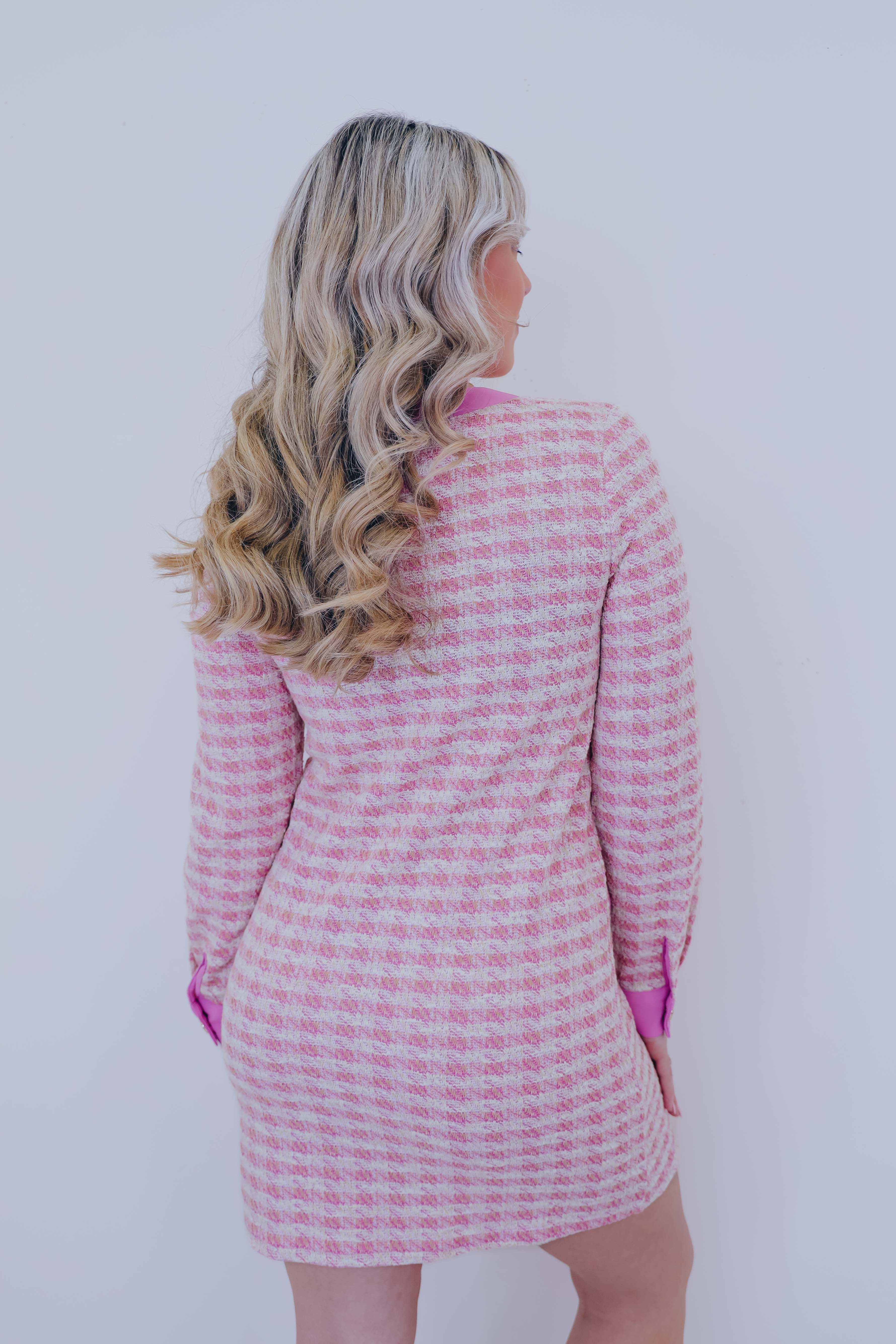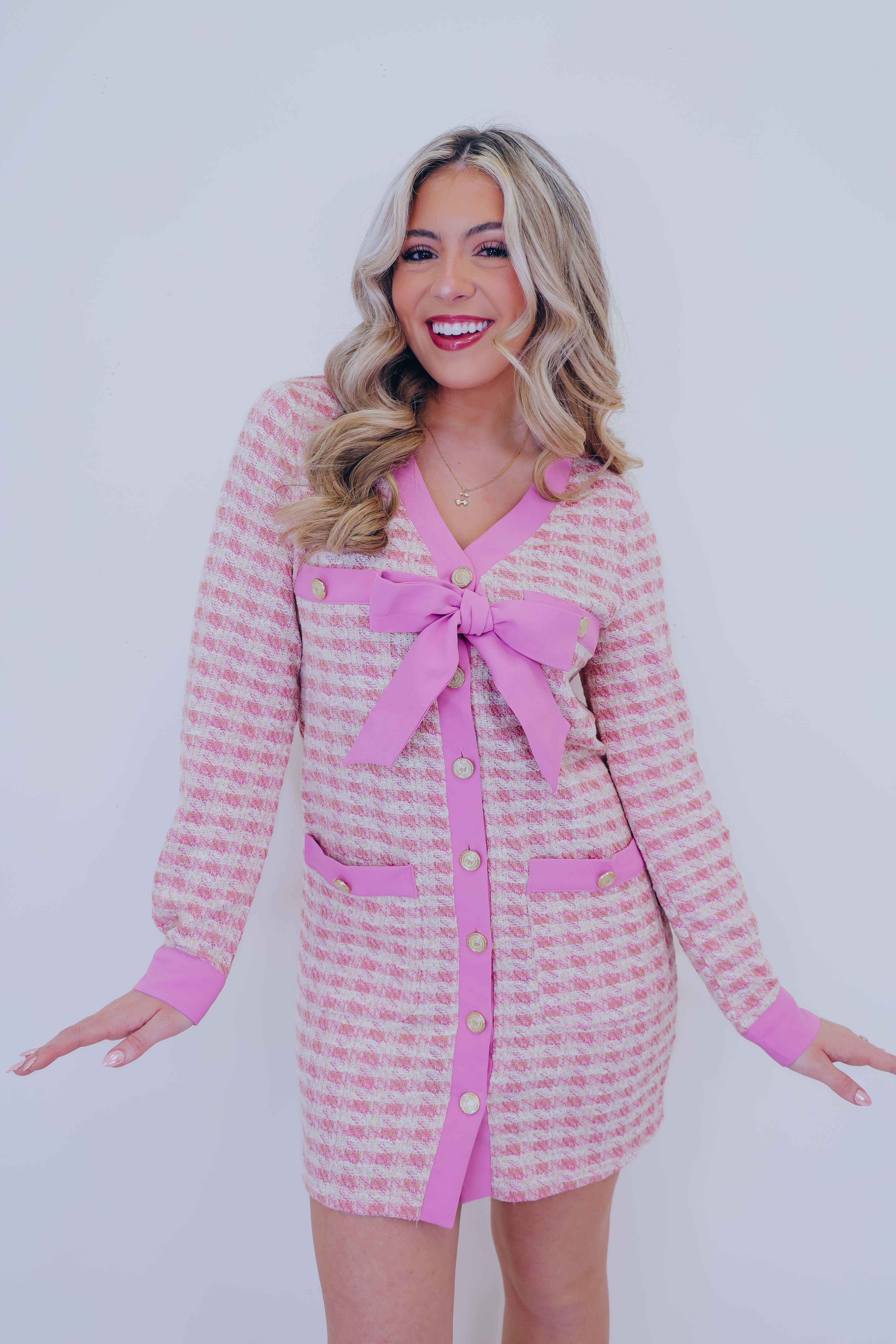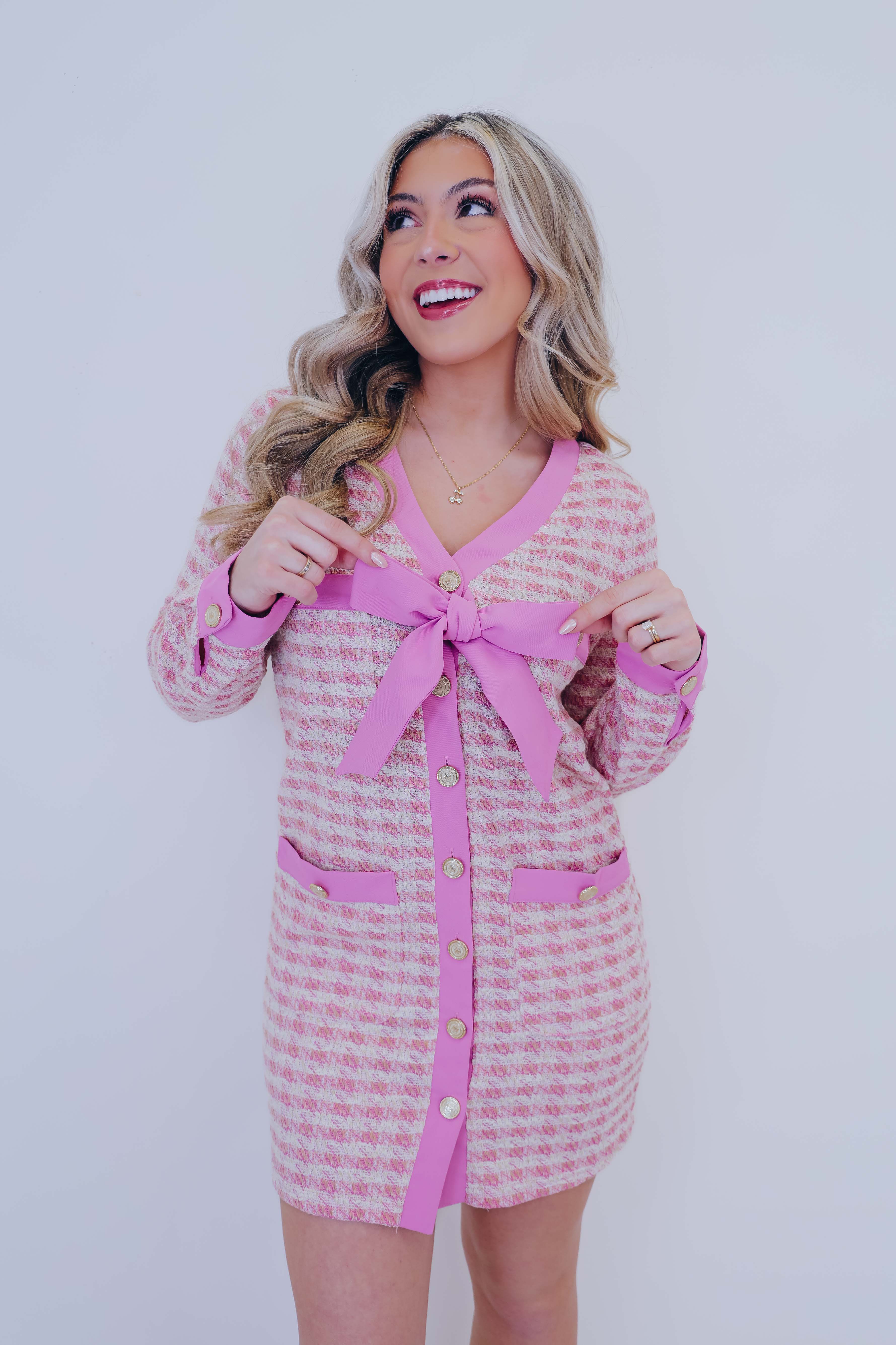 - Our Tessa Tweed Button Front Mini Dress is a super trendy option for a variety of events. This cutie is perfect for a Valentines date, a wedding shower, or for a 9-5 fancy fit.
