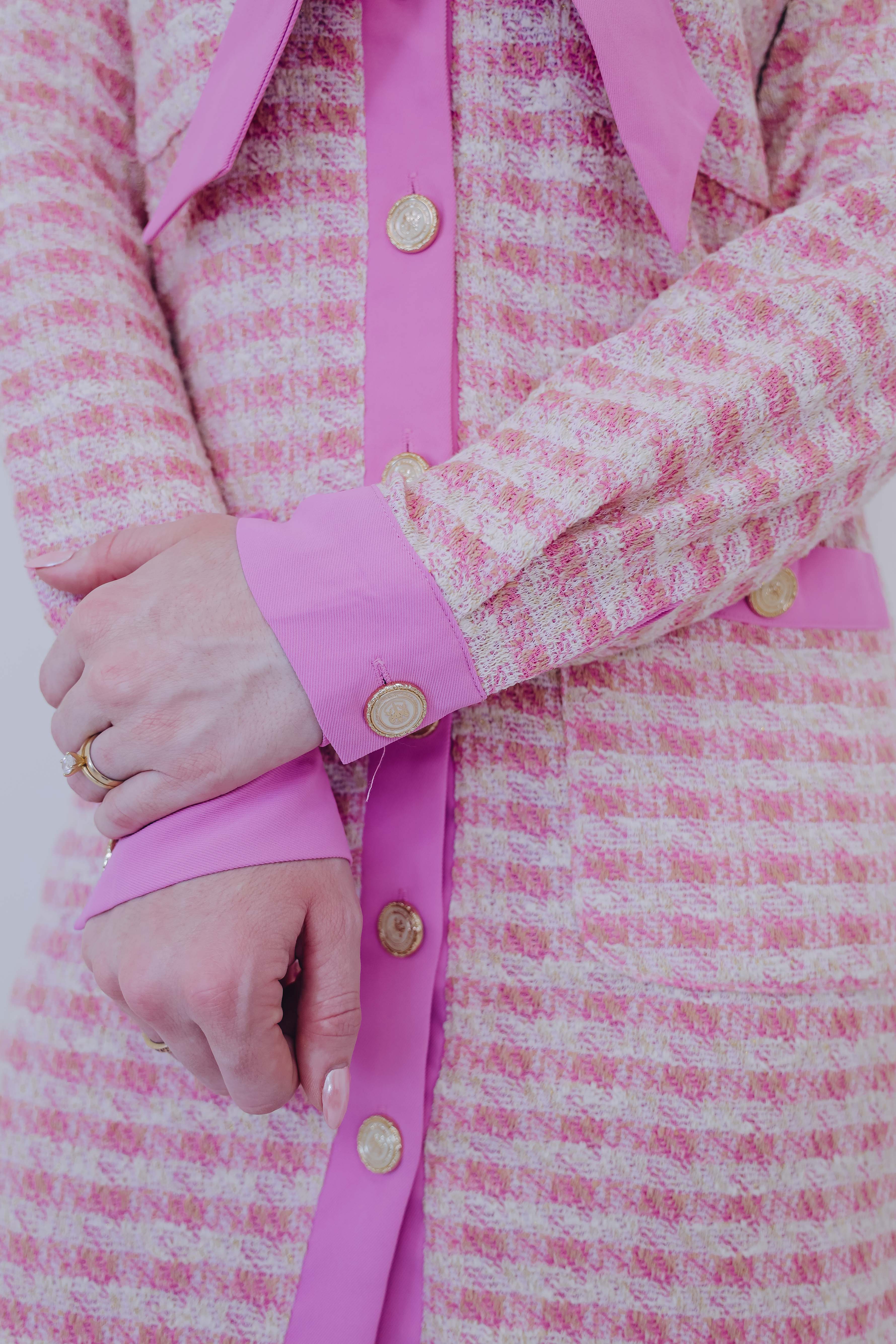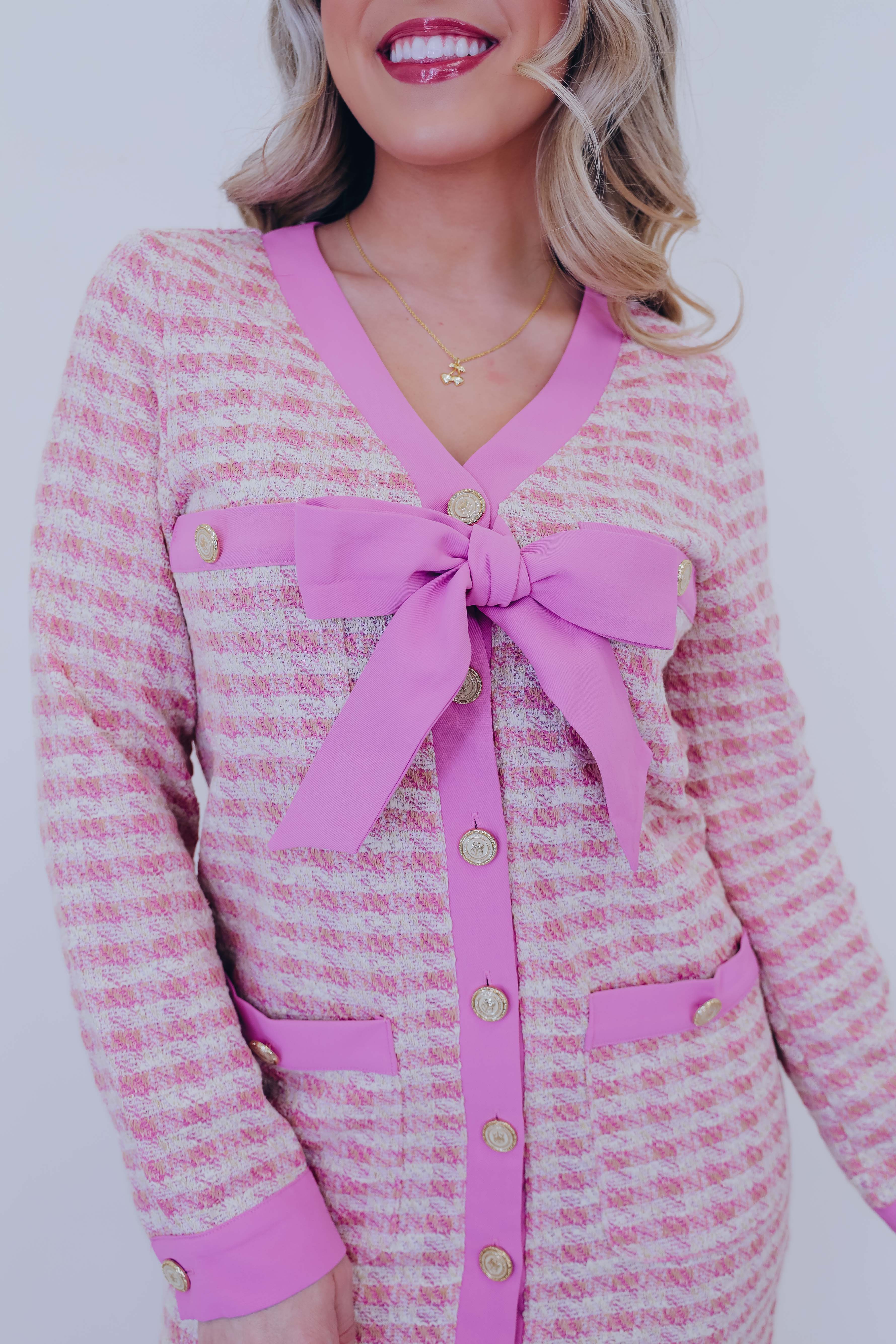 - Features a tweed plaid fabric, a V-neck, full length sleeves, button down front with contrasting trim, functioning button patch pockets, and a large self-tie bow embellishment at the base of the V-neck.