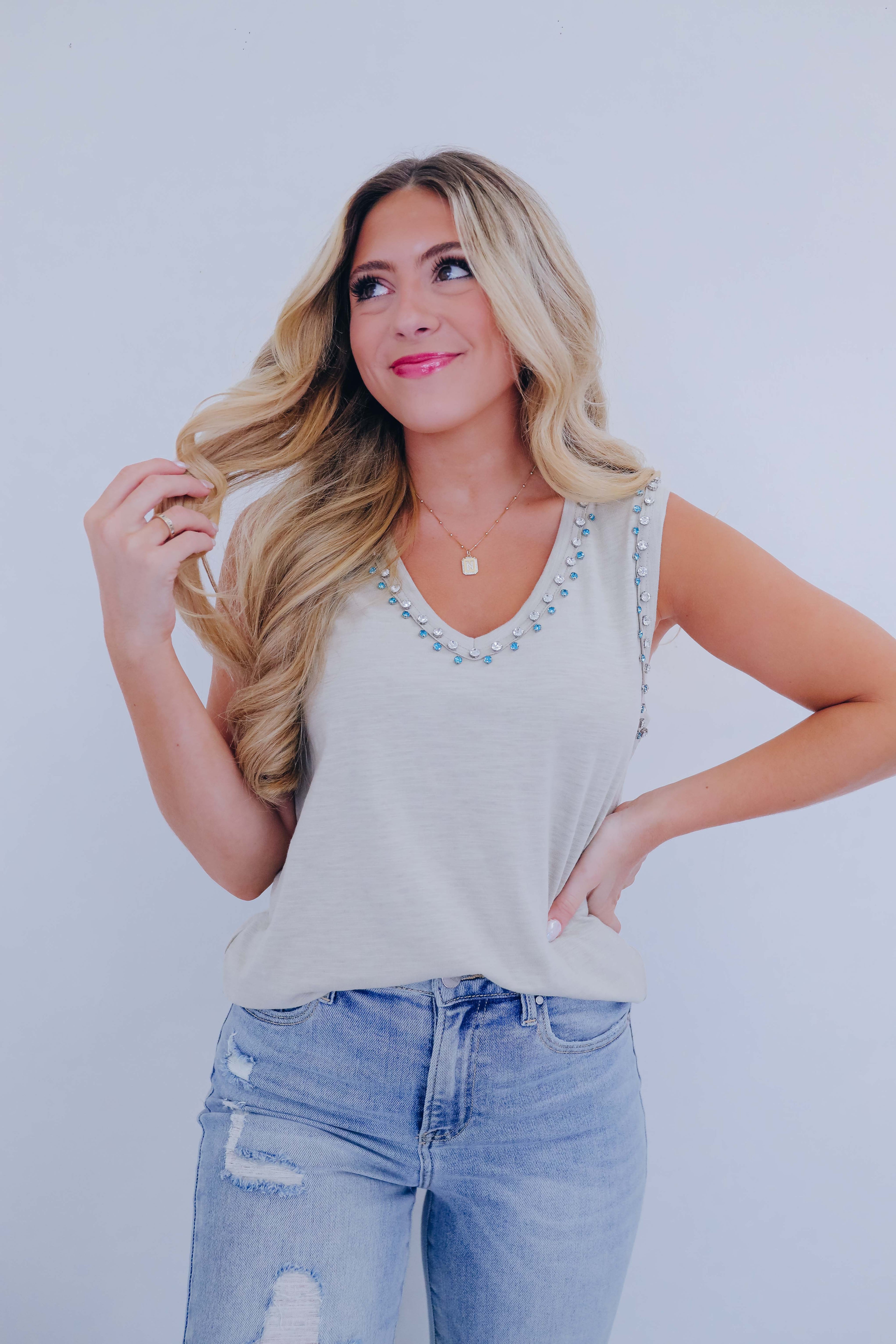 Featuring a soft lightweight textured fabric, a V-neck adorned with multi-size and color jewels, a sleeveless sillouhette, and a straight hem.