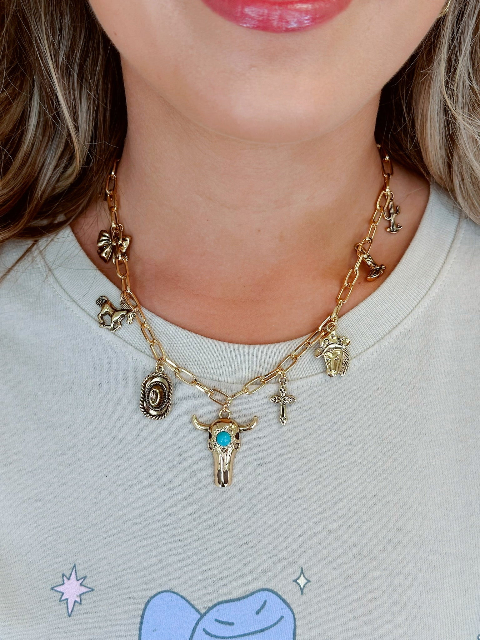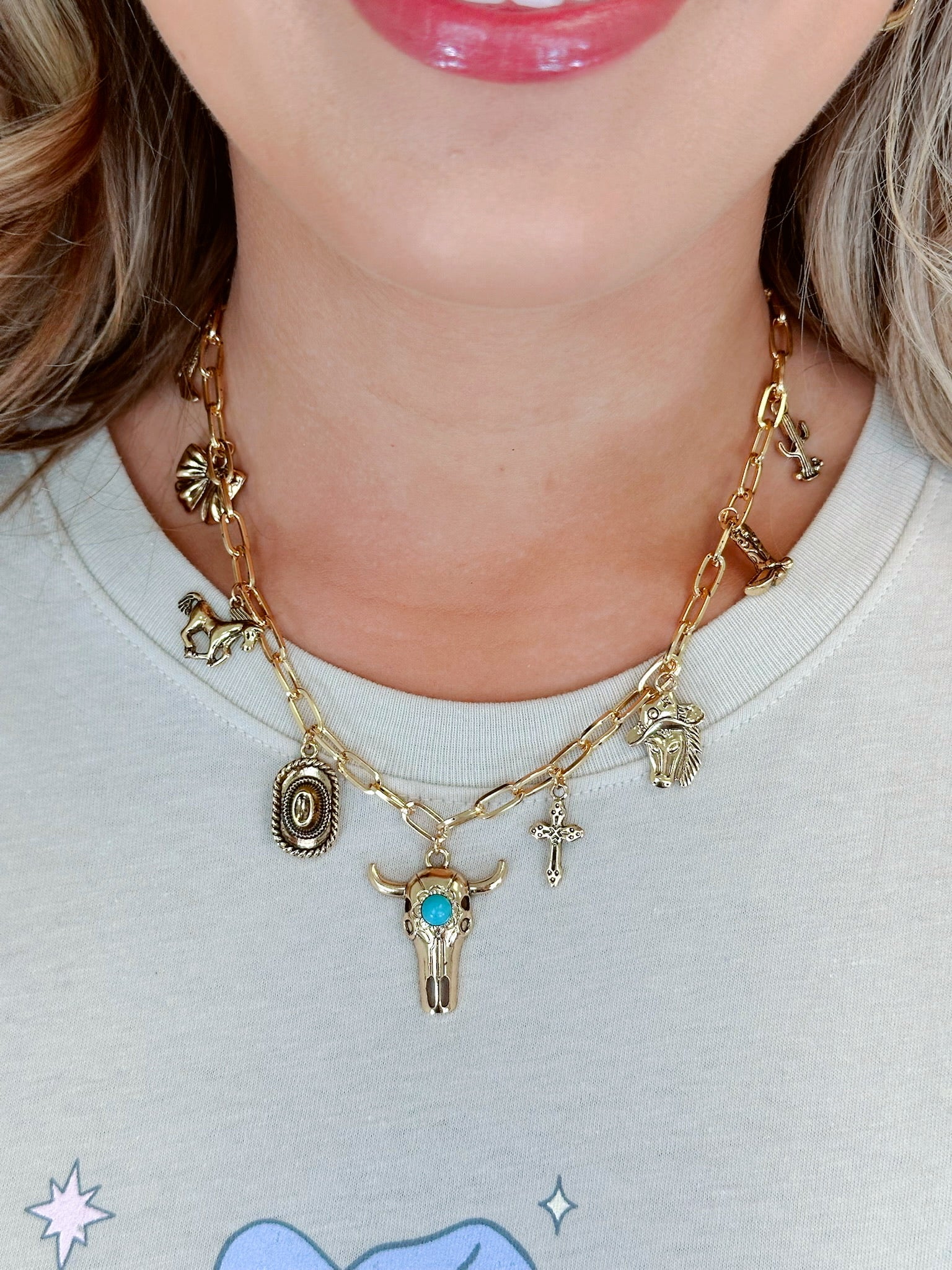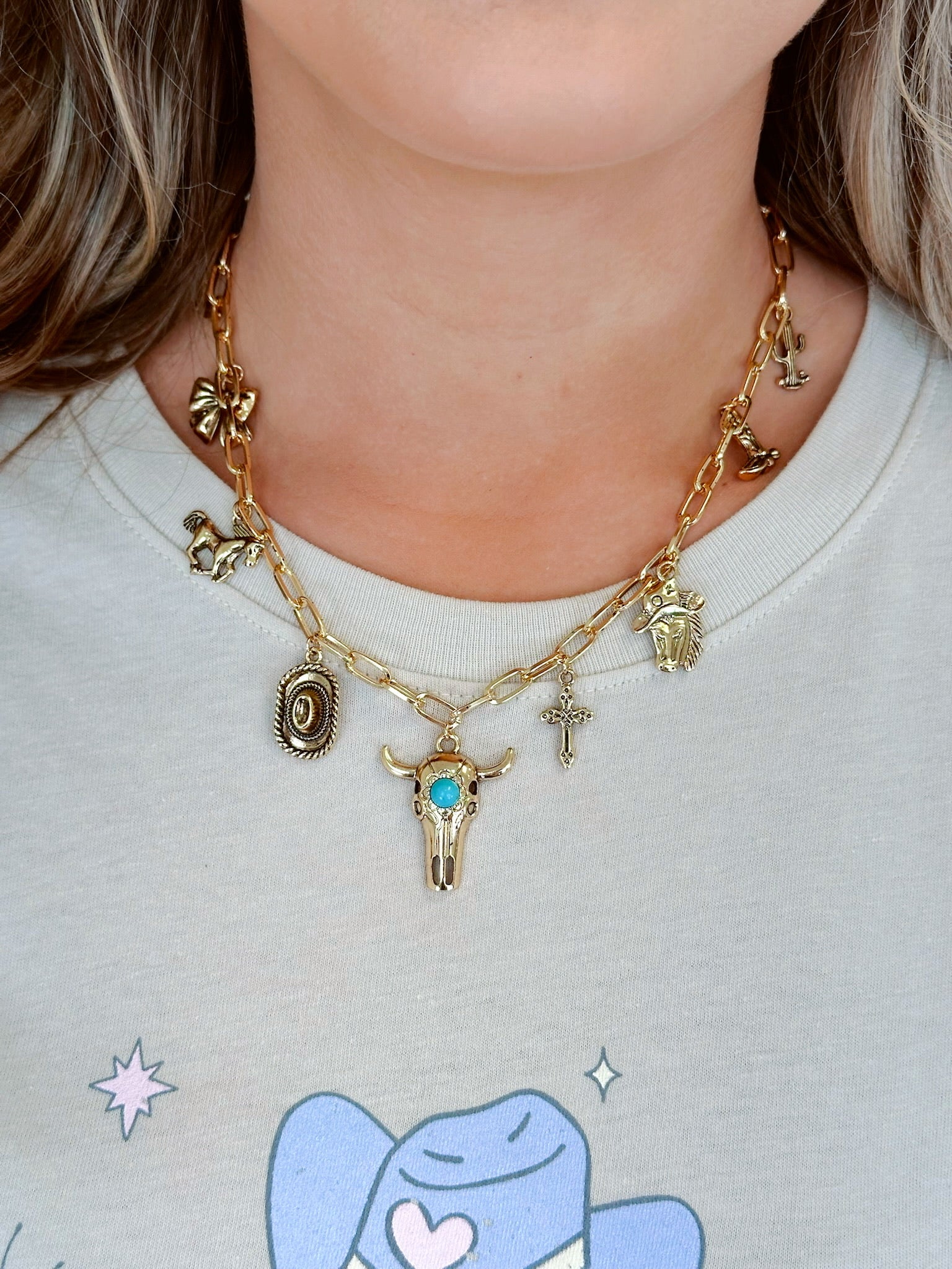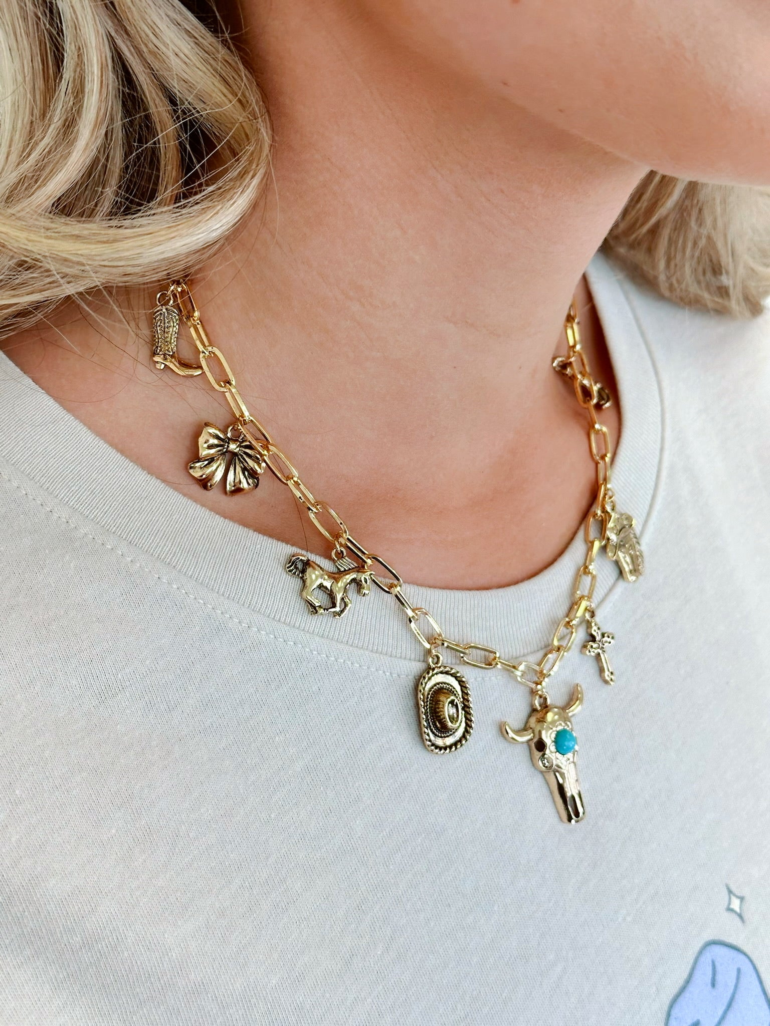 Where rustic grit meets charm-linked glam, our Rodeo Link Chain Charm Necklace brings the heart of the rodeo into your everyday style. Loaded with charms this link necklace includes, a bull head front and center with cowboy hats, horses, boots and bows to name a few.