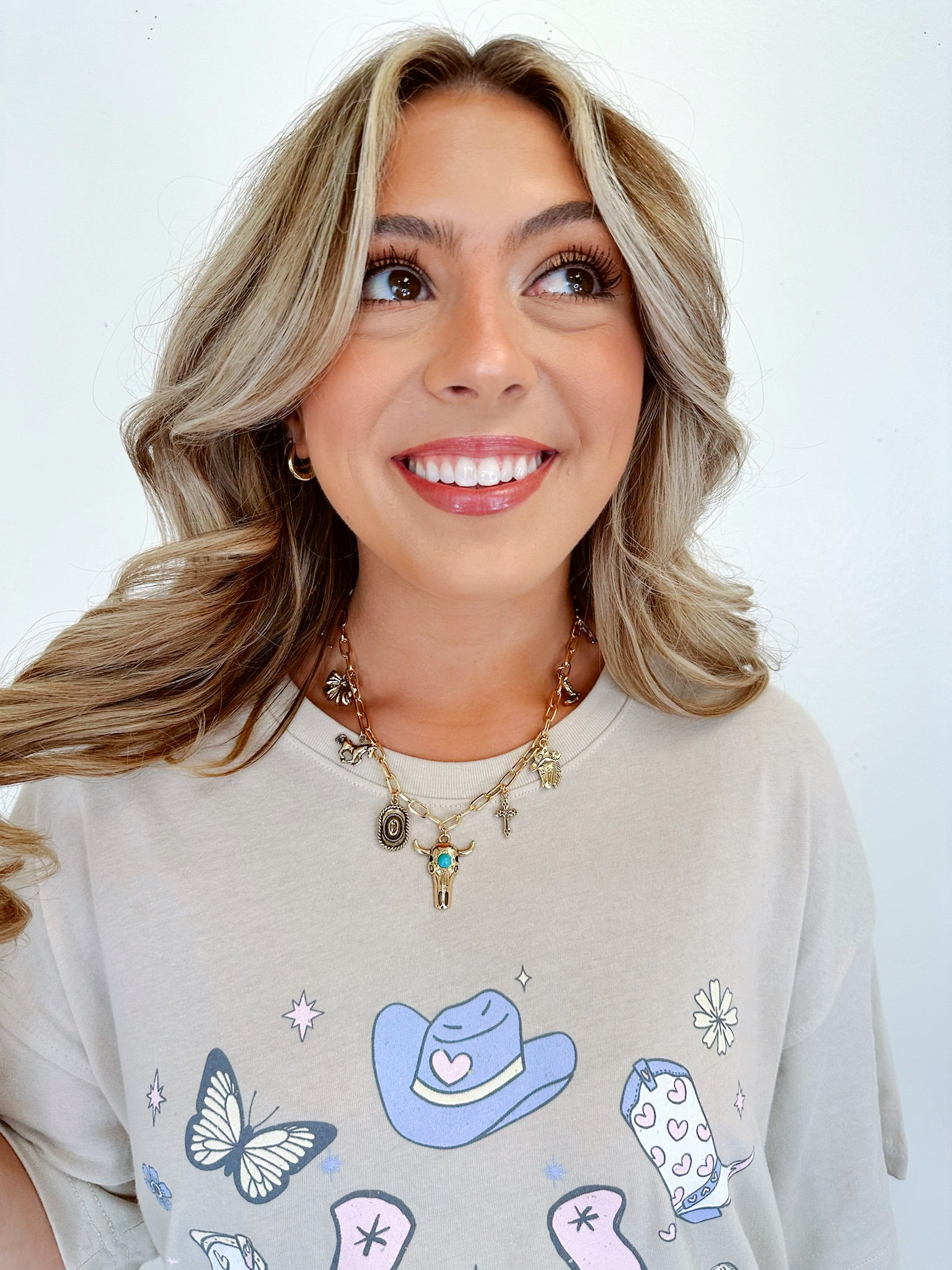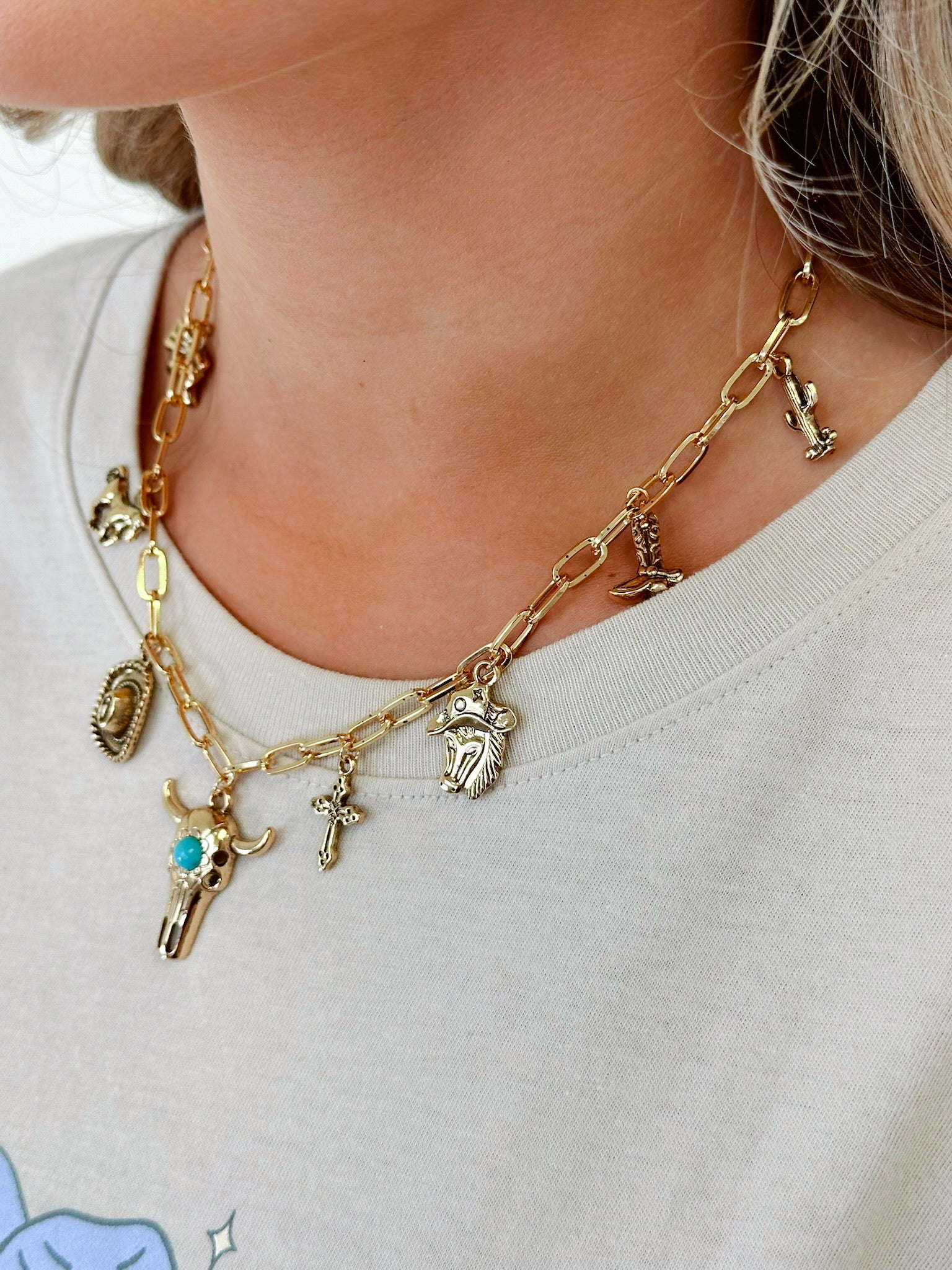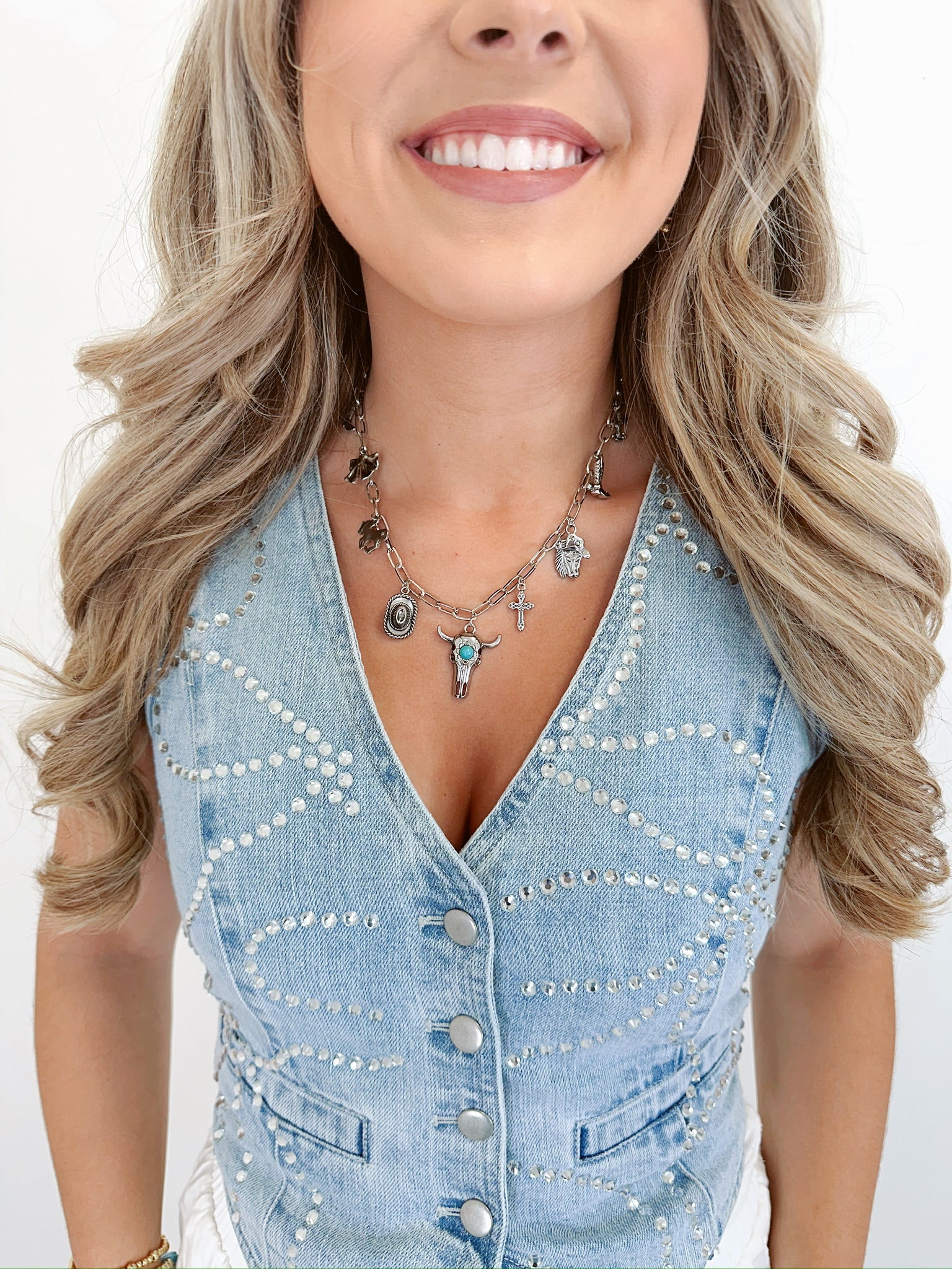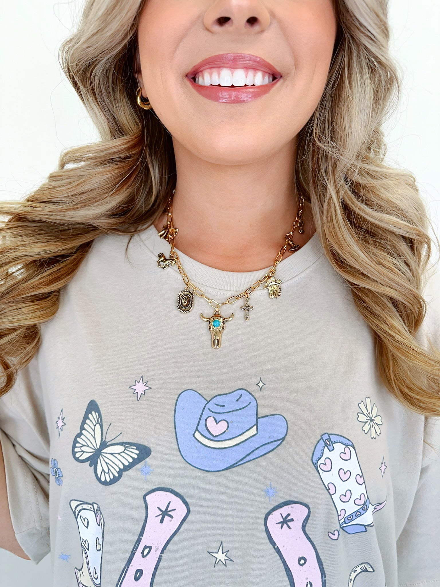 Where rustic grit meets charm-linked glam, our Rodeo Link Chain Charm Necklace brings the heart of the rodeo into your everyday style. Loaded with charms this link necklace includes, a bull head front and center with cowboy hats, horses, boots and bows to name a few.