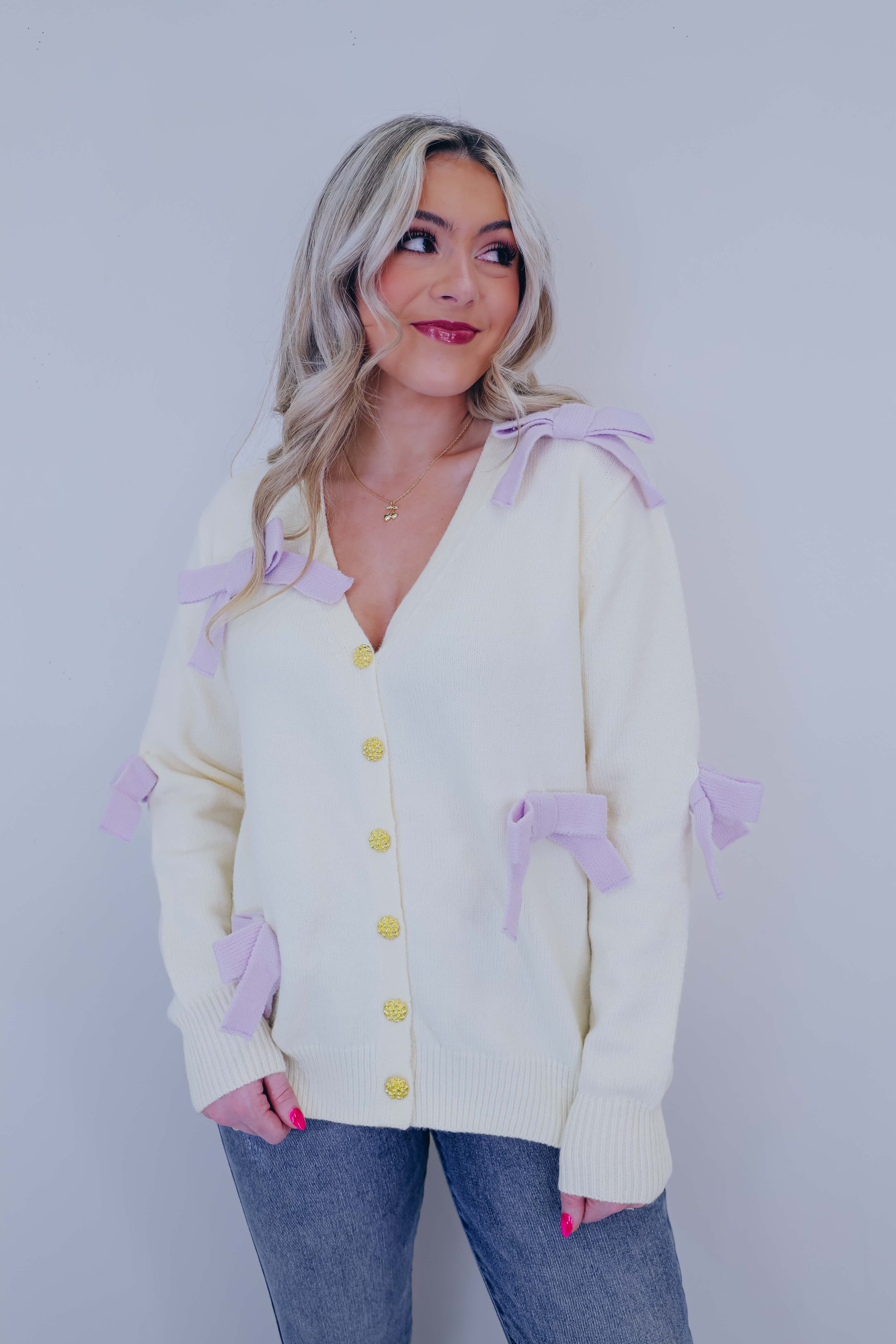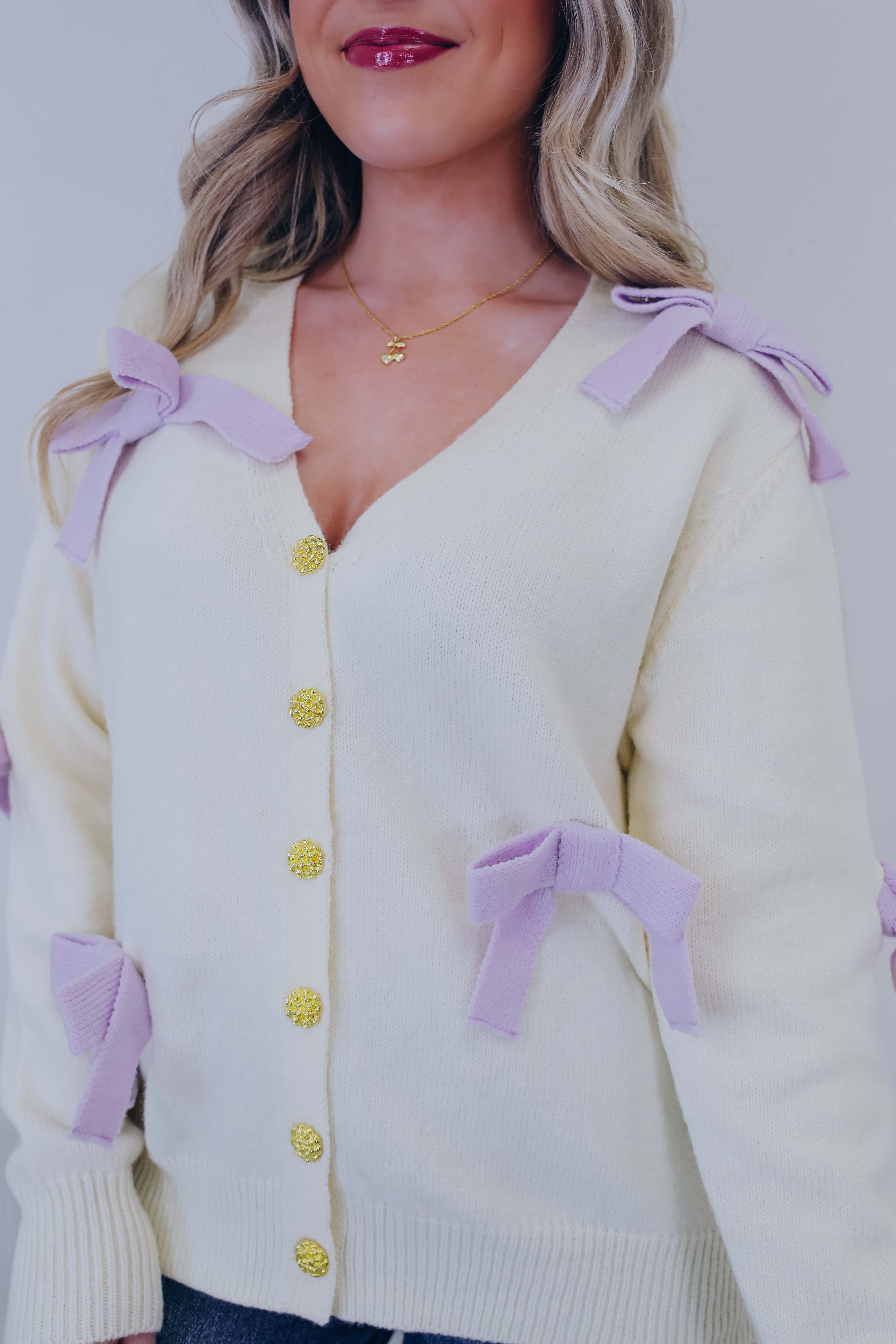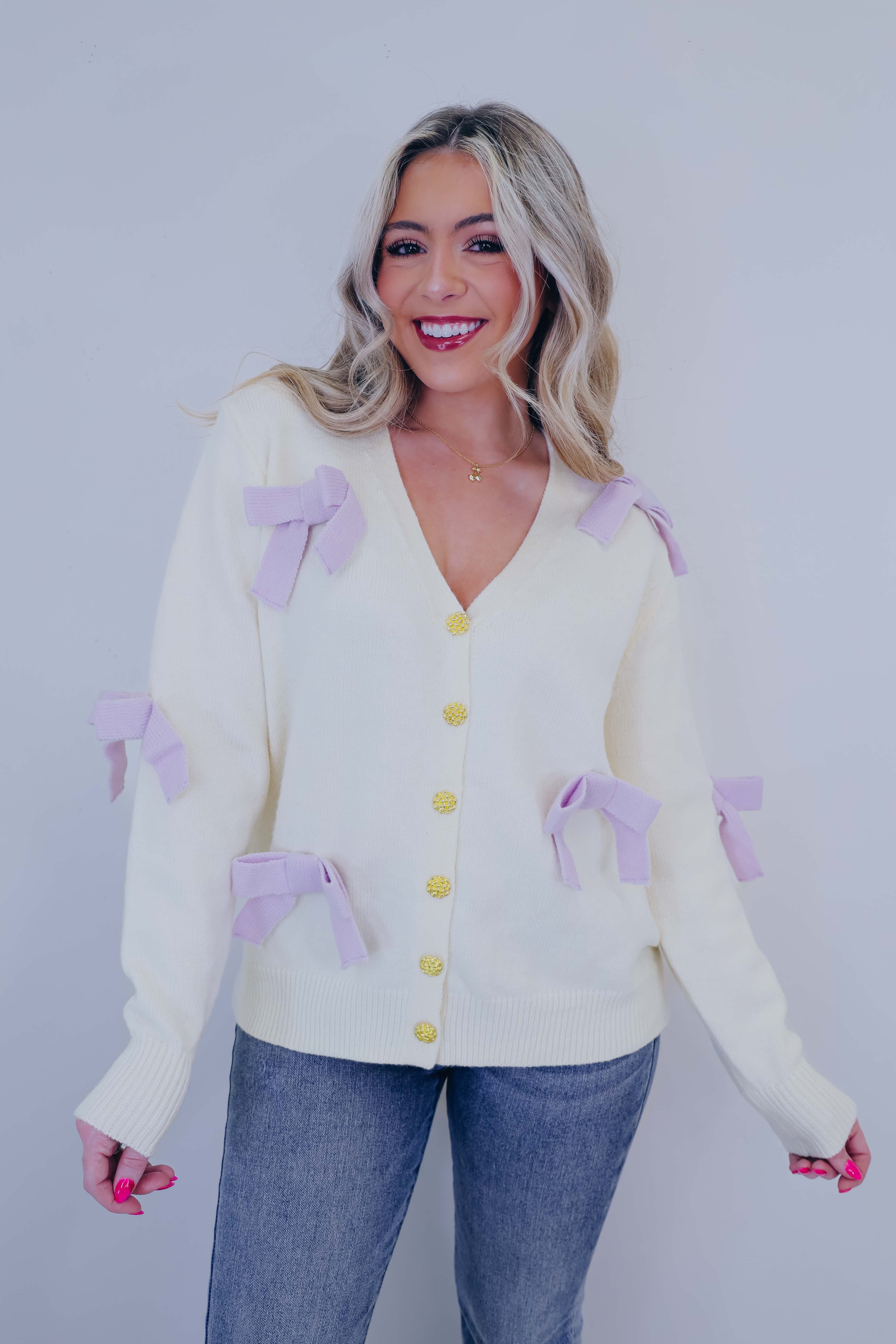 - Super girly and comfy our Sophia Bow Embellished Cardigan is going to be super easy to style with denim jeans, a mini skirt or slacks for a variety of fun feminine looks.
