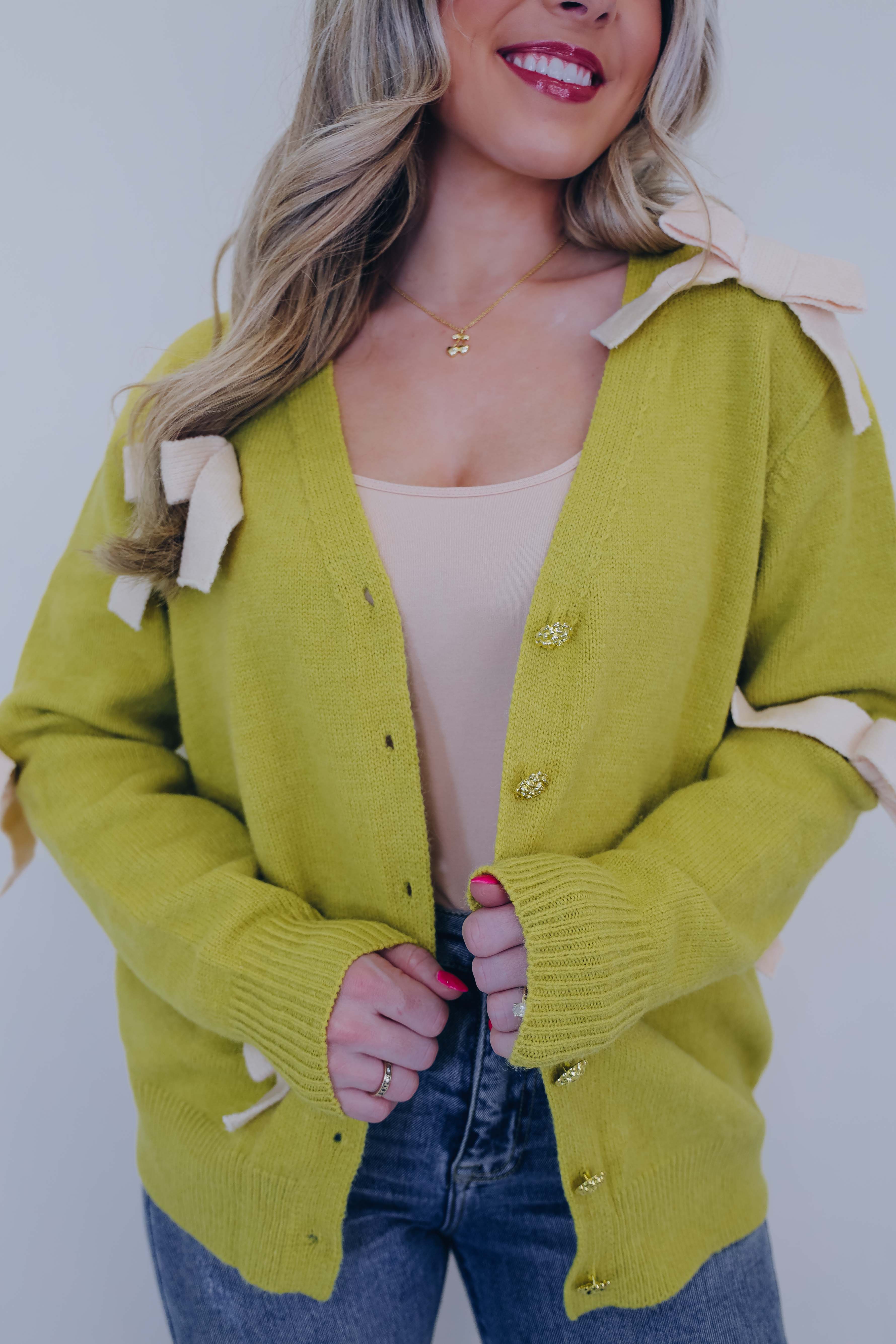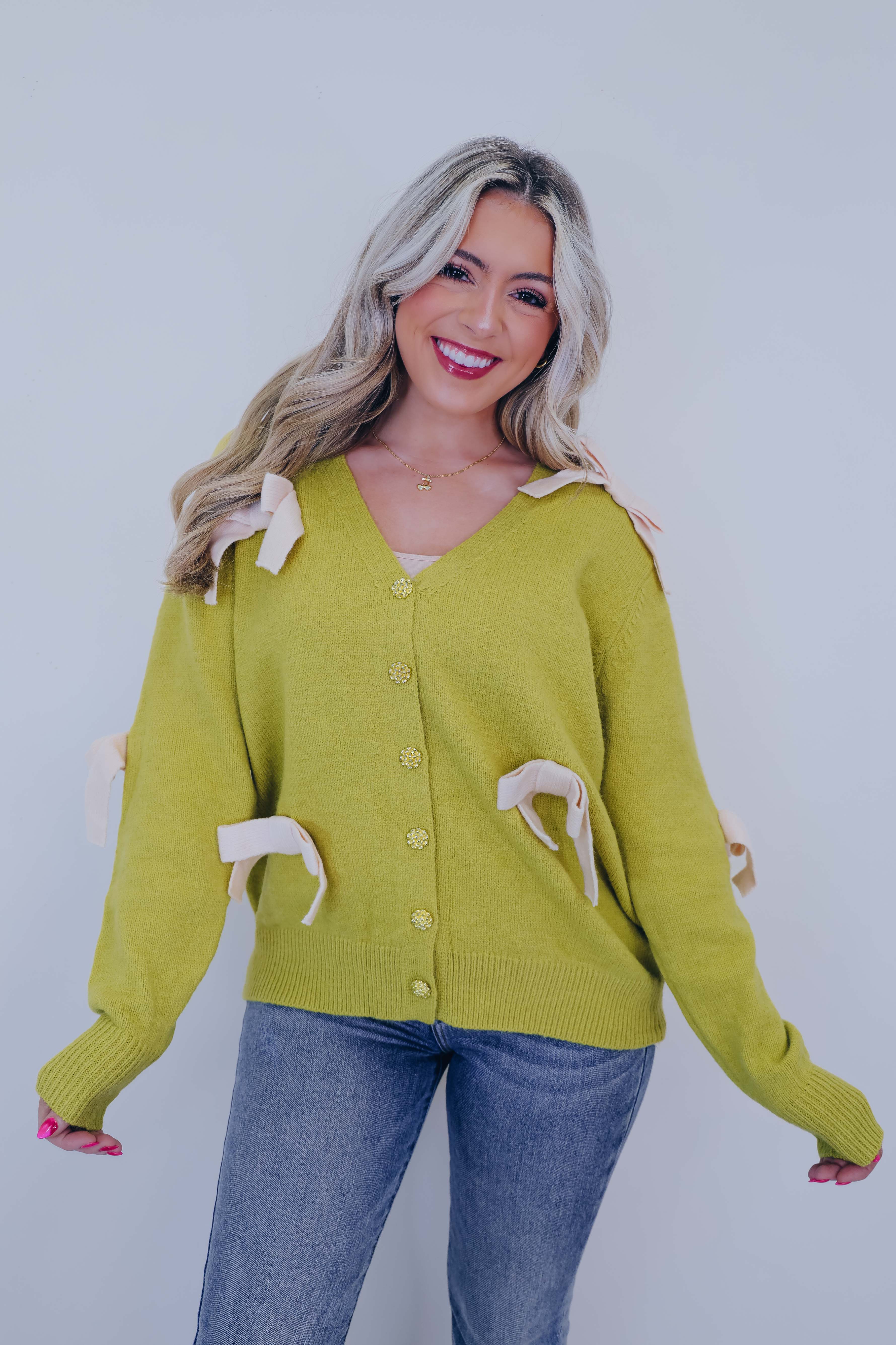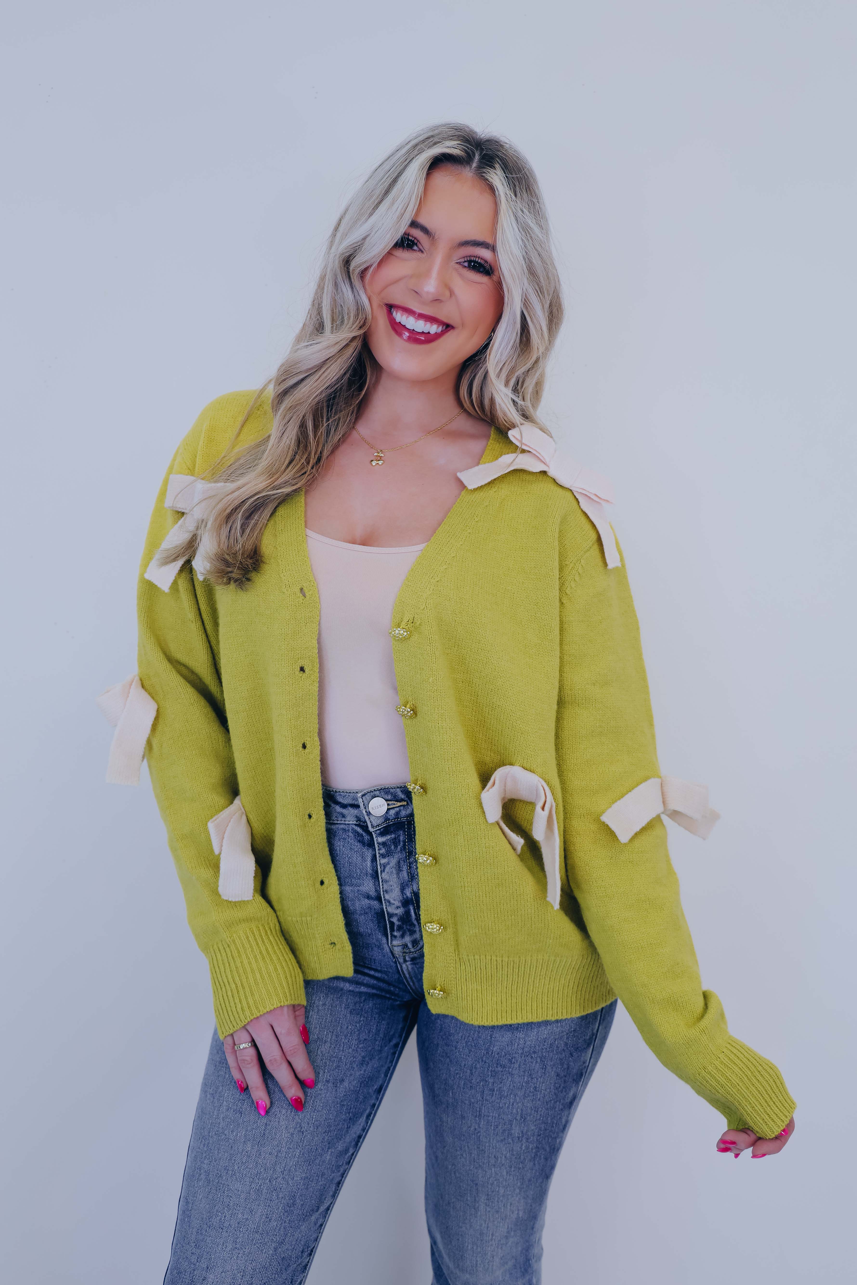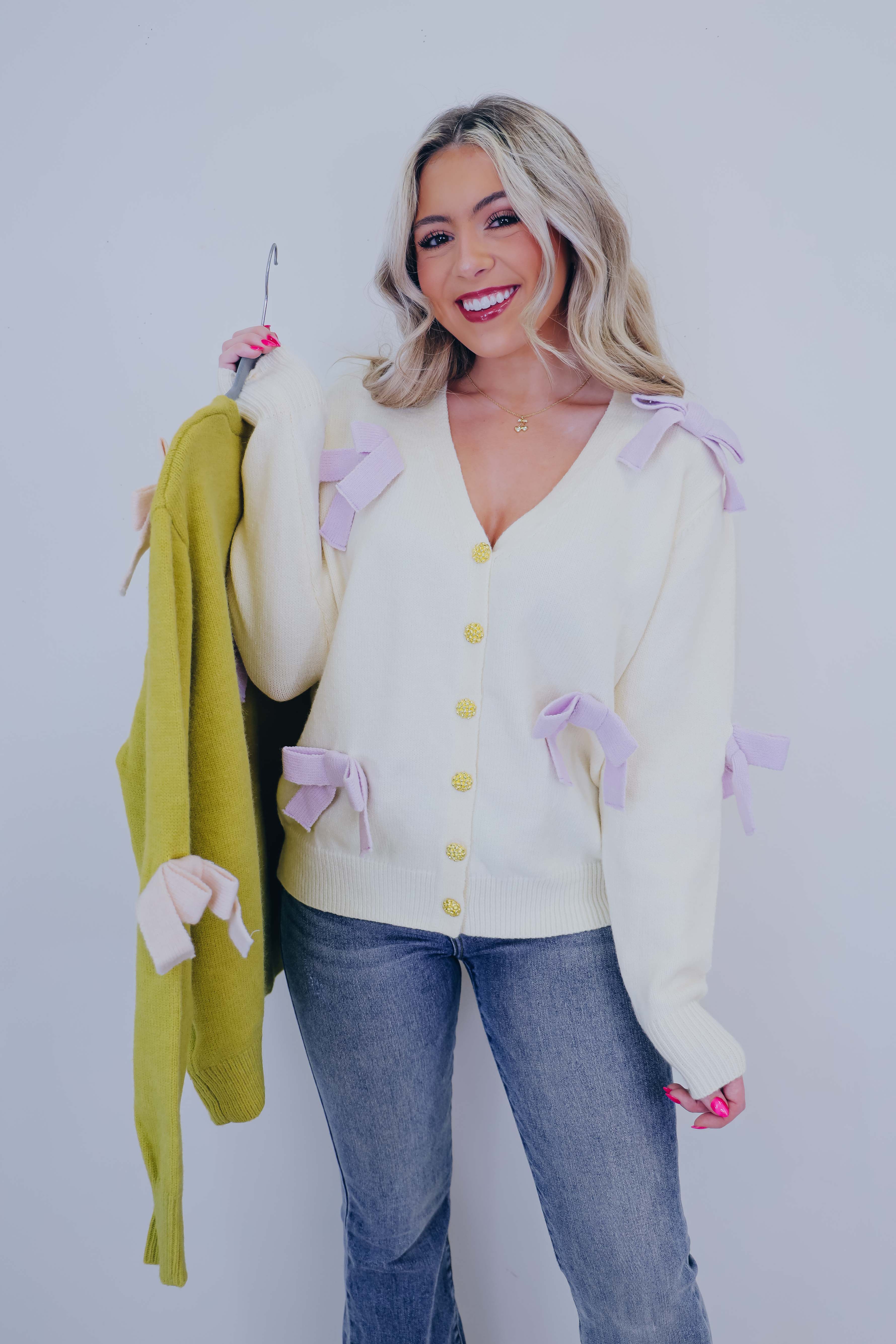- Super girly and comfy our Sophia Bow Embellished Cardigan is going to be super easy to style with denim jeans, a mini skirt or slacks for a variety of fun feminine looks.