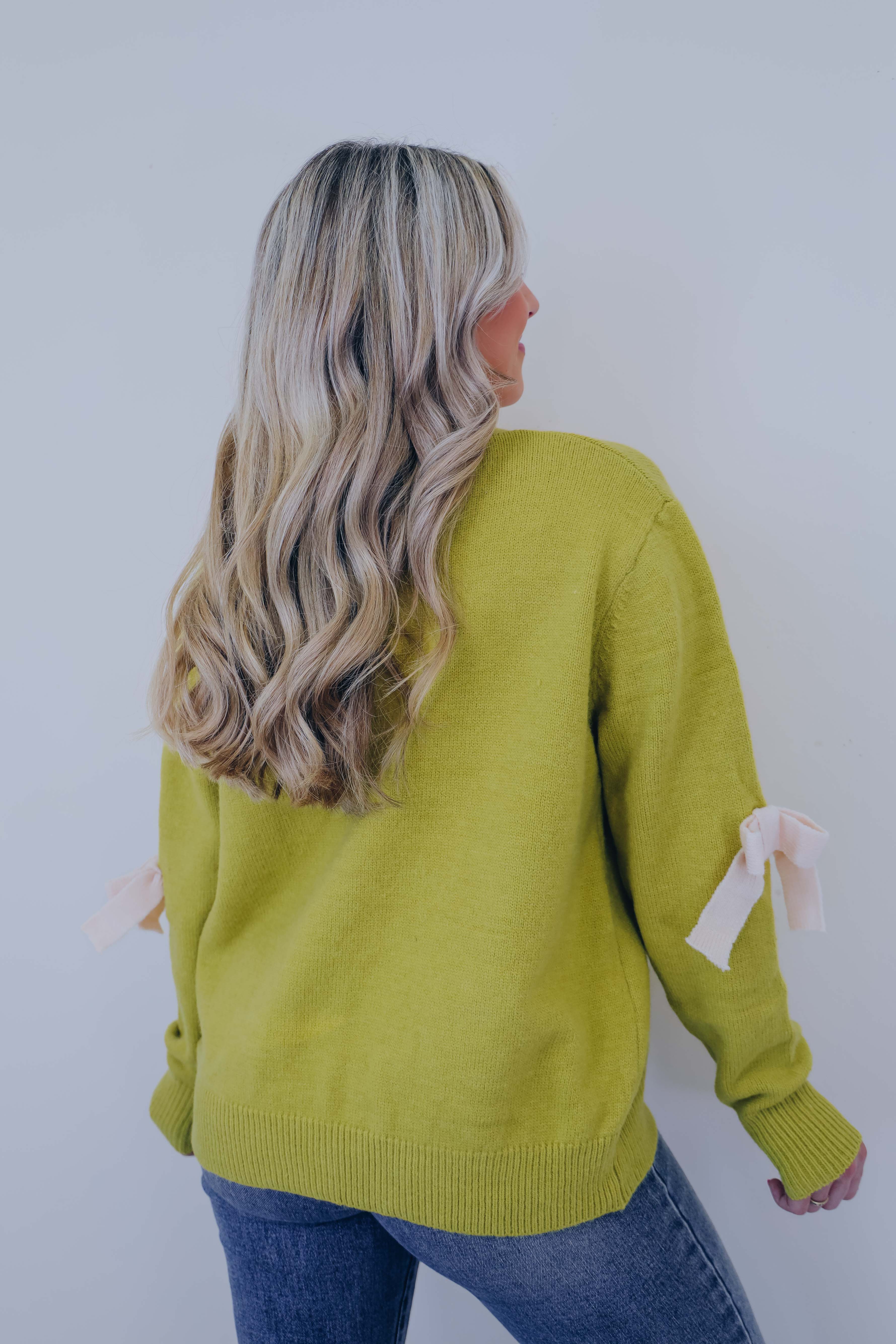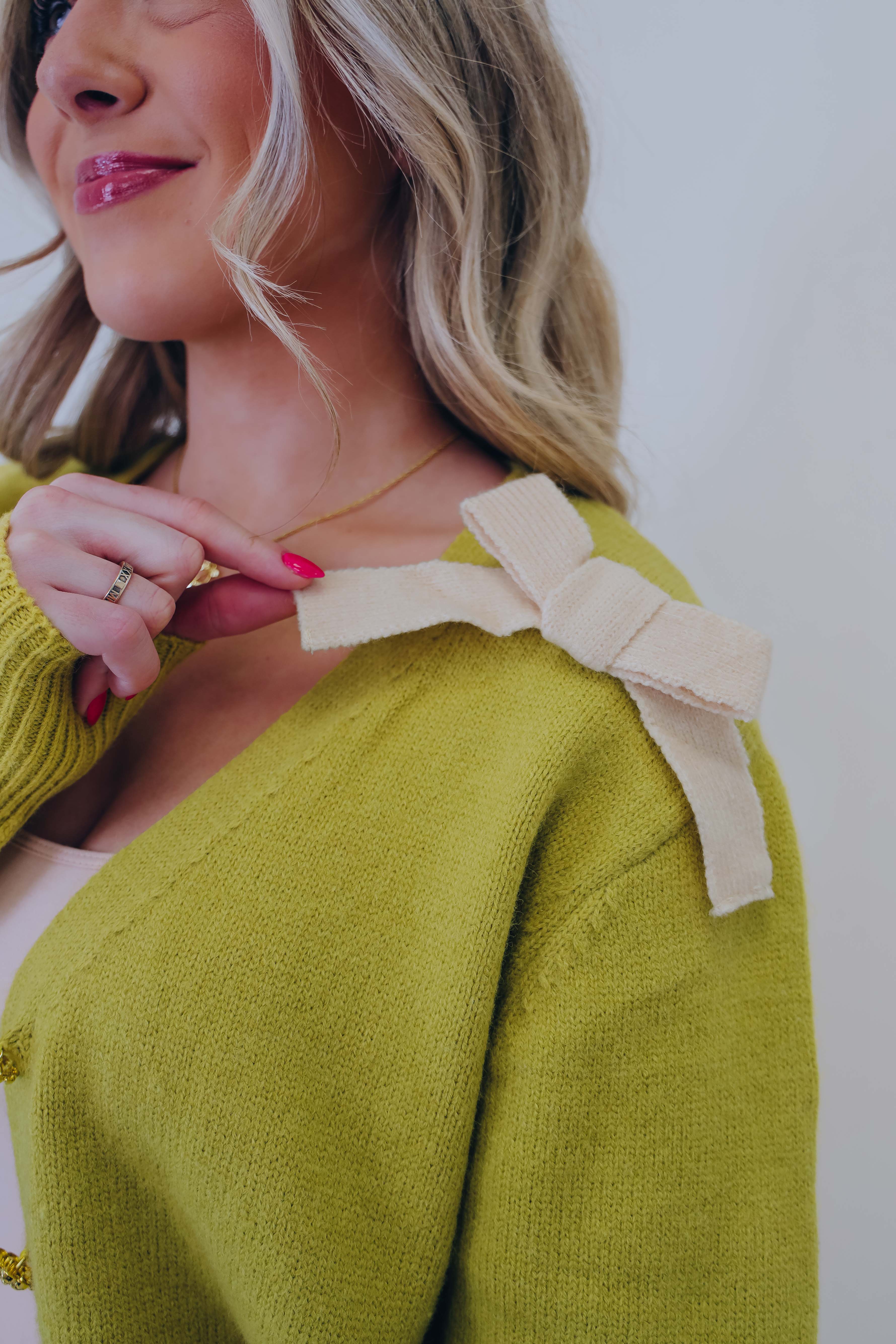 - Features a super soft knit fabric, a drop shoulder full length sleeve with a ribbed cuff, a V-neck, a front button closure, adorned with large knit bows on the front, and a straight hem.