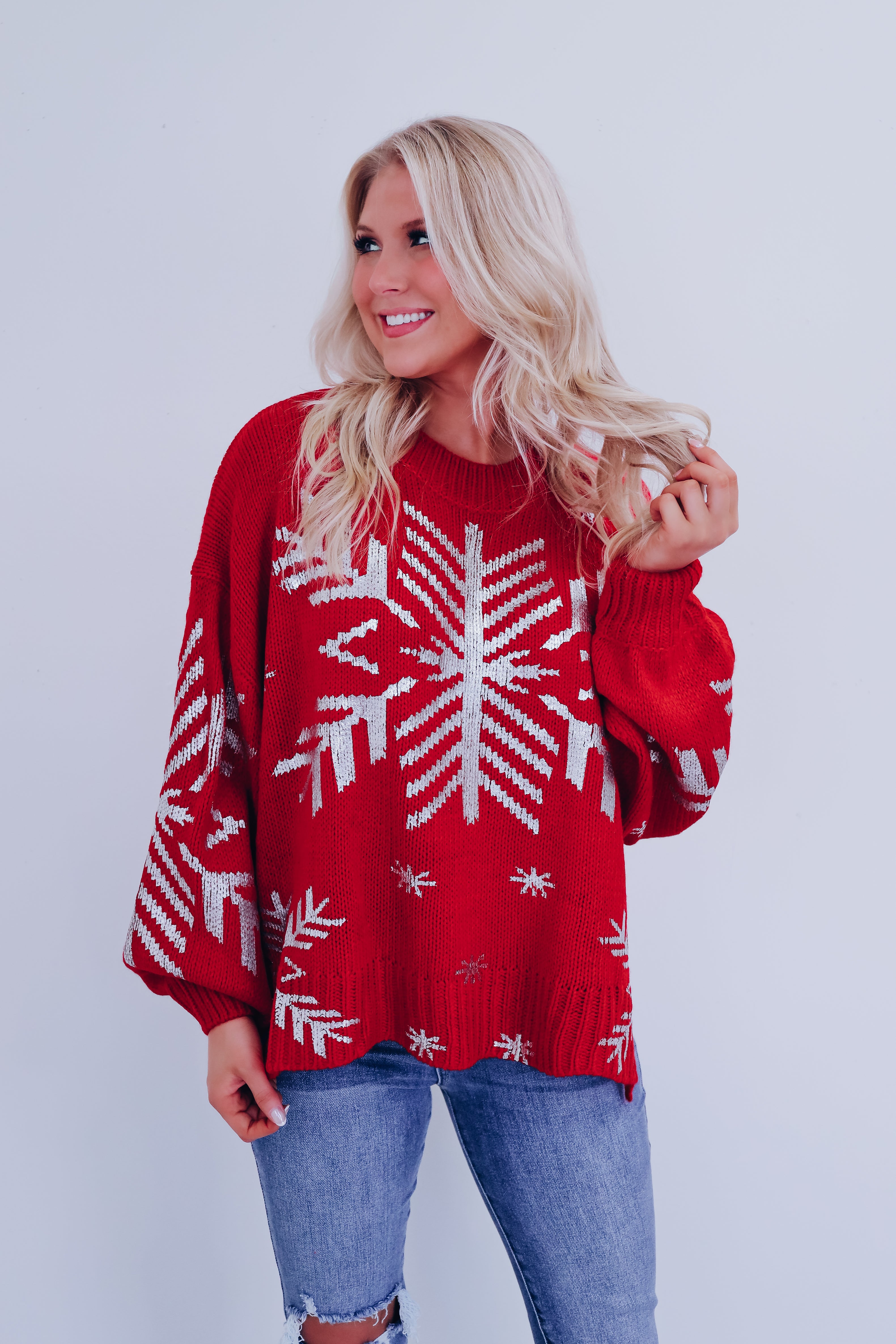 - Features an ultra-soft red knit fabric adorned with large silver snowflakes, crew neck, full length ribbed cuff sleeve, with and a high low side slit hem.