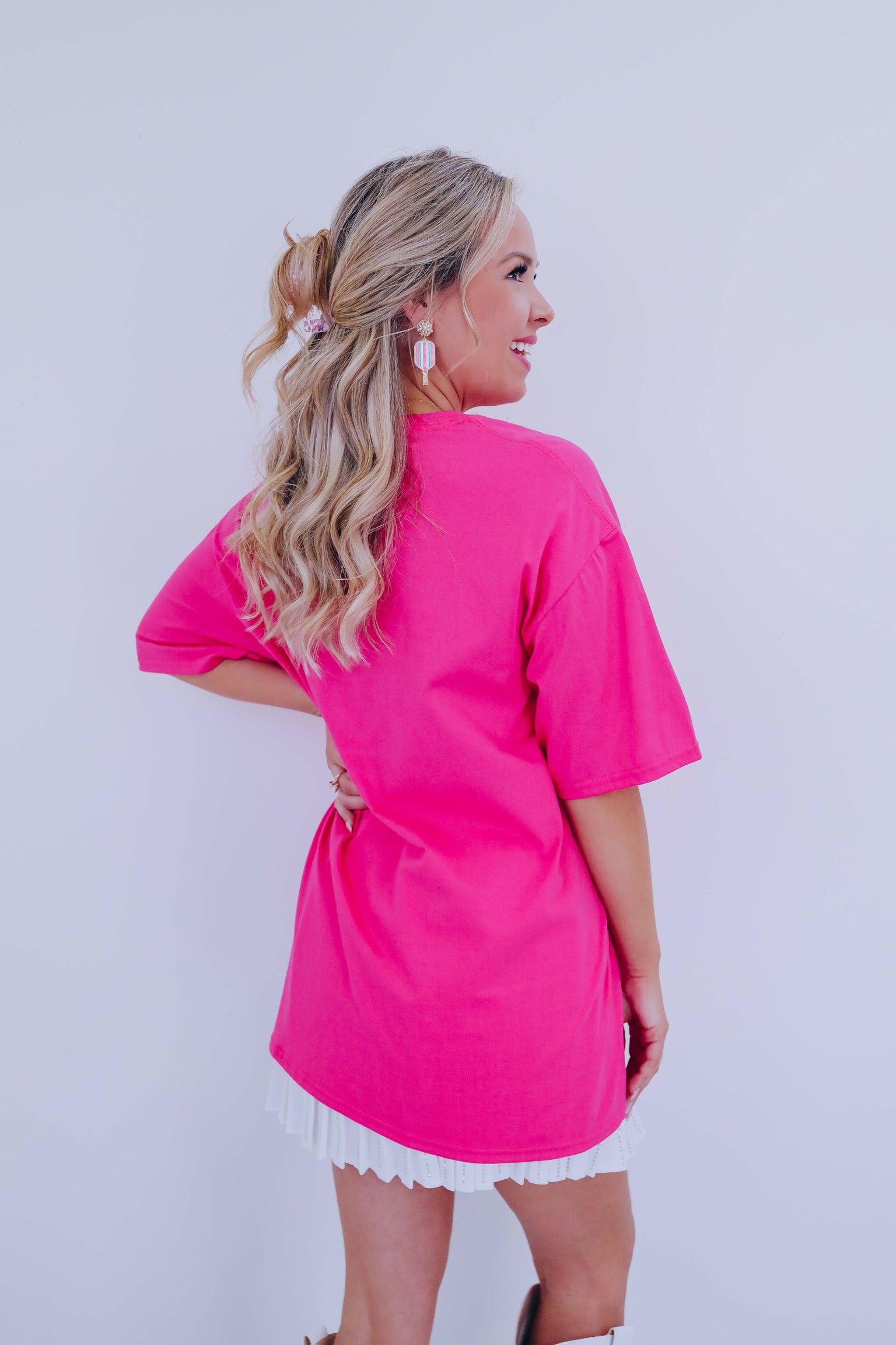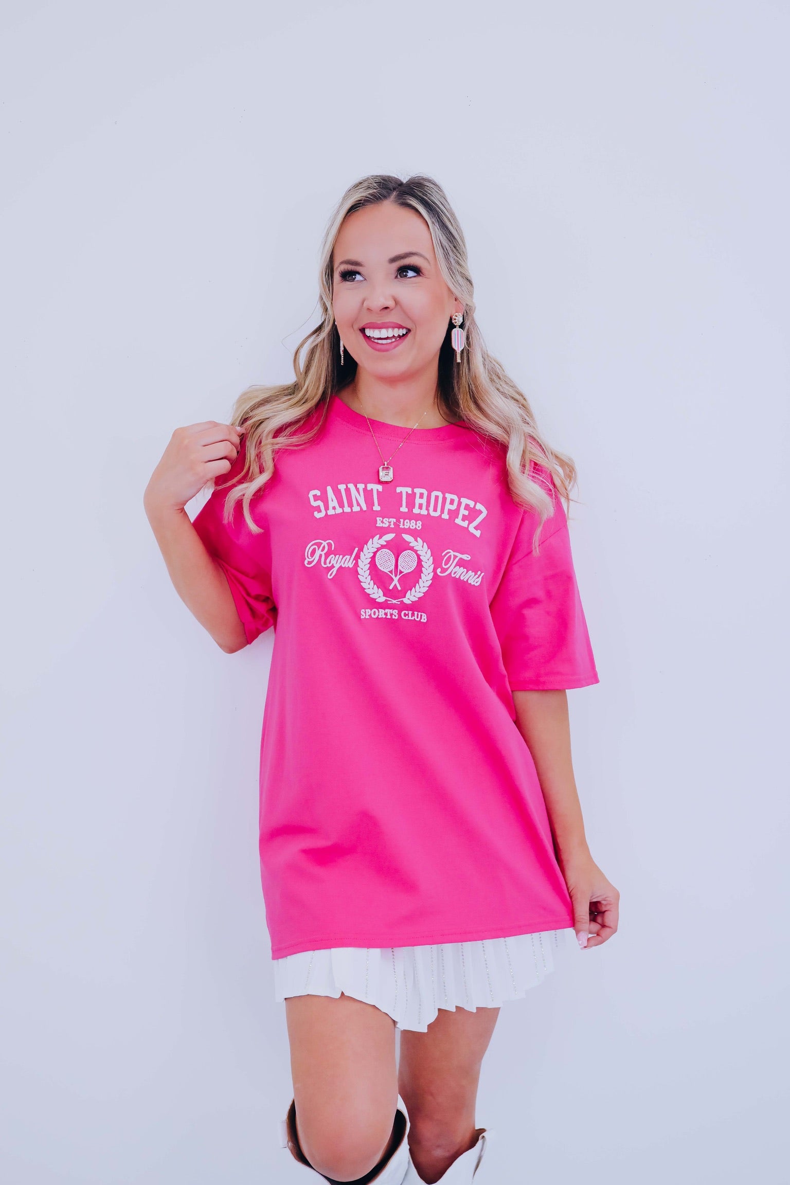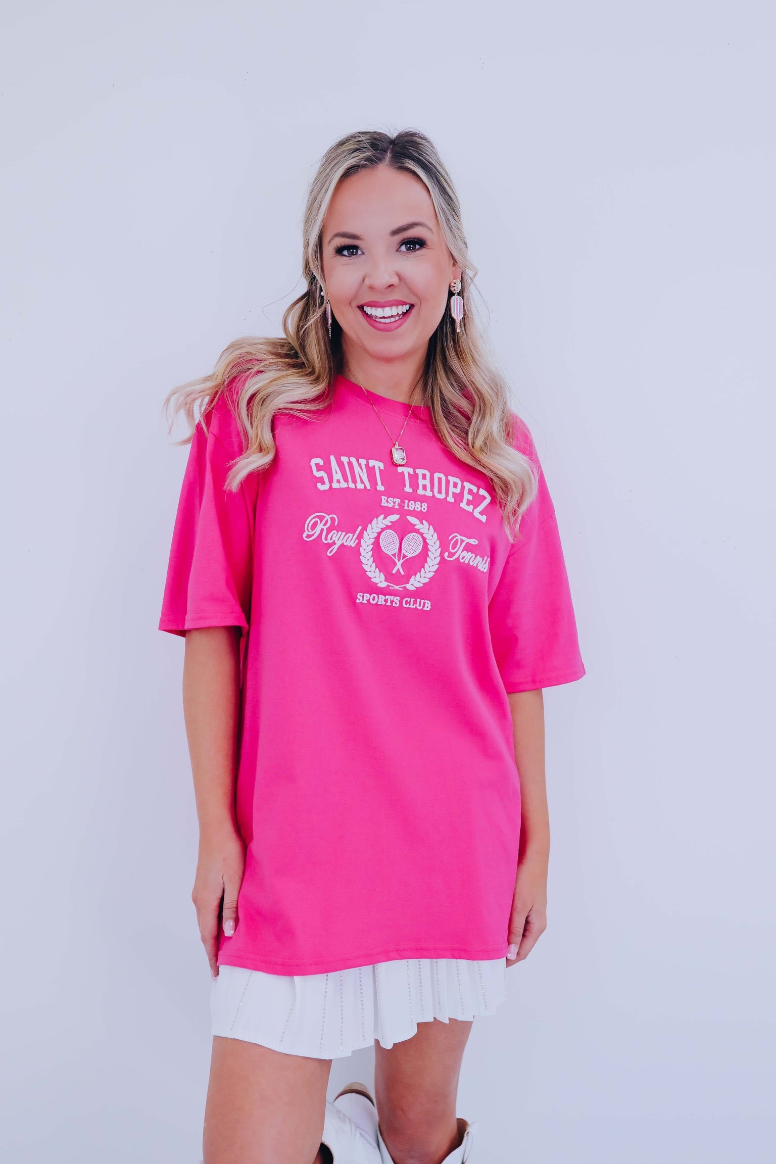 - Features a hot pink base, crew neck, short sleeves, with white embroidered graphics of "Saint Tropez Est. 1988 Royal Tennis Sports Club" with rackets surrounded by a wheat border.