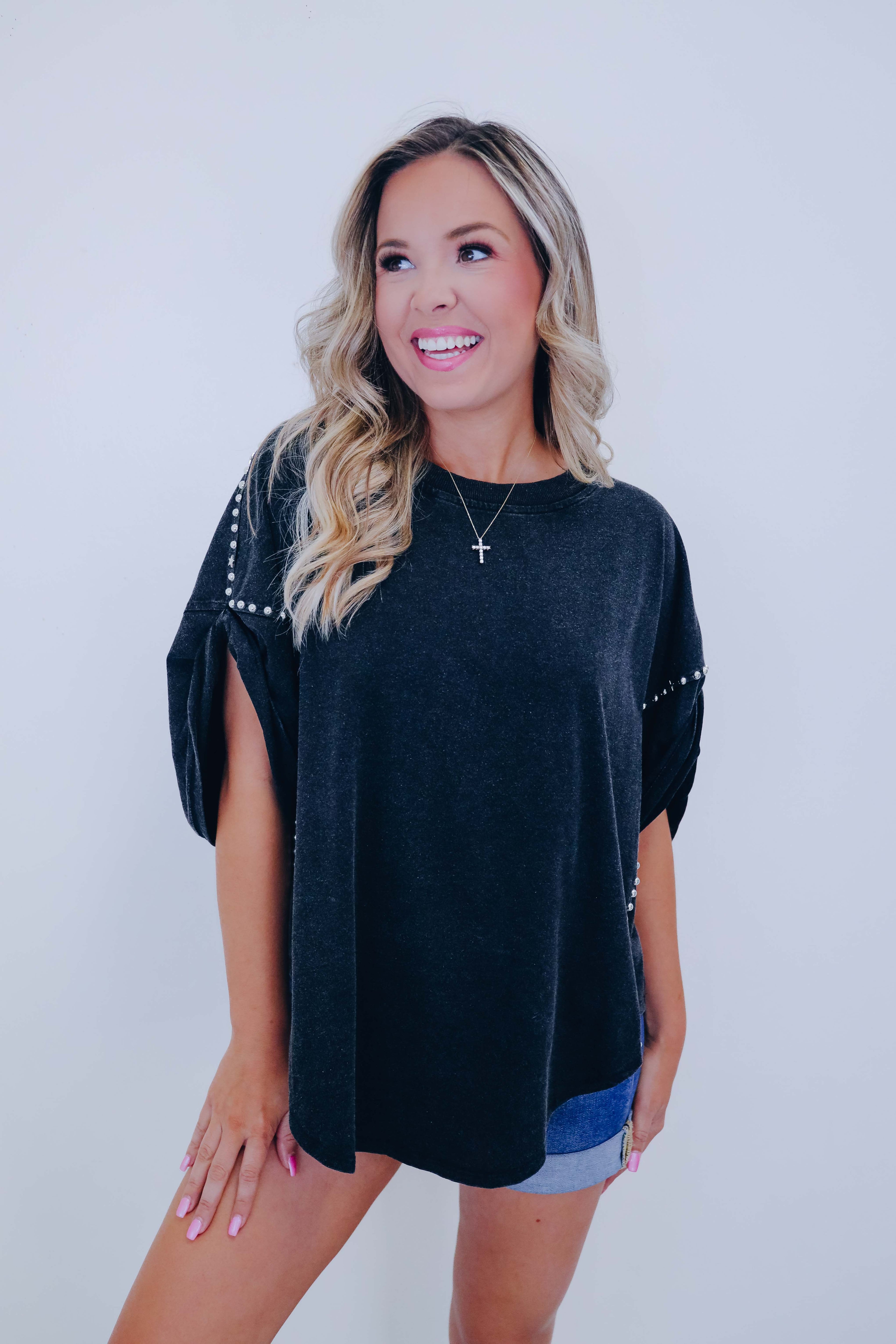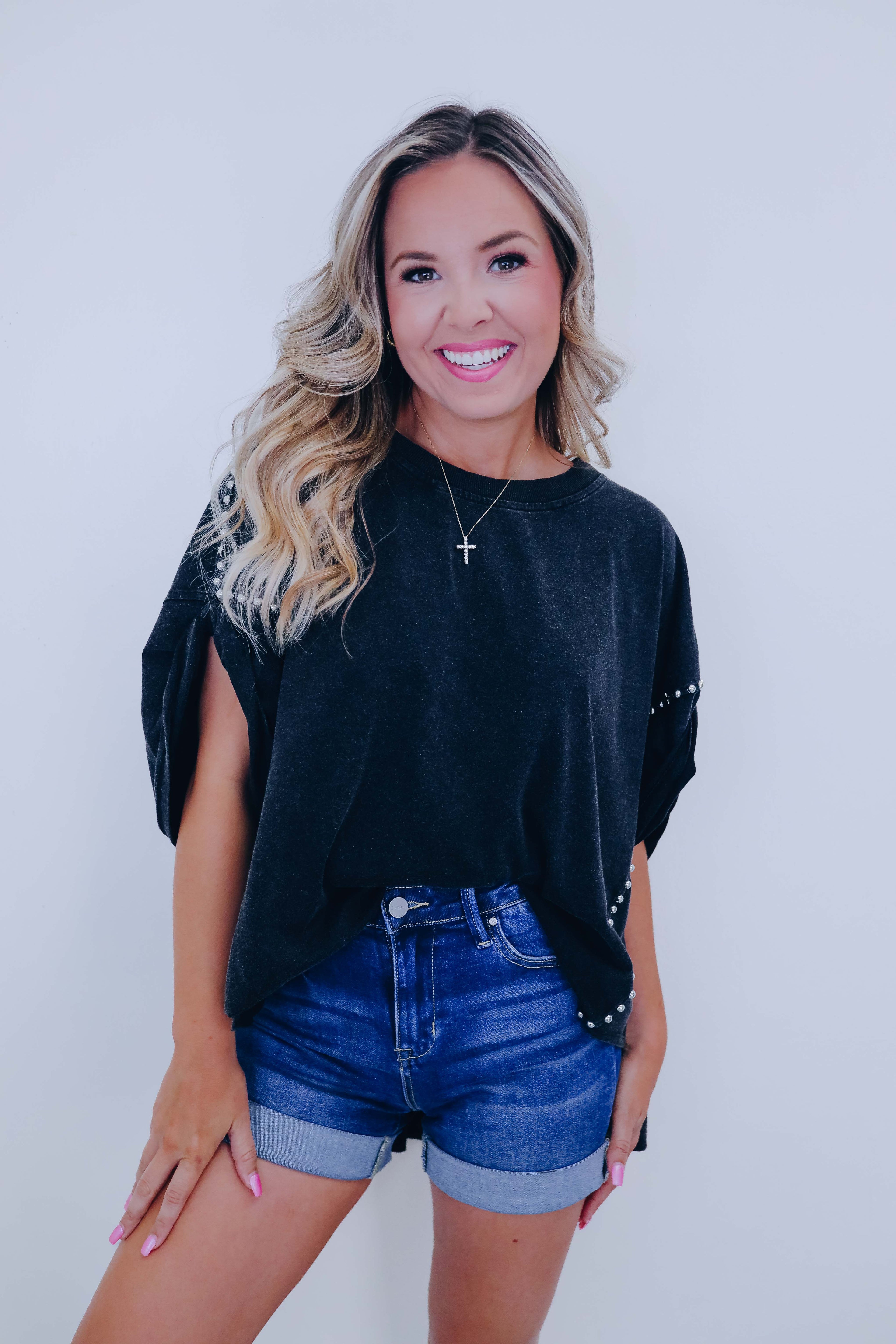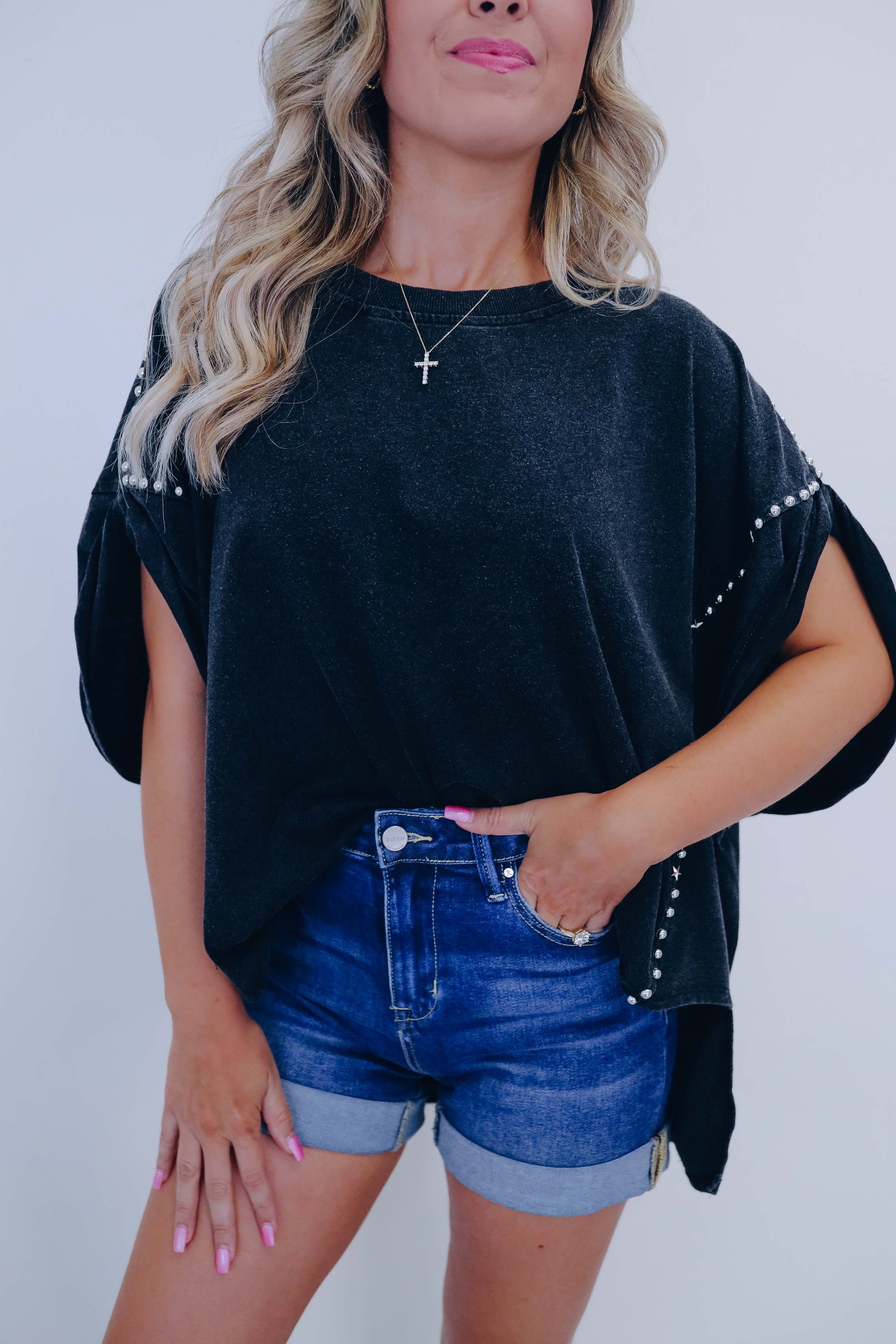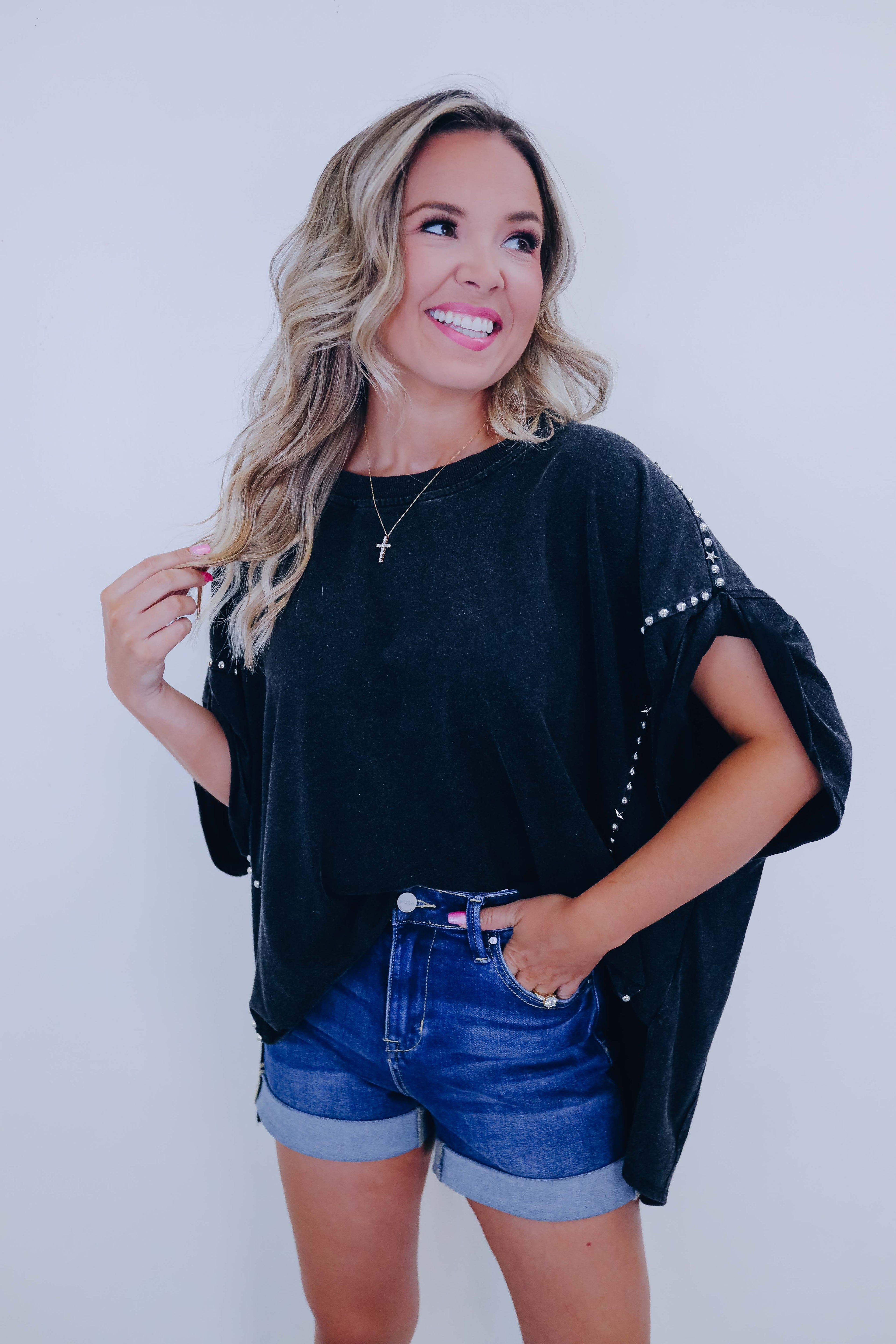 - Our Star Studded Top is going to be a fun go-to when deciding what to wear! This cutie features a combination of both rounded and star studs for the perfect pop! The high low hem and oversized fit makes this a very versatile piece offering many different styling options.