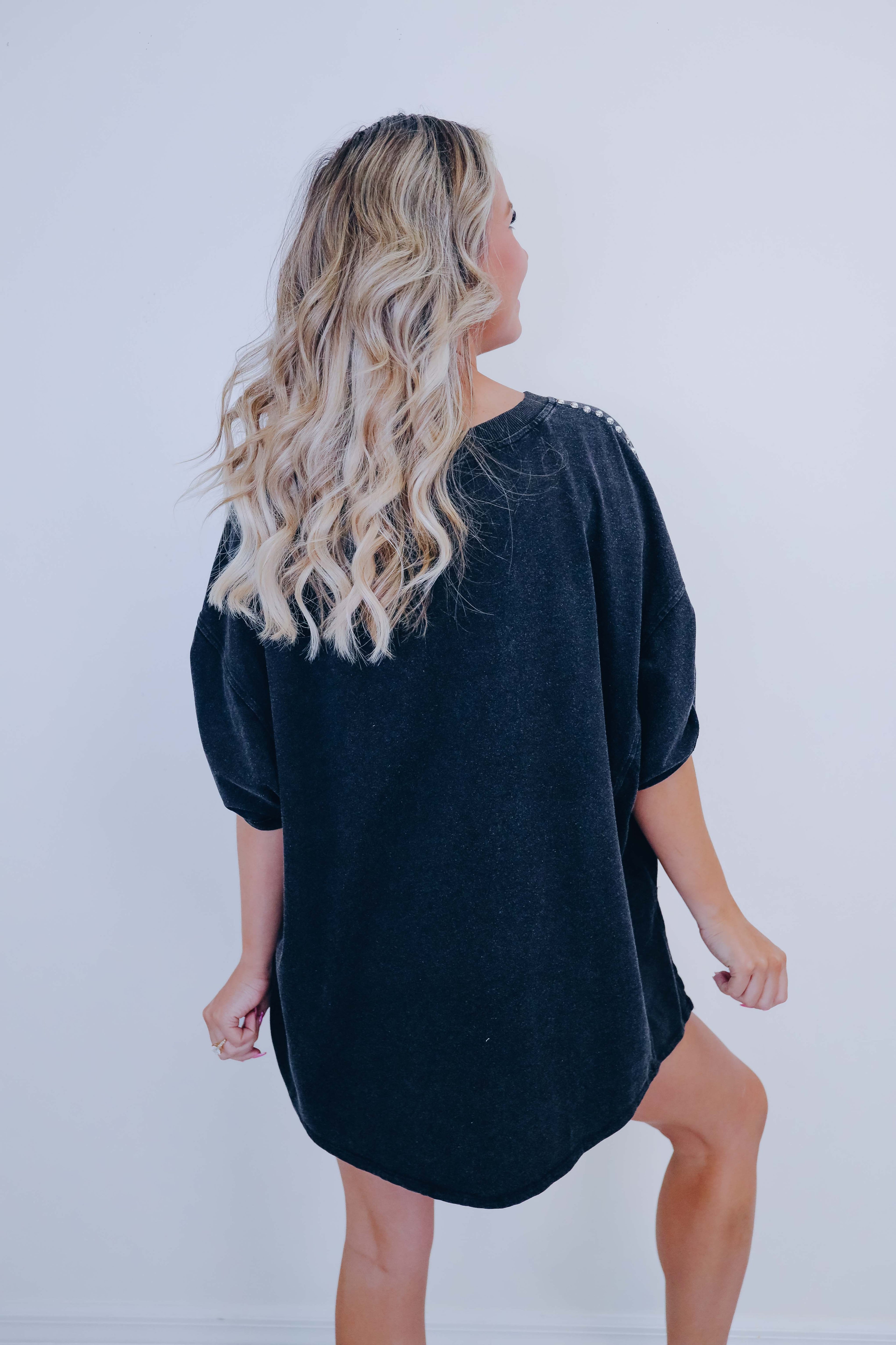 - Featuring soft poly cotton acid washed fabric, a rolled cuff short dolman sleeve, oversized fit, a round neck, star and round shaped studs adorn the shoulder and side seams, and a rounded high low hem.