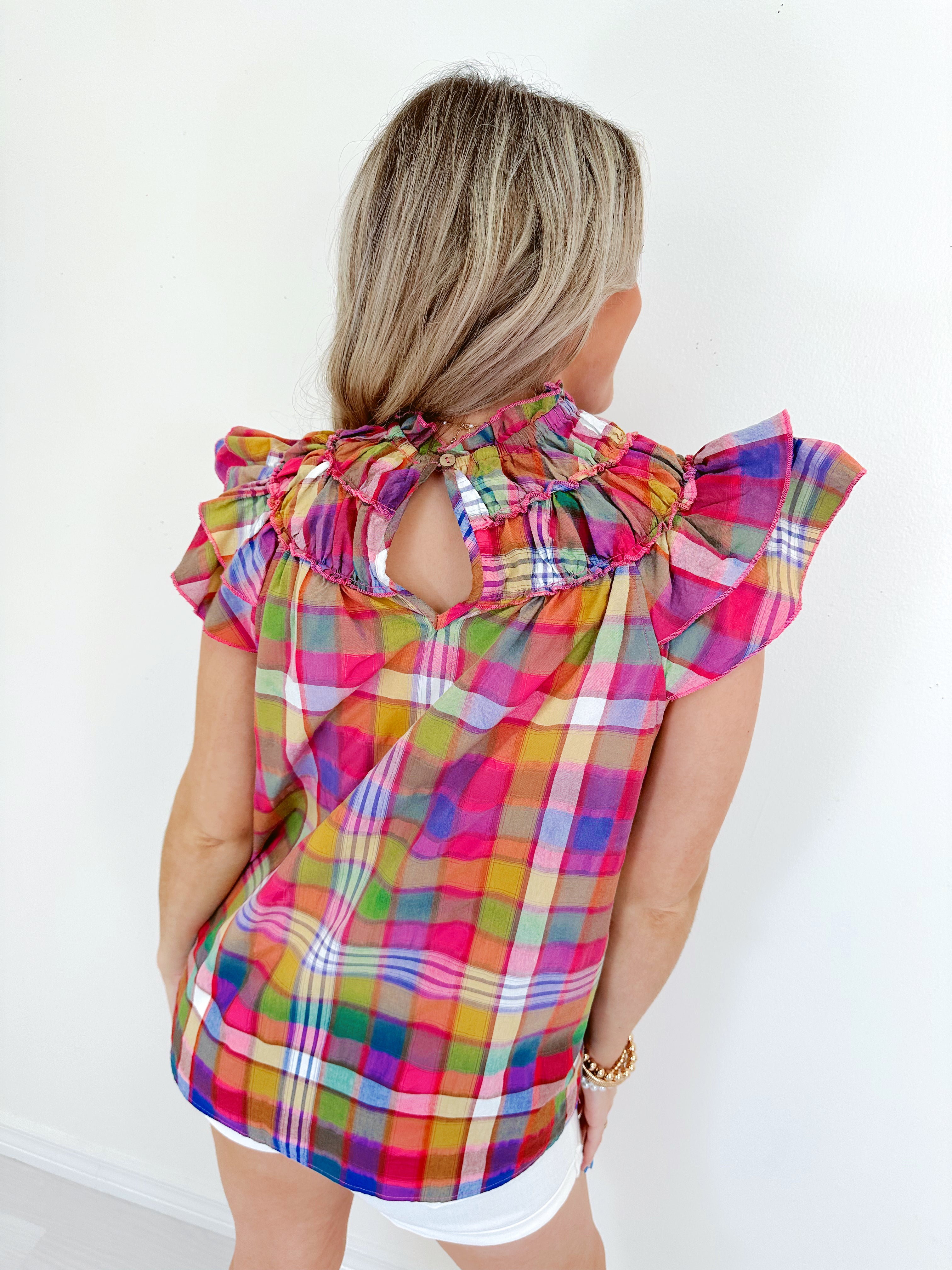 Featuring a colorful vintage dip dyed plaid cotton fabric, a round ruffled neck with keyhole back button closure and ruffled smocking detail, a cap ruffle sleeve, and a flowy hem.