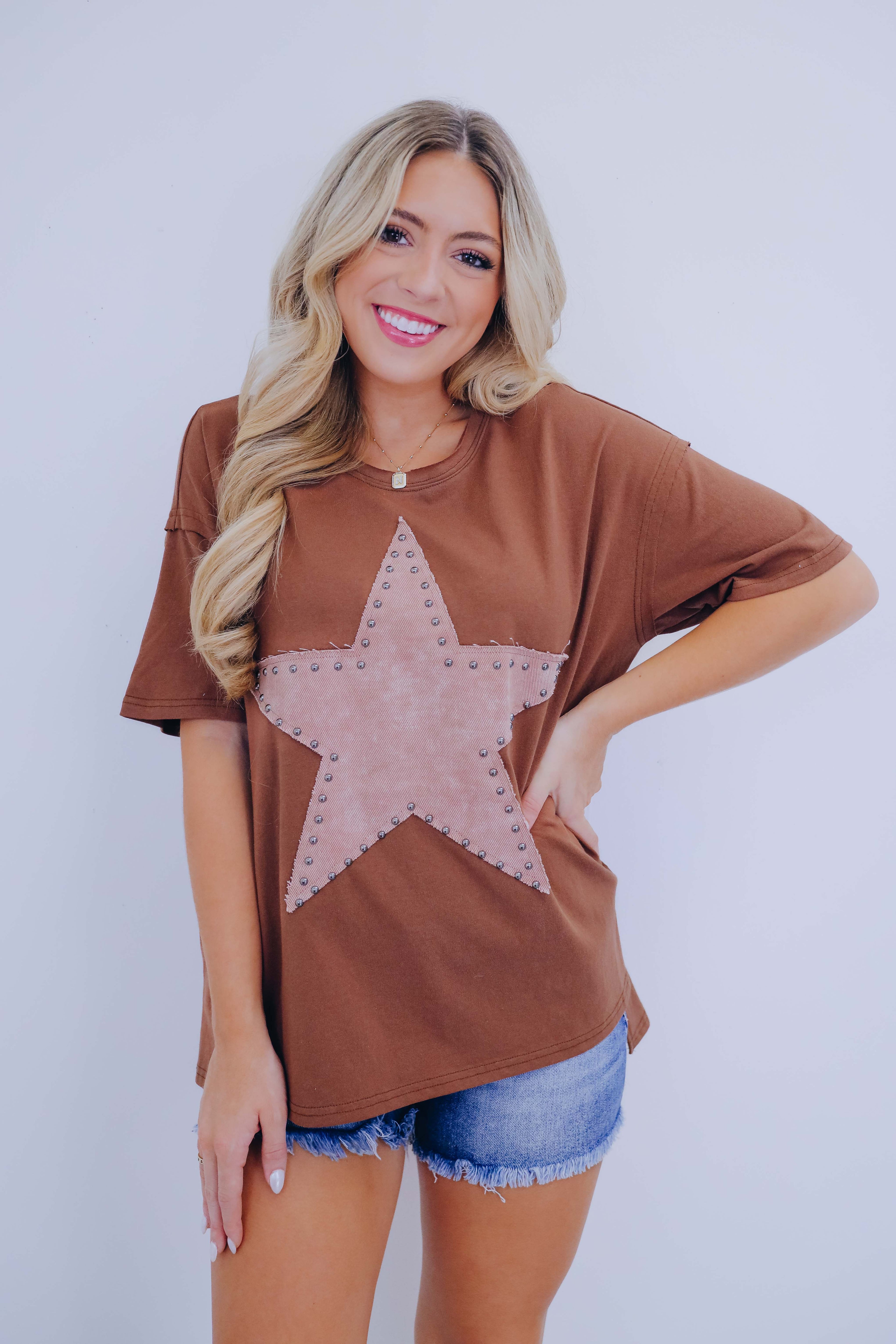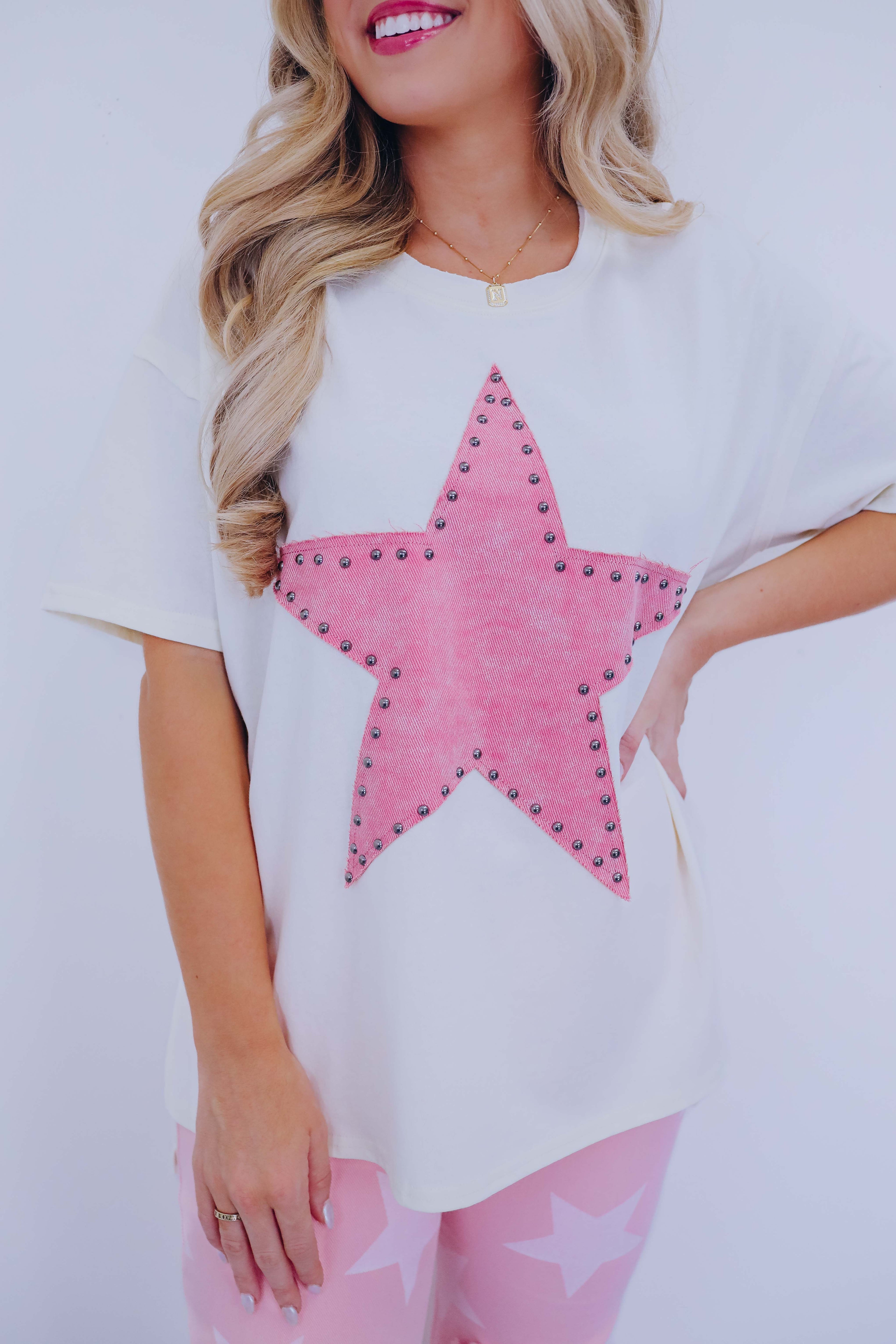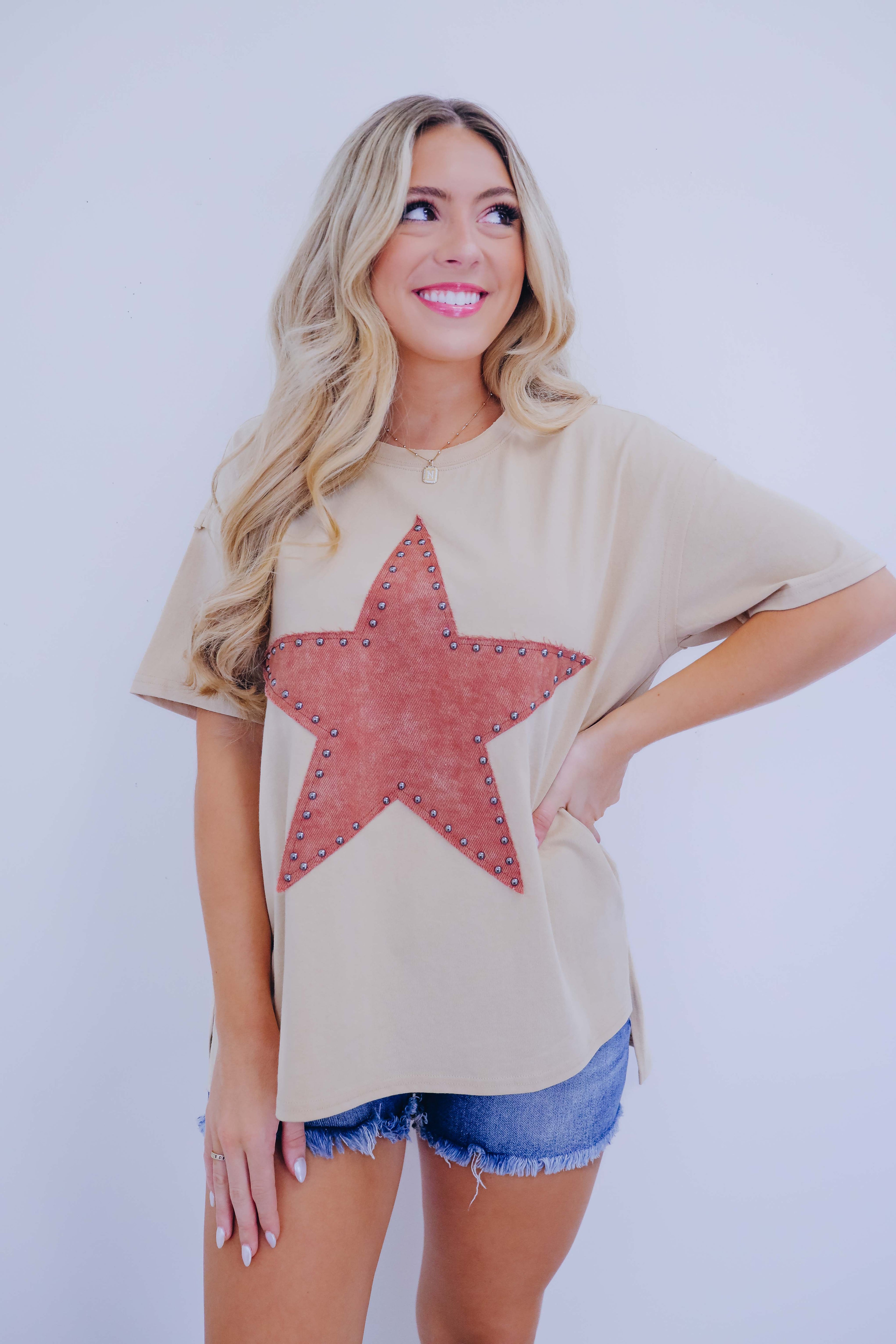 - Stylish and comfy, our Twill Star Stud Patch Oversized Top is a must have. Its super trendy deign makes it an elevated piece you can style for a variety of occasions.