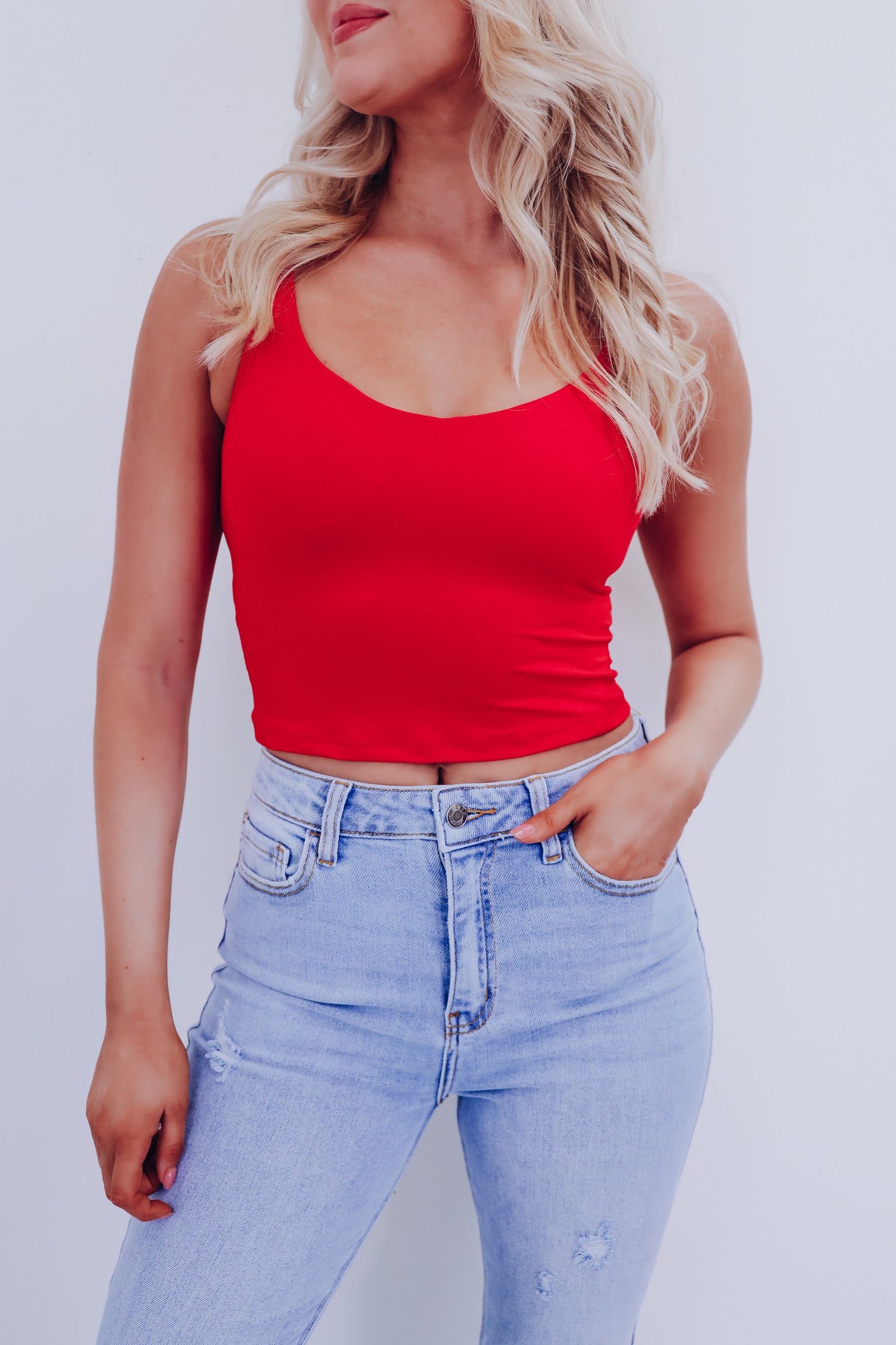 - Features a buttery soft fabric, v-neck, built in bra with padding, tank straps, and a cropped length.