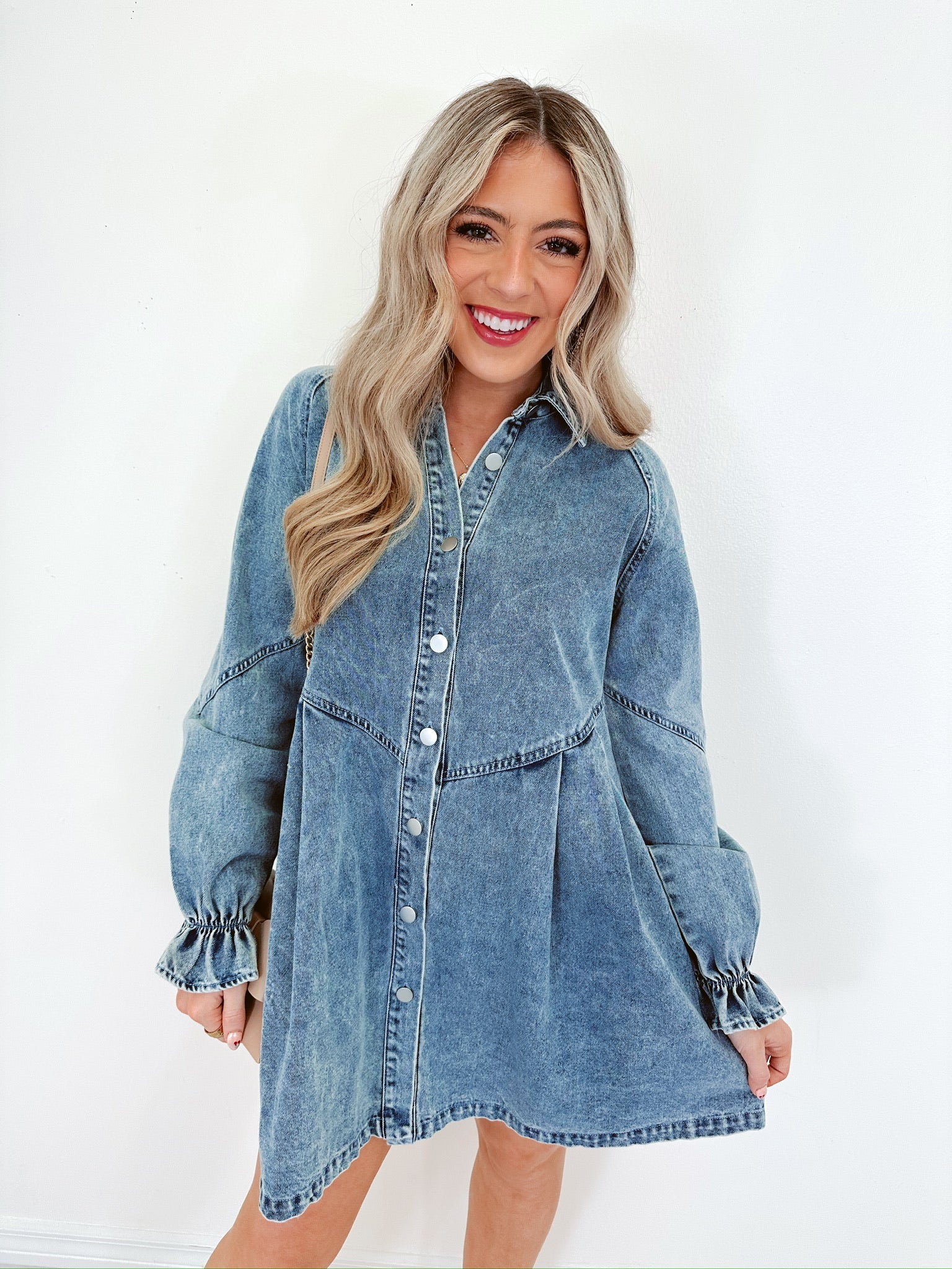 - Comfy and casual our new Vintage Charm Denim Mini Dress is going to add a little western vibe to your wardrobe. Style this cutie with your fav boots for a GNO or date night dancing the night away.