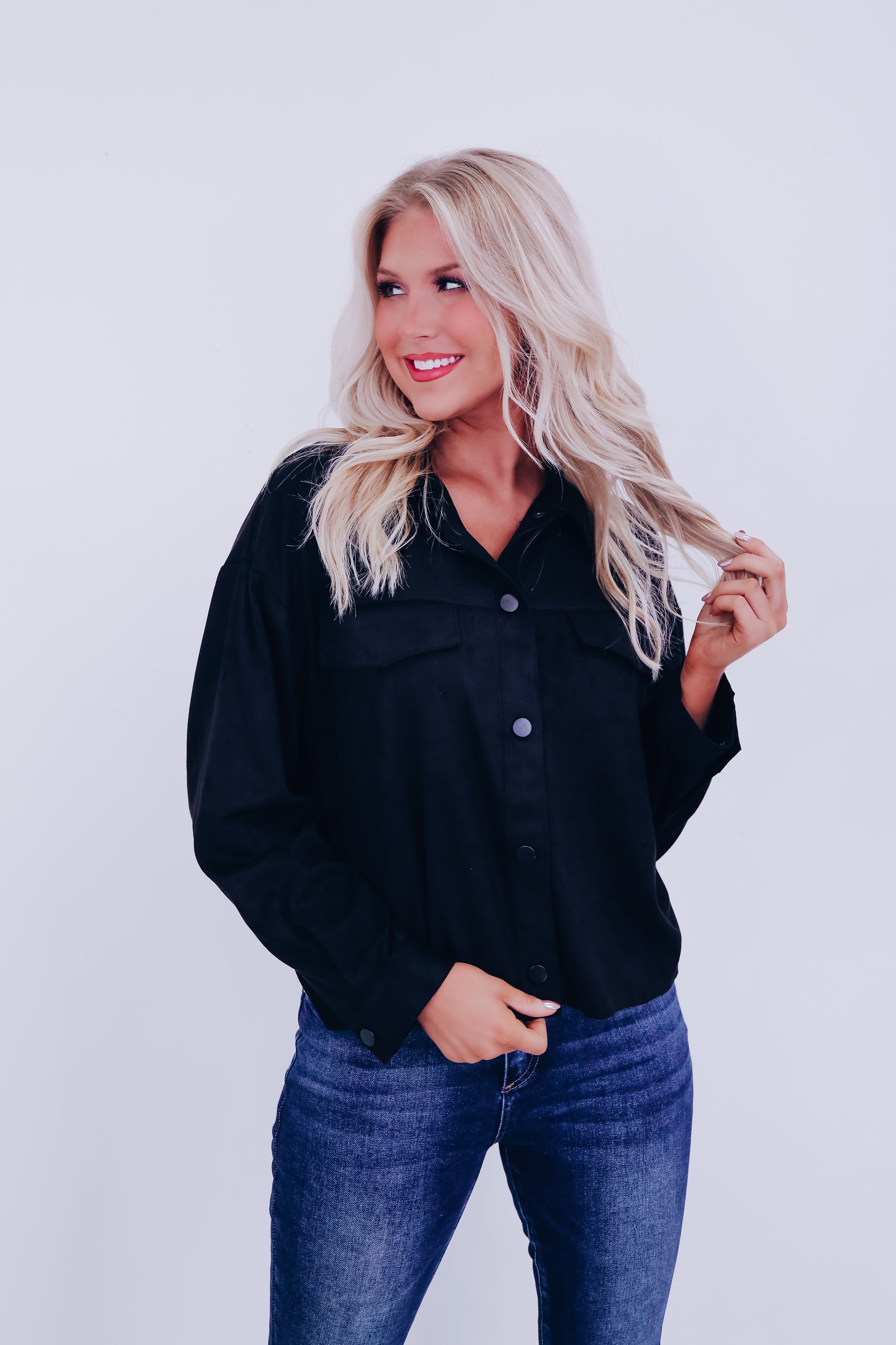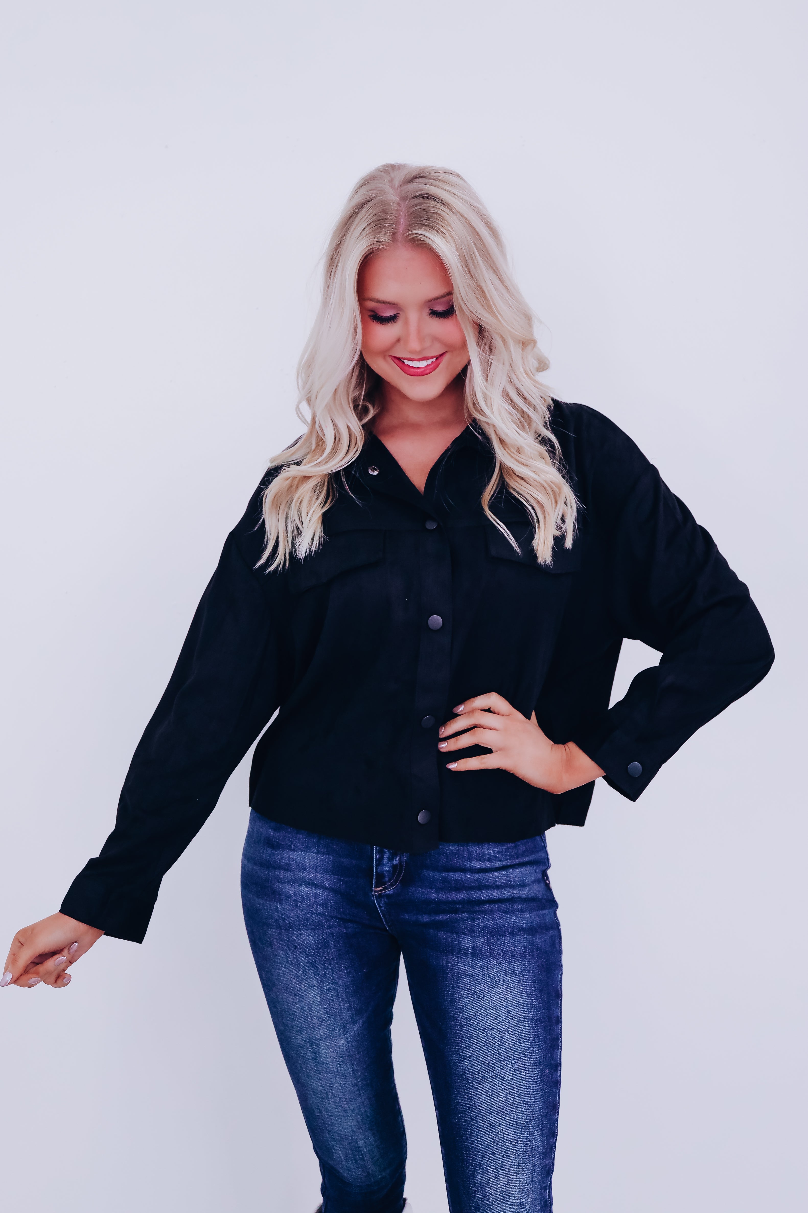 - Features a super soft faux suede fabric, collared snapped front, a drop shoulder long sleeve with snap cuffs, flap patch pockets on the chext, and a raw edge straight hem.
