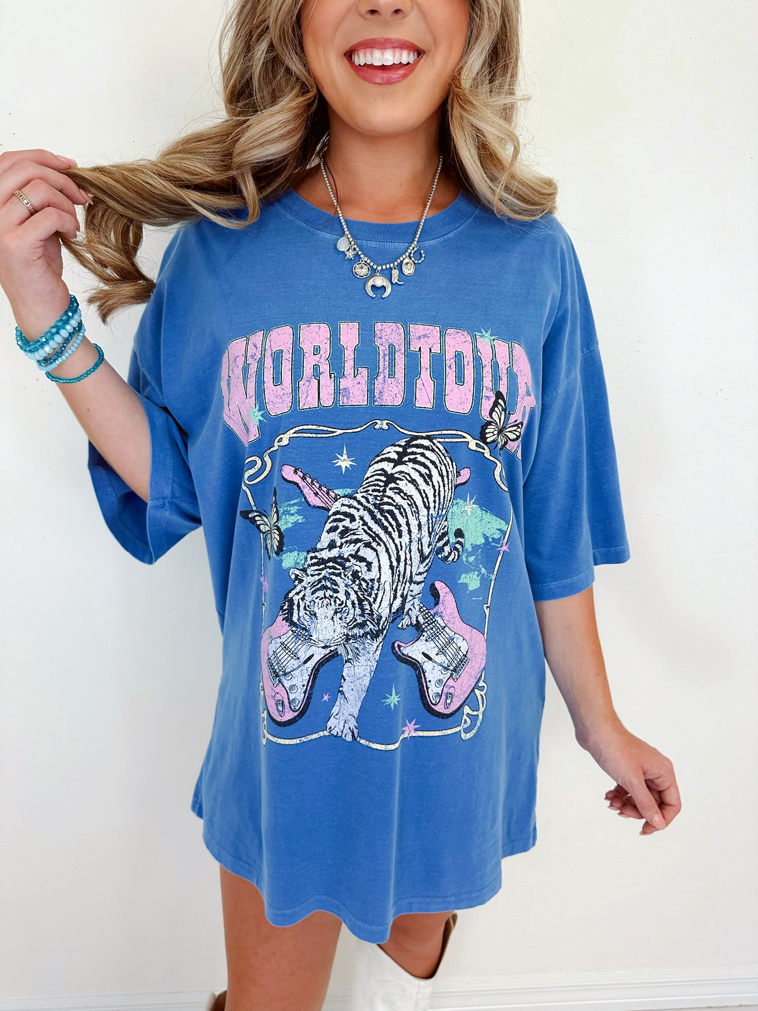 - From concerts to coffee runs, our new World Tour Tiger Vintage Graphic Tee is full of rock and roll wild spirit vibes. This long oversized comfy tee can be styled with everything from leggings to frilly skirts for a variety of fits.