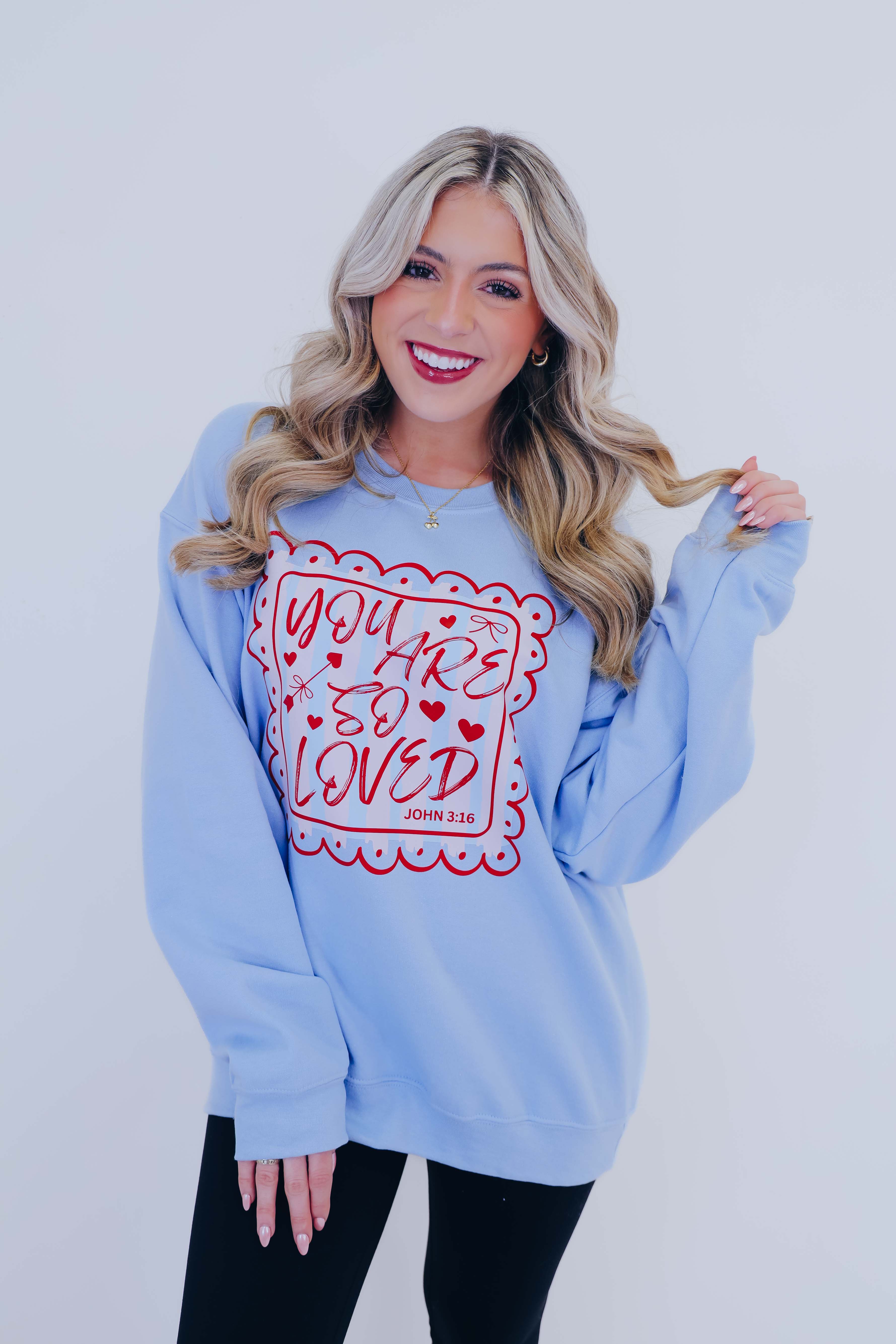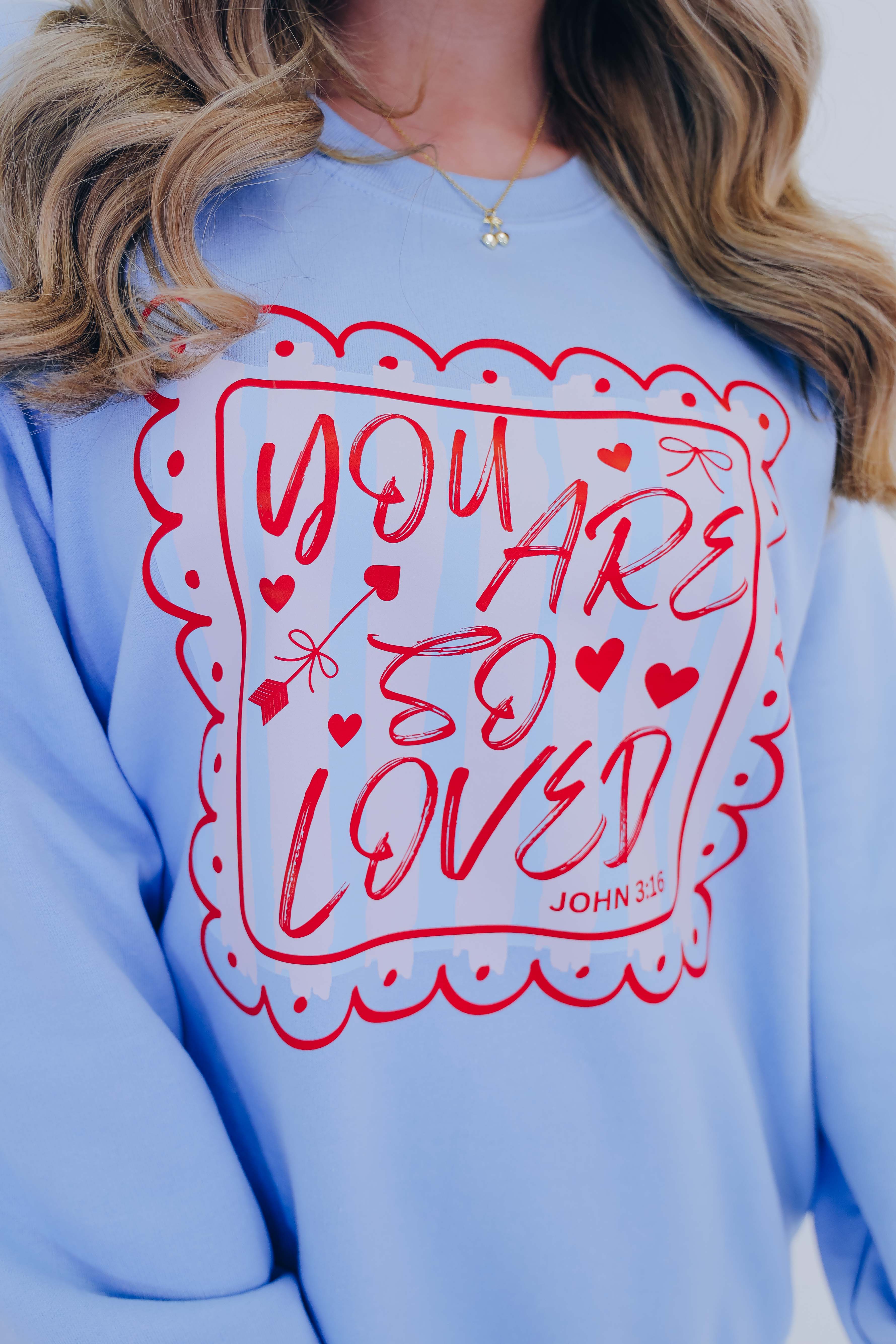 - Features a Gildan poly-cotton base, crew neck, long sleeves, graphics include a filigree frame with pink and blue stripes with "You Are So Loved" decorated with Valentine elements and John 3:16 inside the frame.