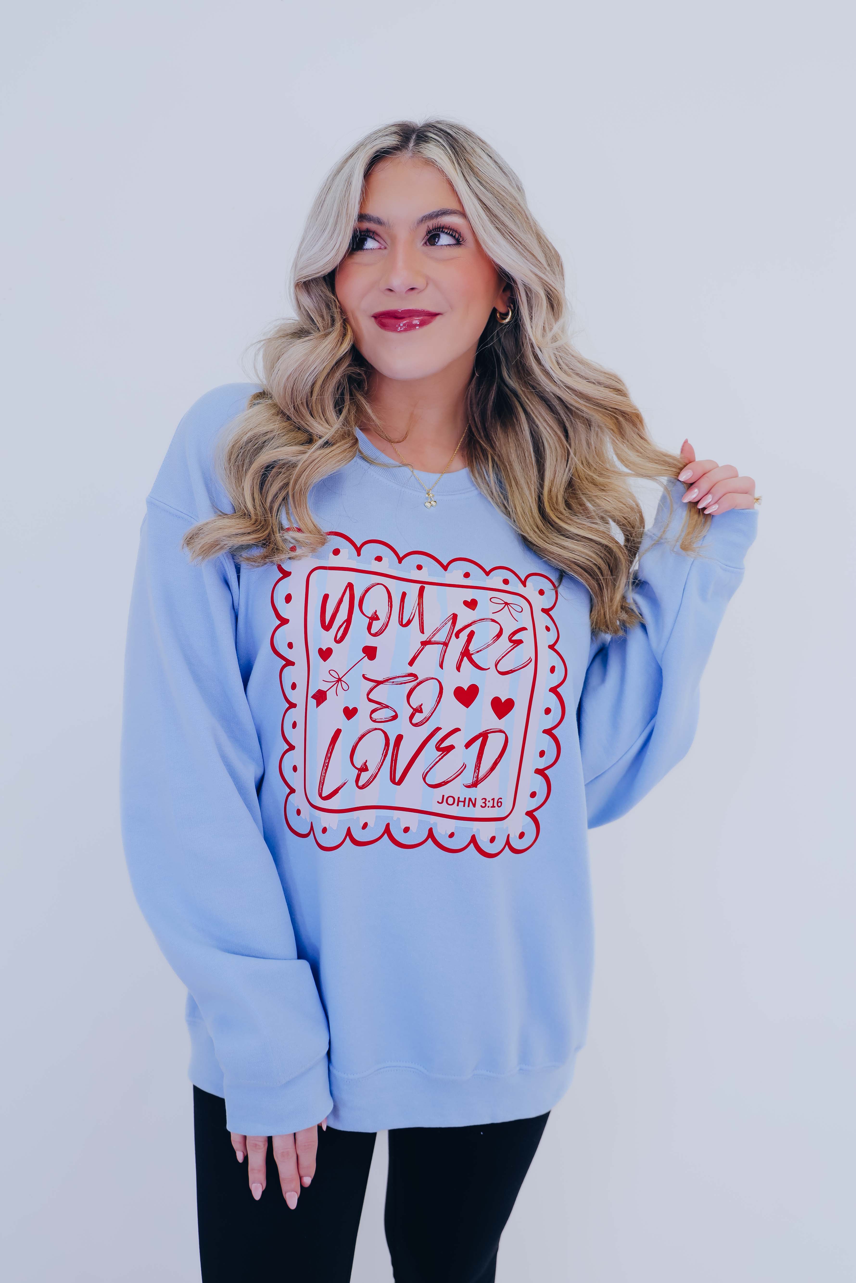 Our You Are So Loved Graphic Sweatshirt is a perfect V-day graphic. Style this sweatshirt with your fav denim or leggings for a comfy OOTD.