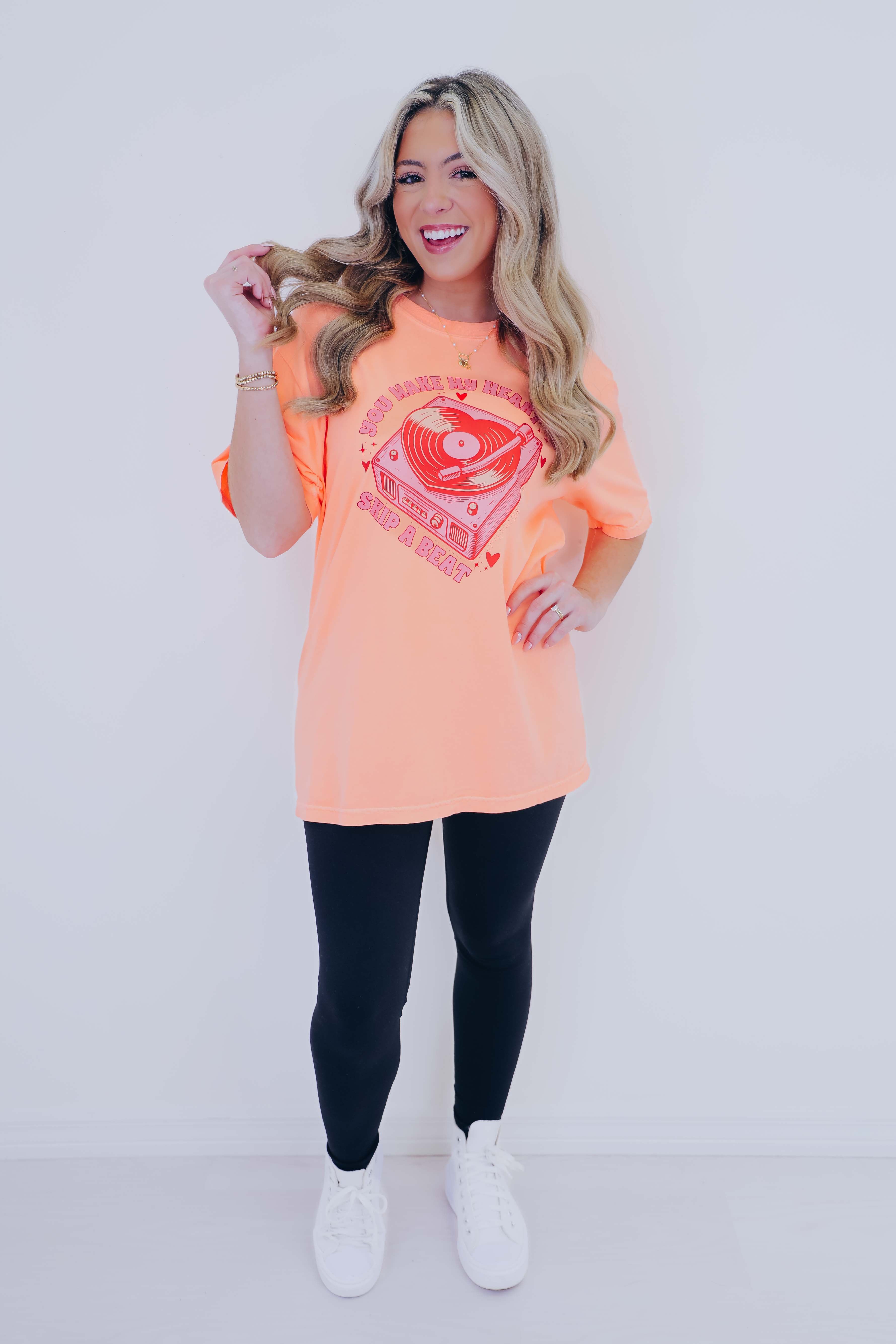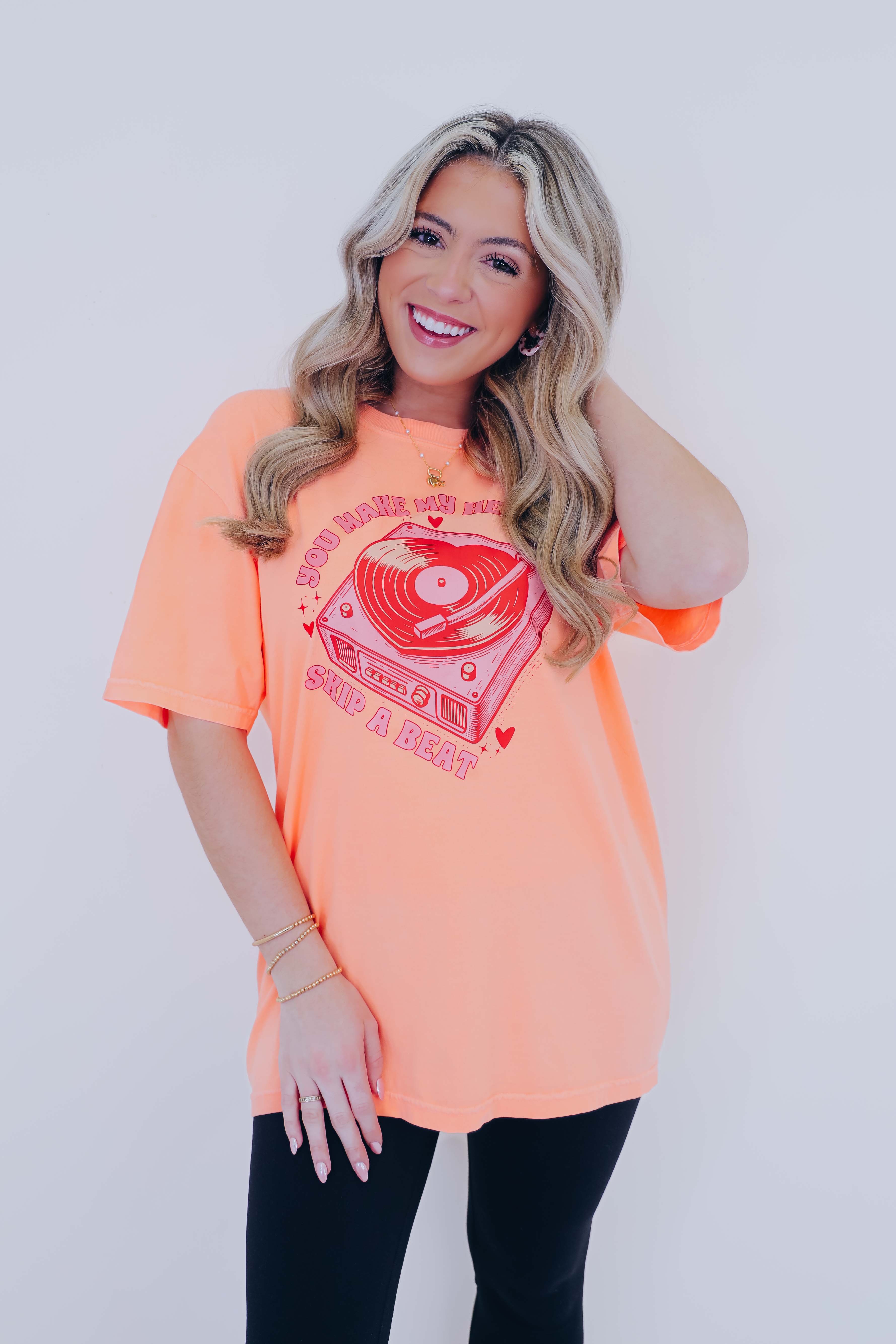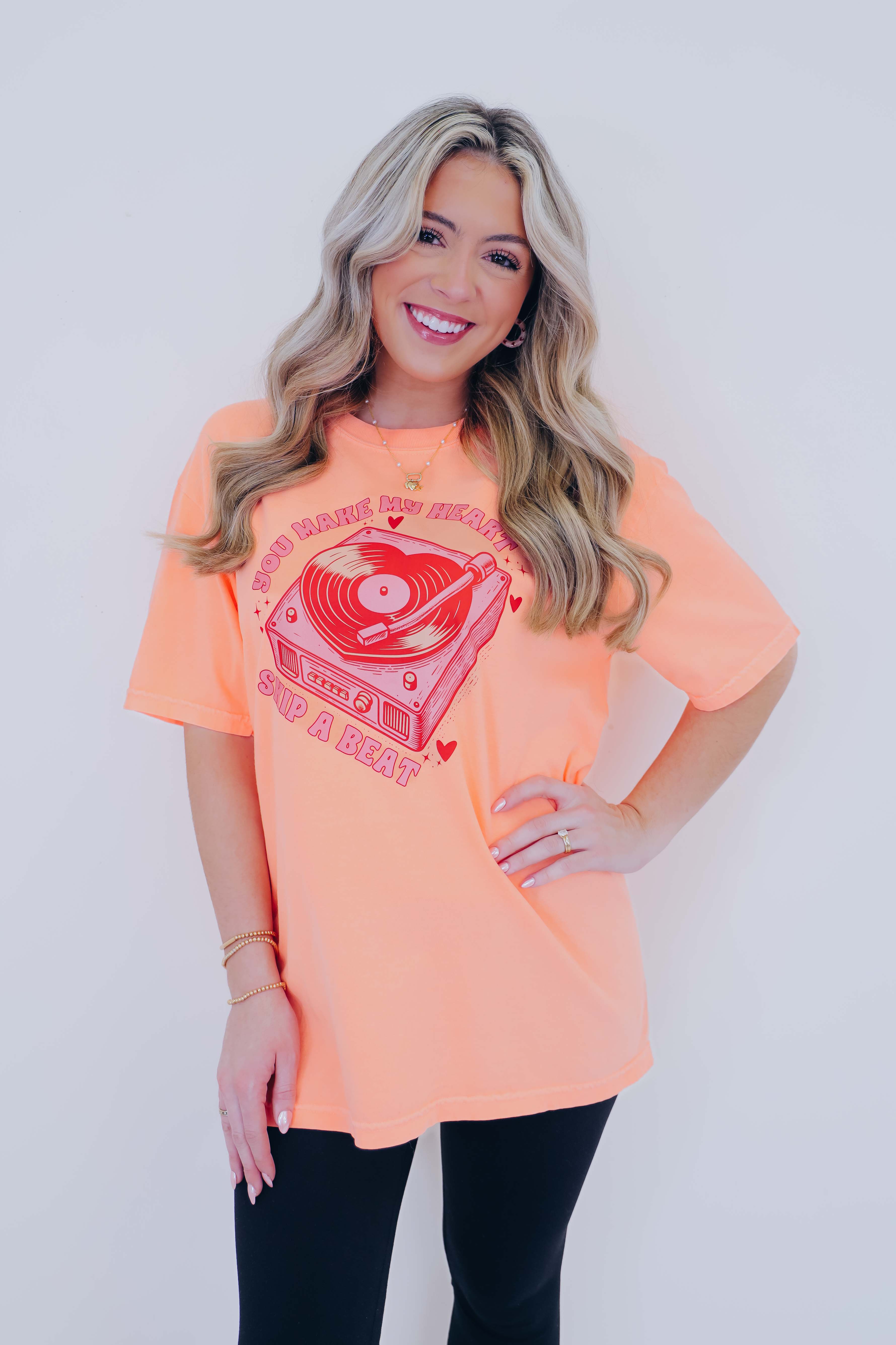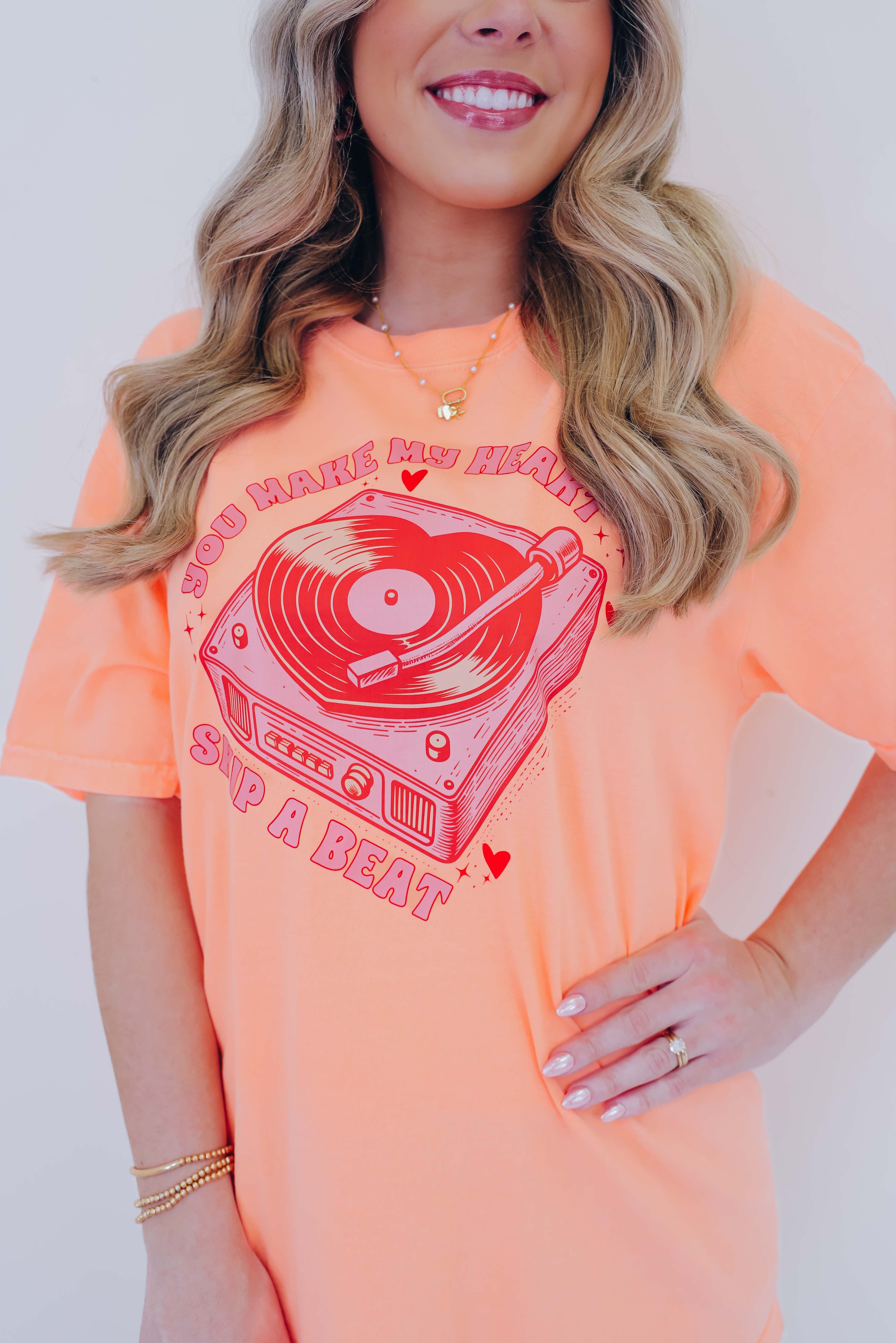 - Features a comfort color cotton tee, crew neck, short sleeves, graphics include a record player with a heart shaped vinyl and the saying "You Make My Heart Skip A Beat".