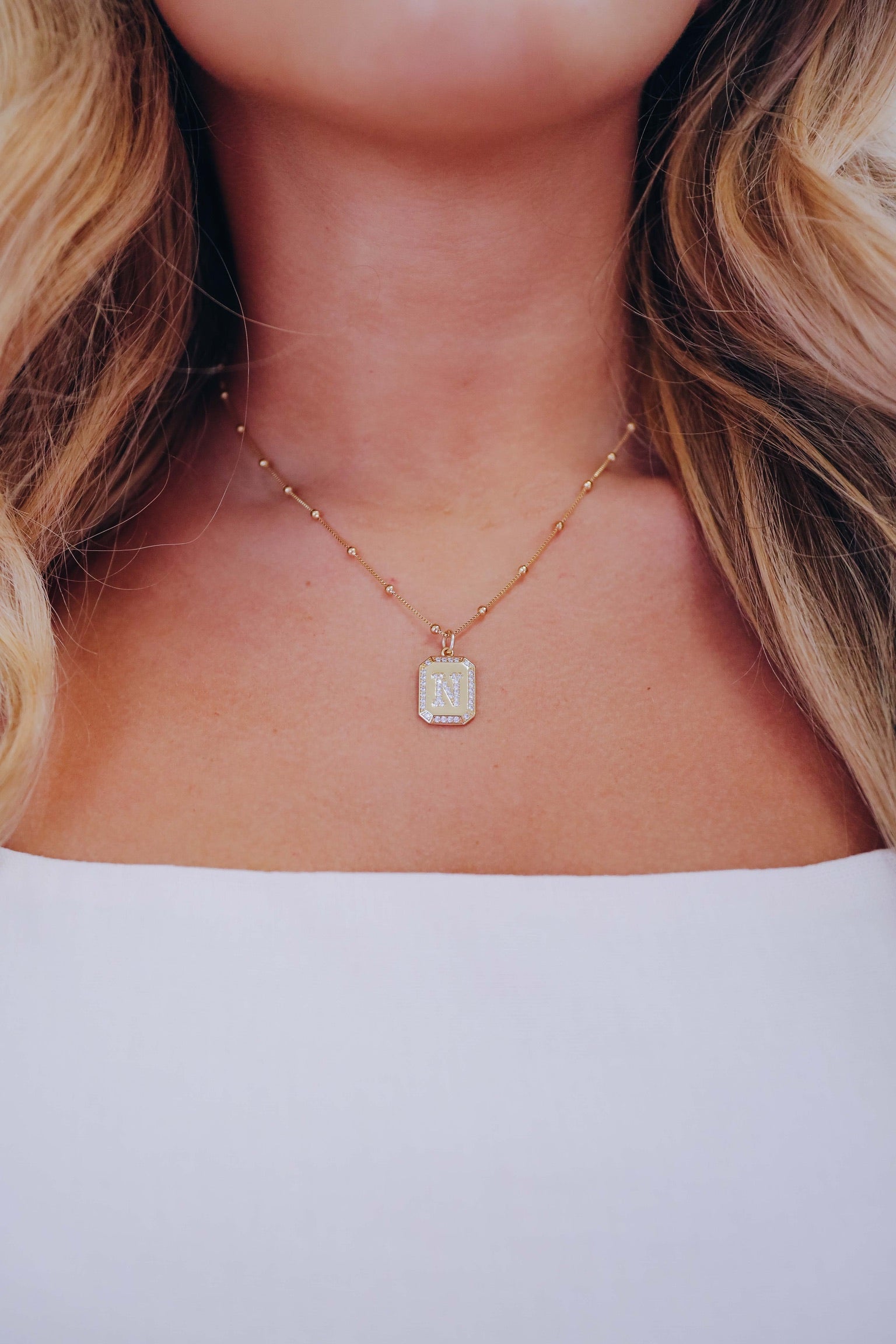 - Features a pendant with a pavé initial and an encrusted border. Includes a beaded chain with a ring clasp closure.