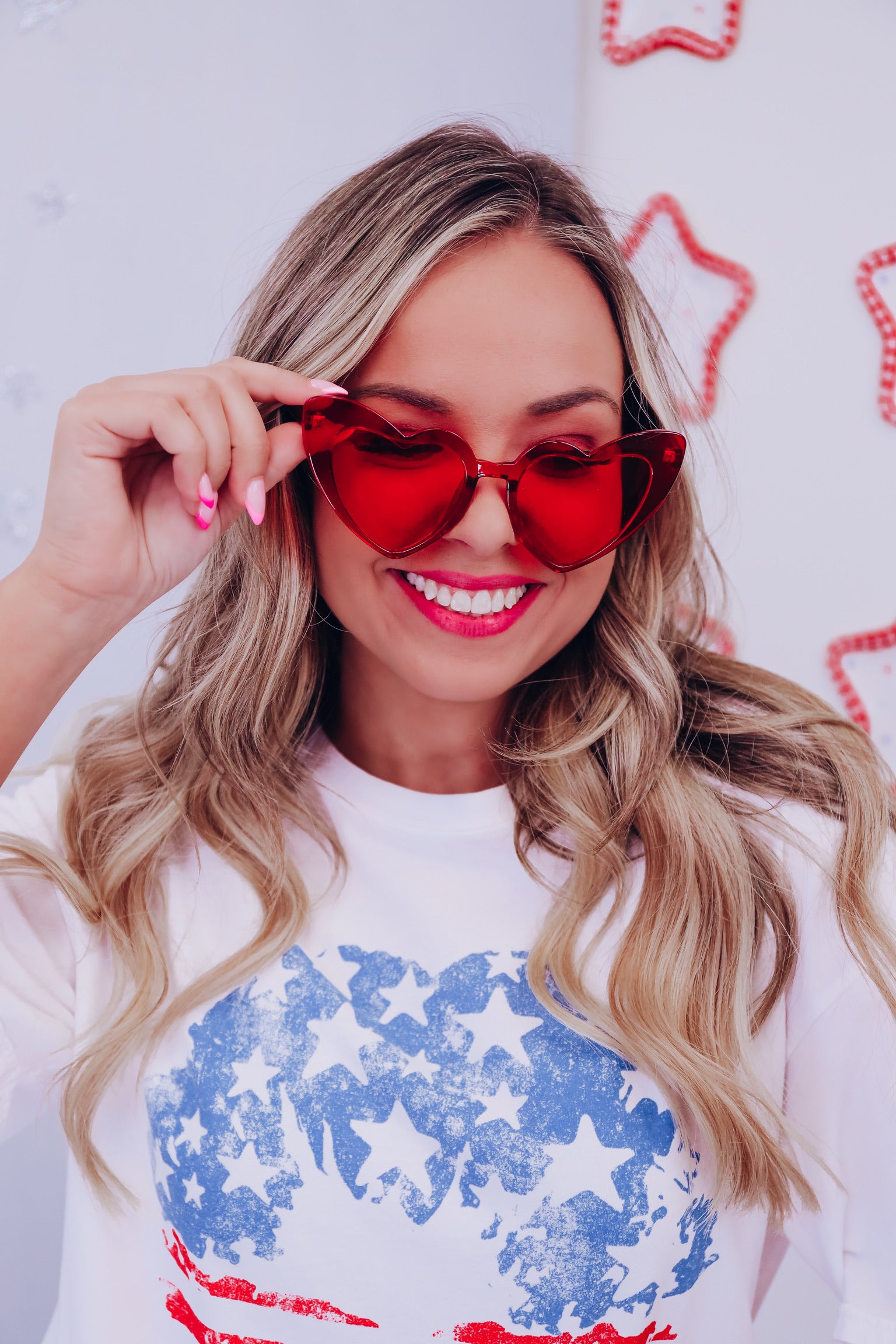 - Features a heart shape lens, a standard side band, a cat-eye/heart red acrylic frame and bridge, with a red lens.