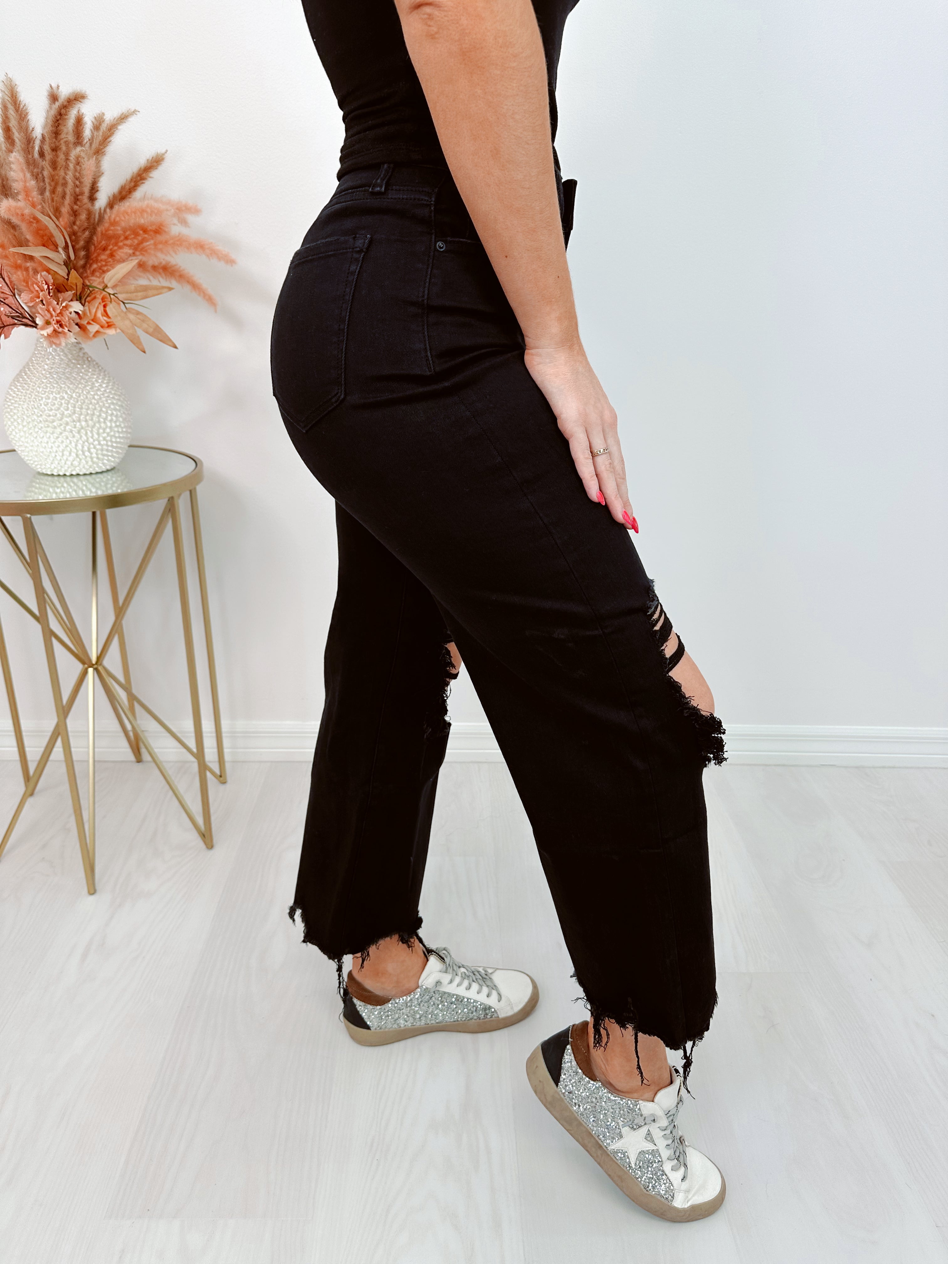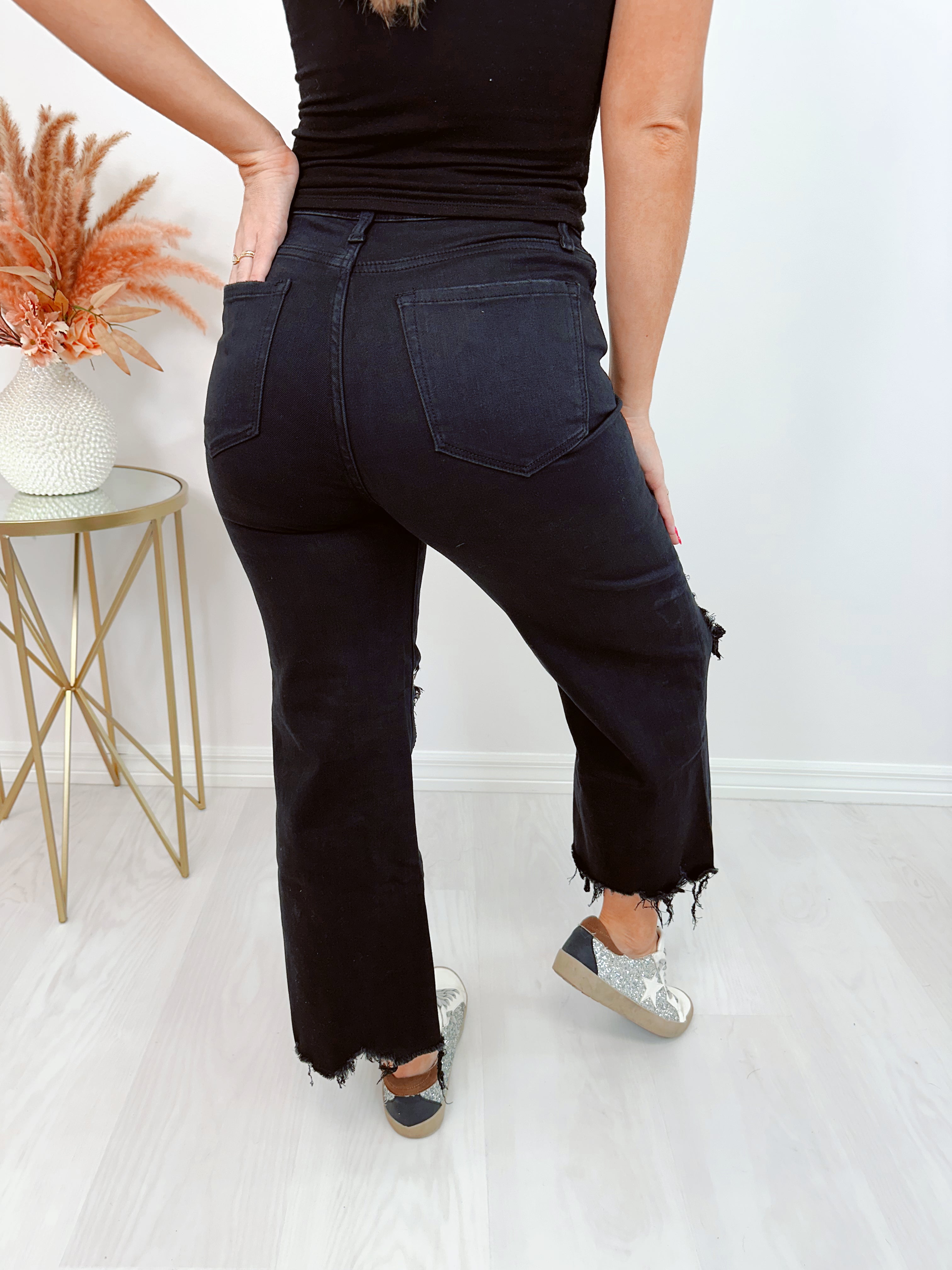 - Trendy and oh so comfy these destroyed knee denim jeans are going to be a fav! Style these black jeans with a white tee and sneakers for a casual fit or with a button up blouse and heels for an elevated OOTD.