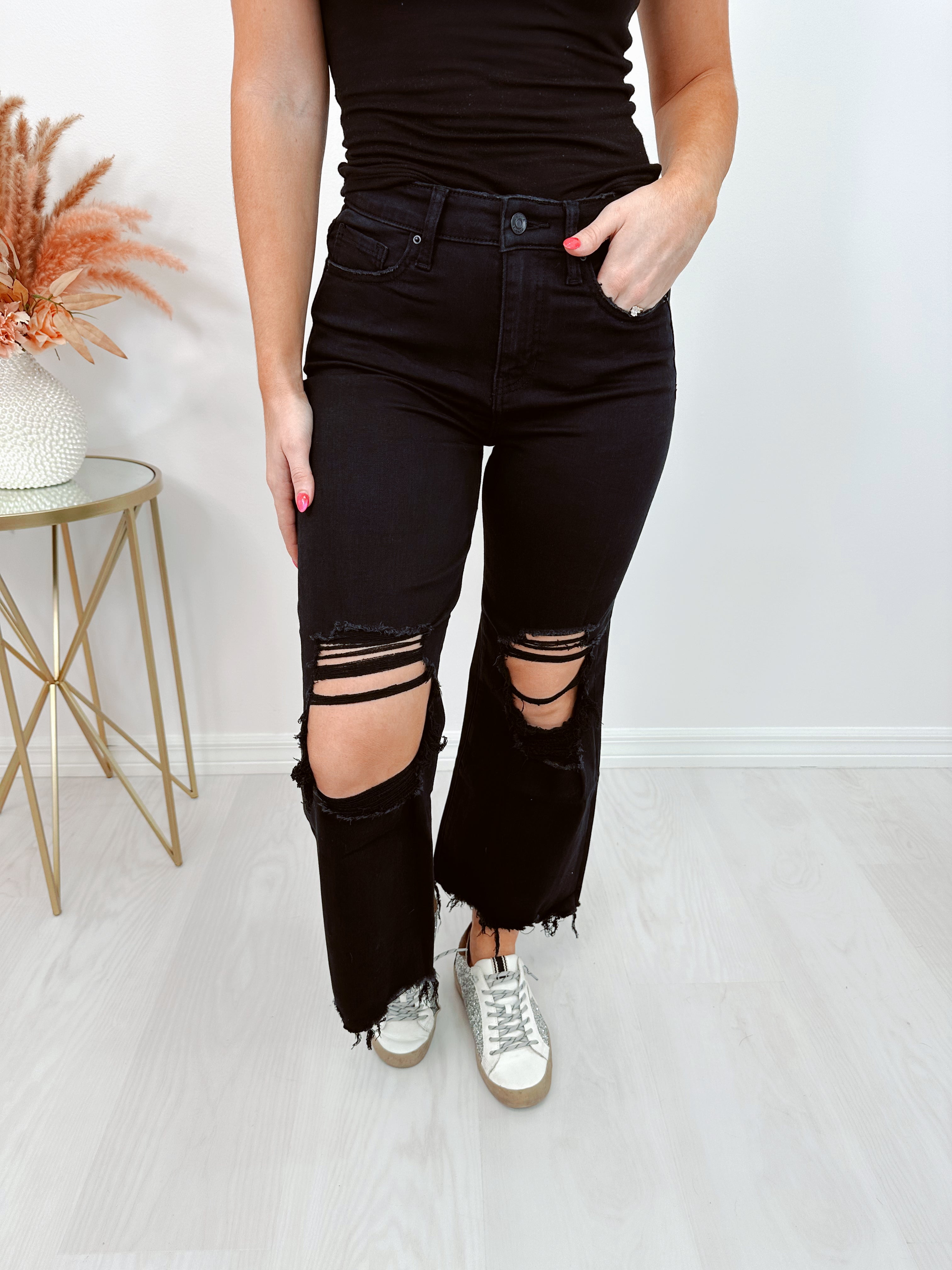 - Features stretchy denim fabric, a high waist, button and zip closure, a five pocket design, distress/destroyed knees, and a crop frayed flare hem.