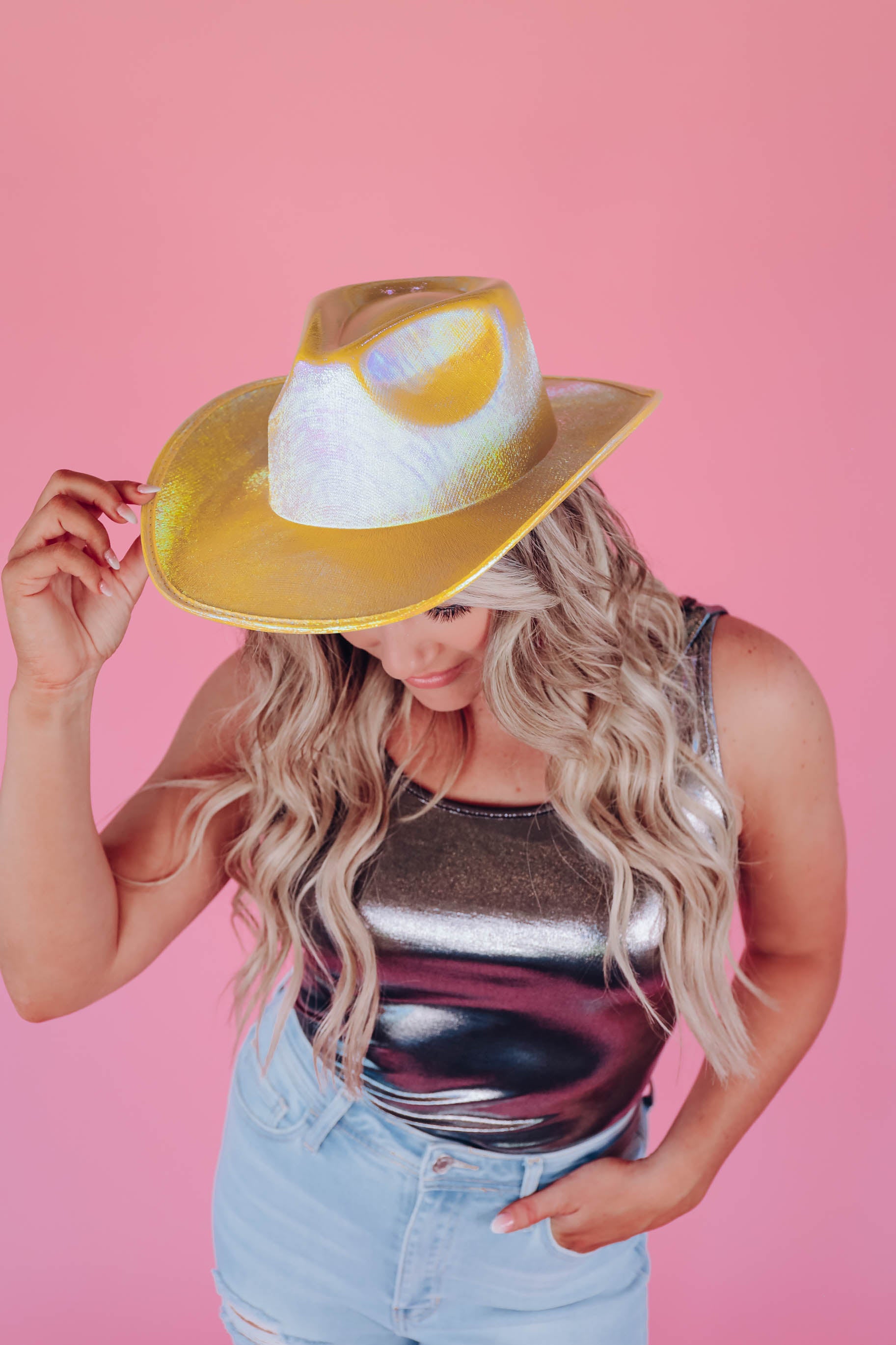 • Add our "Bristol Metallic Cowgirl Hat " to any outfit to show off your sassy trendy style! Hat features a shiny metallic/iridescent fabric that will add an edgy pop of color to your OOTD!!