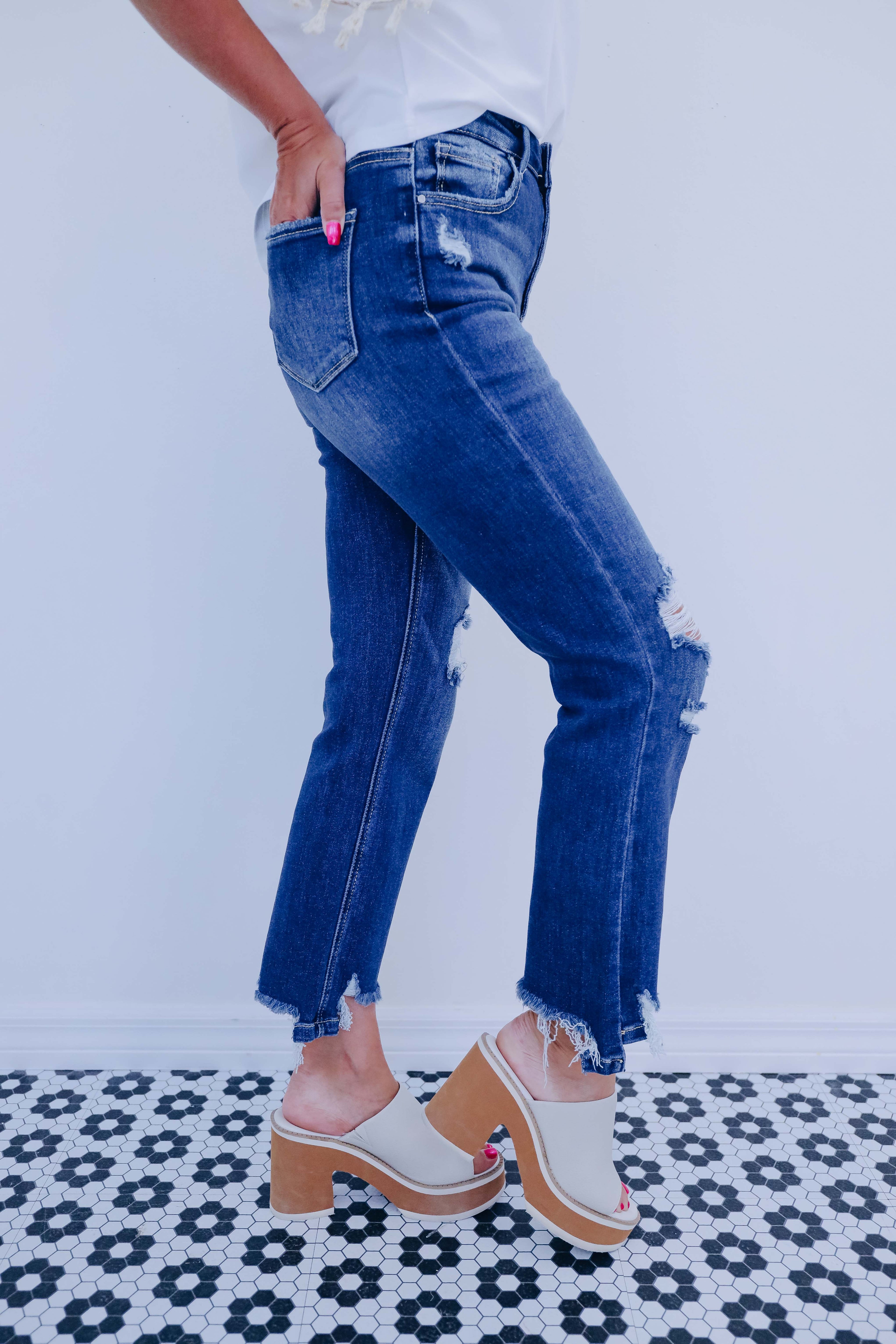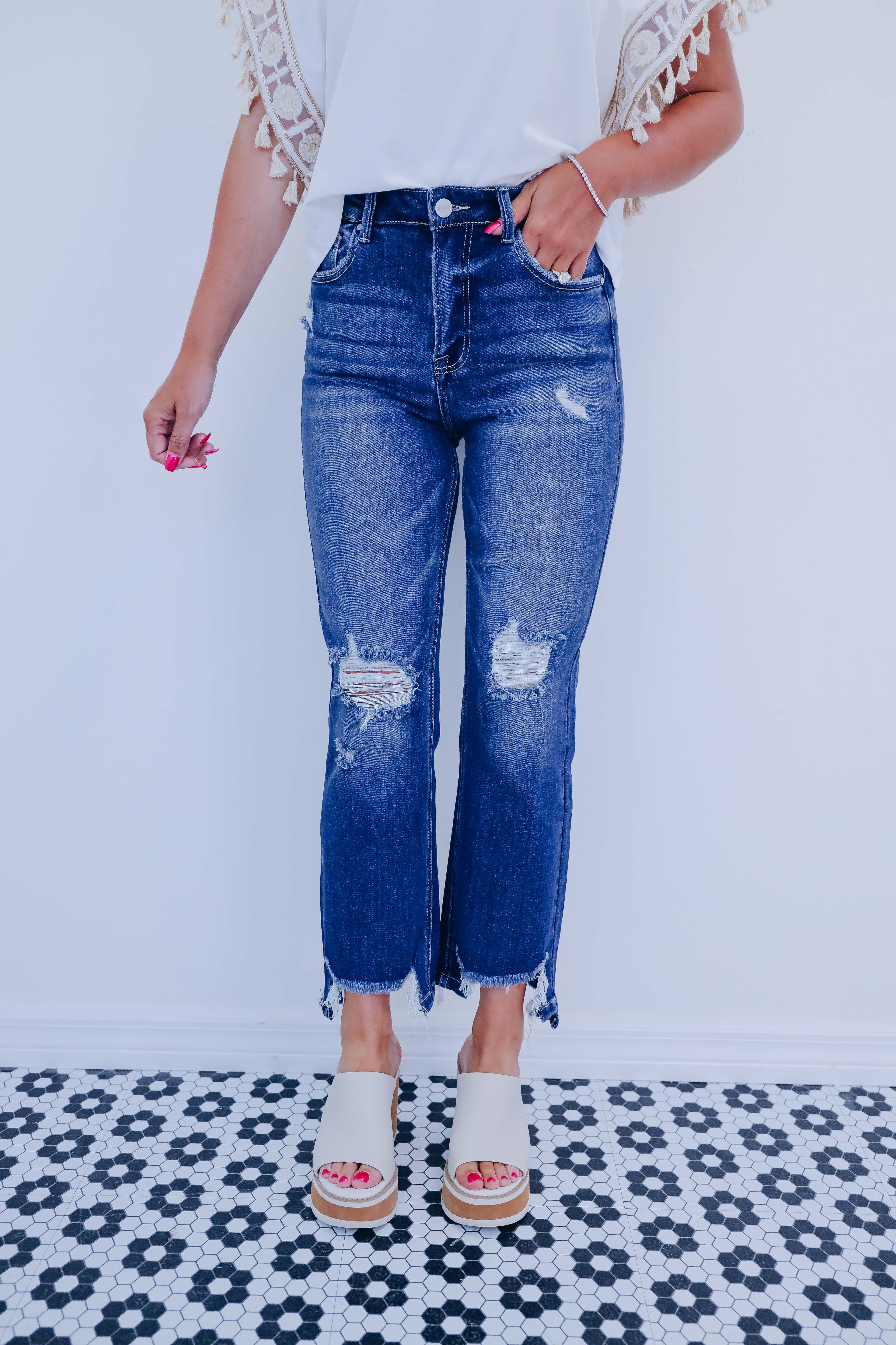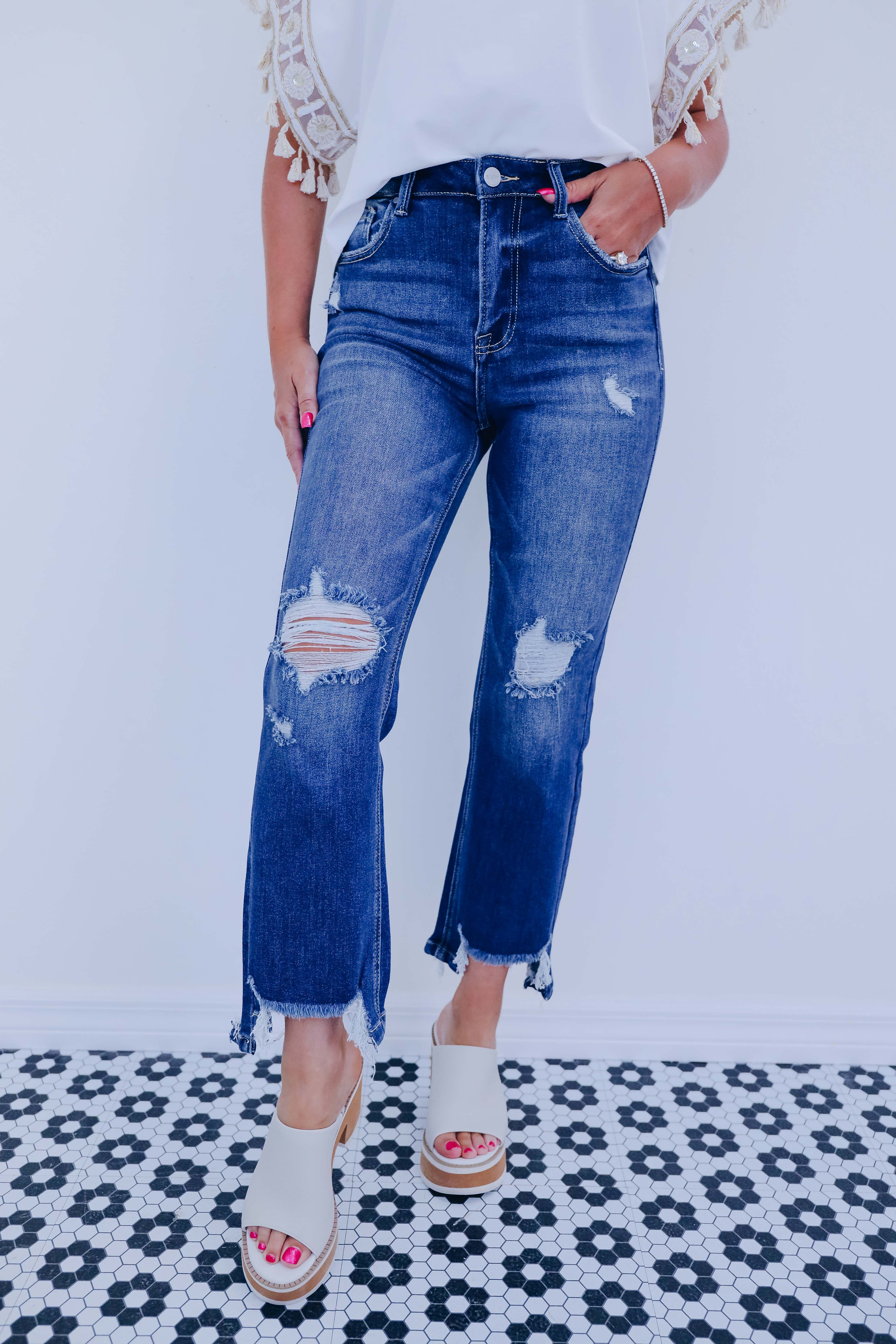 Don't miss out on this trendy and versatile addition to your wardrobe! Our DeSoto Distressed Step Hem Jeans - your new go-to for comfort and style will elevate your fit while pairing effortlessly with a variety of tops and footwear.