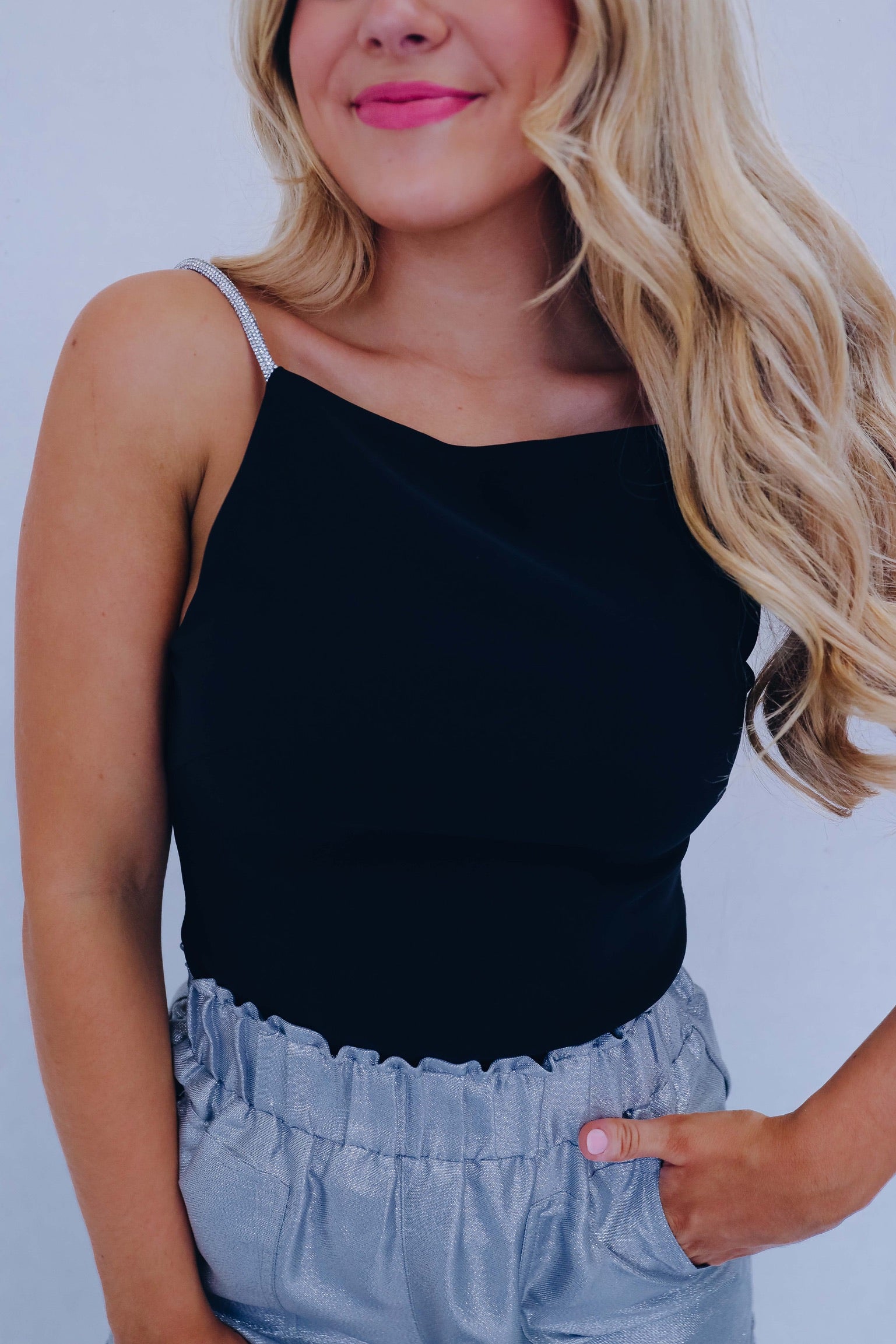 - Features a cowl neck with rhinestone spaghetti straps, open back, and a cropped straight hem.