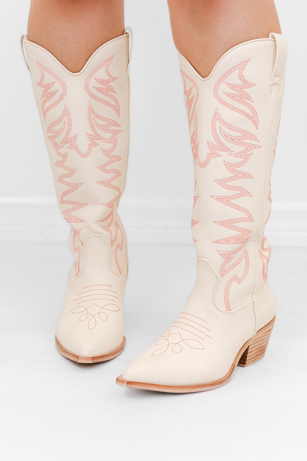 - Features a faux leather knee high boot, pointed toe, western inspired pink embroidery, wide fit long shaft, low stacked block heel, textile lining, and outside pull tabs.