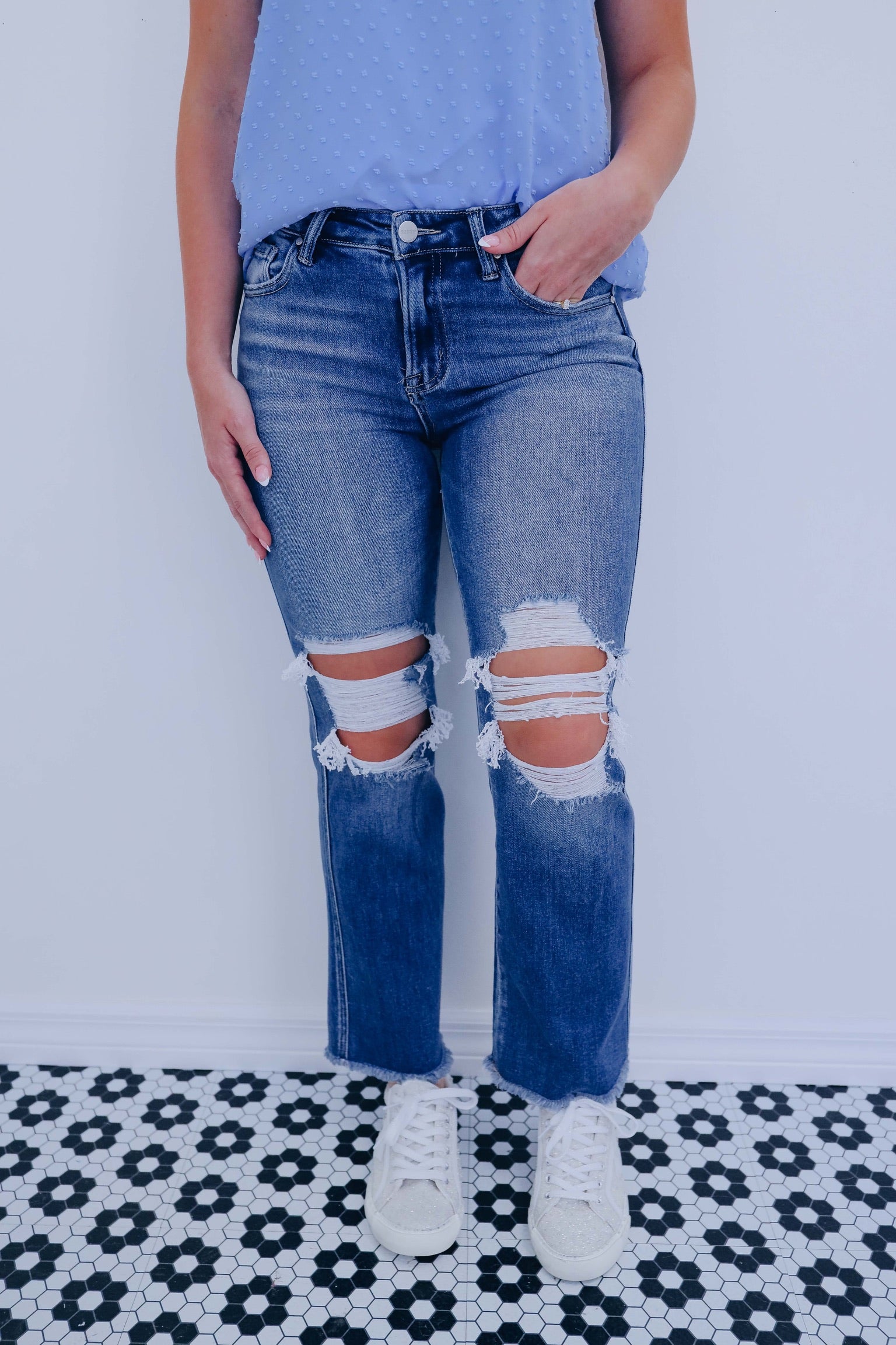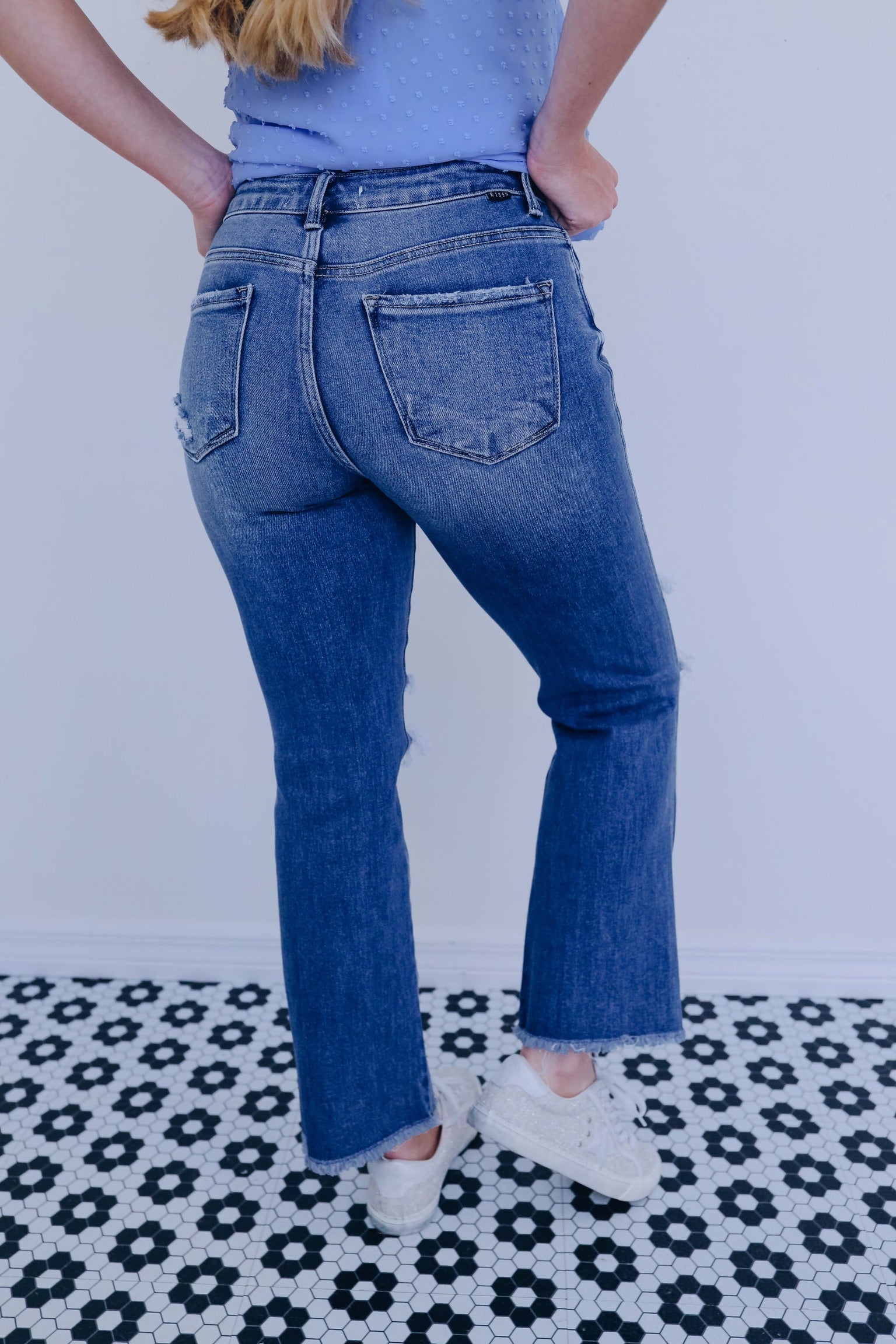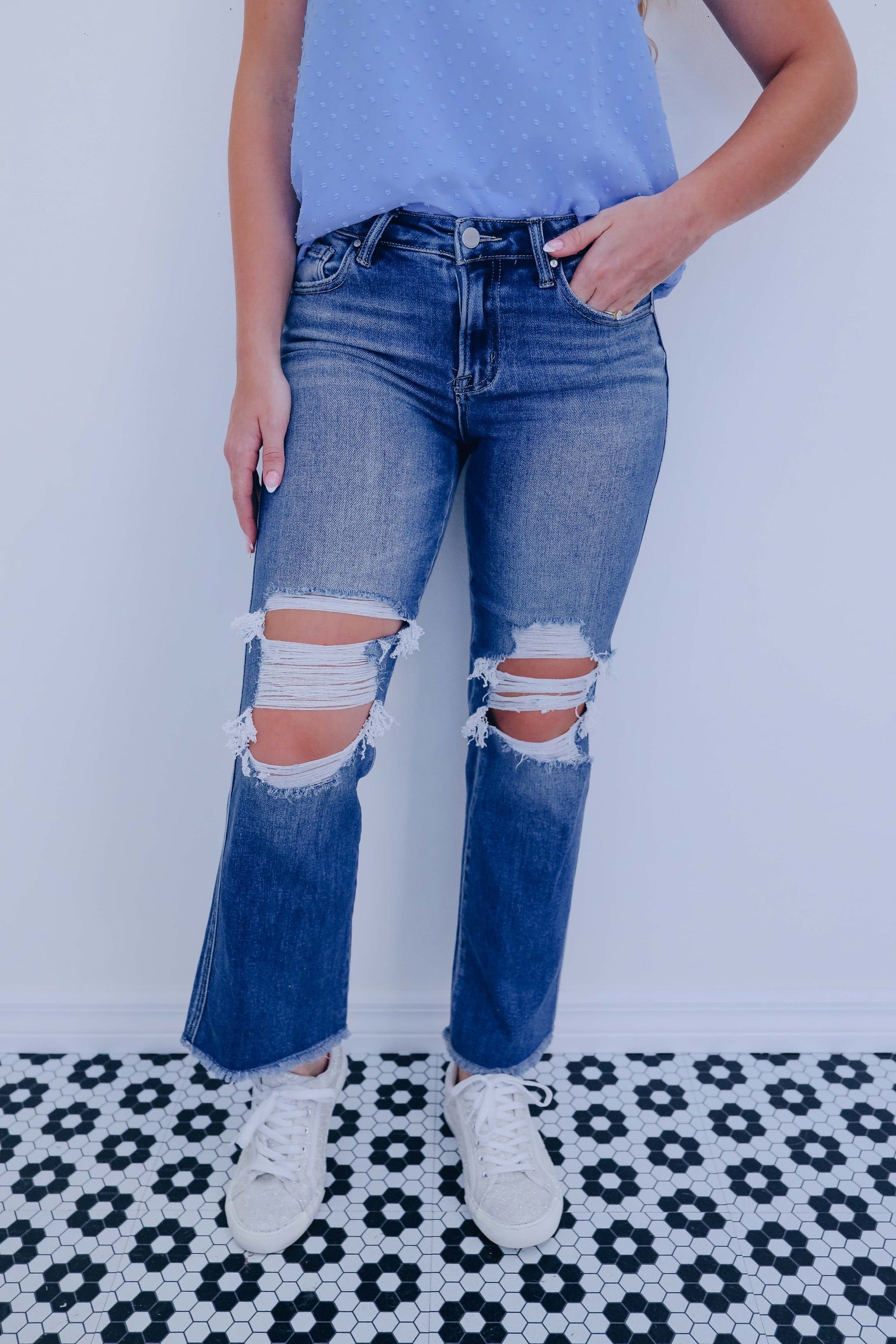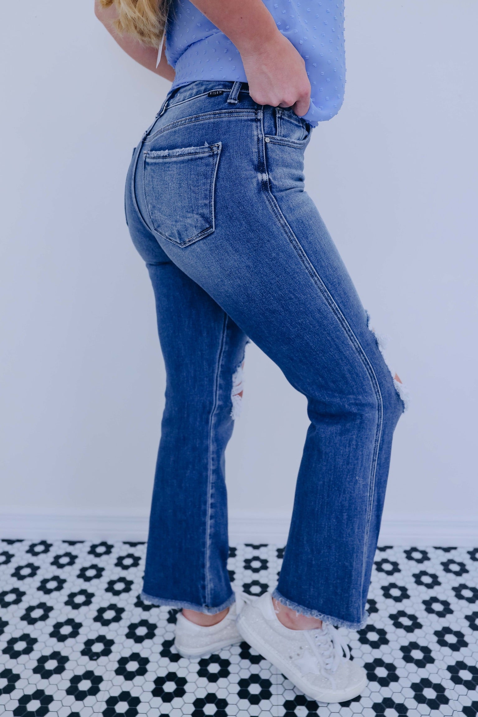 - These jeans have a distressed knee, a raw edge cropped flared hem, mid-rise waist, a medium wash tri-blend comfort denim fabric, and a five pocket design with button and zip closure.