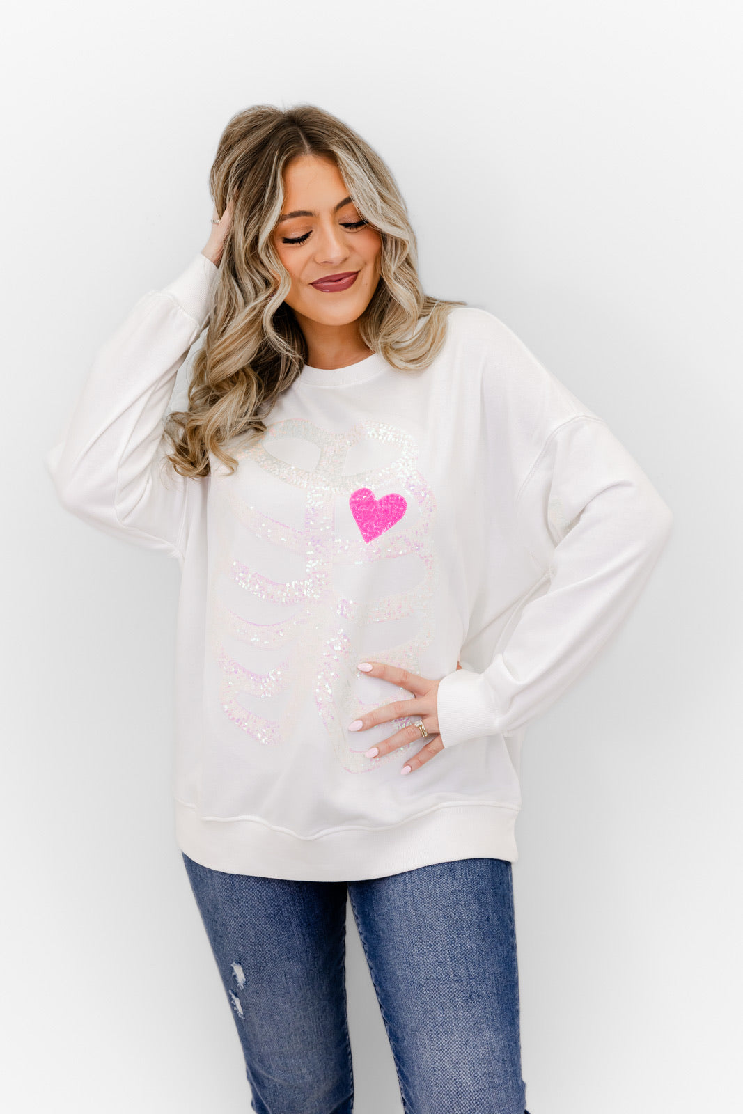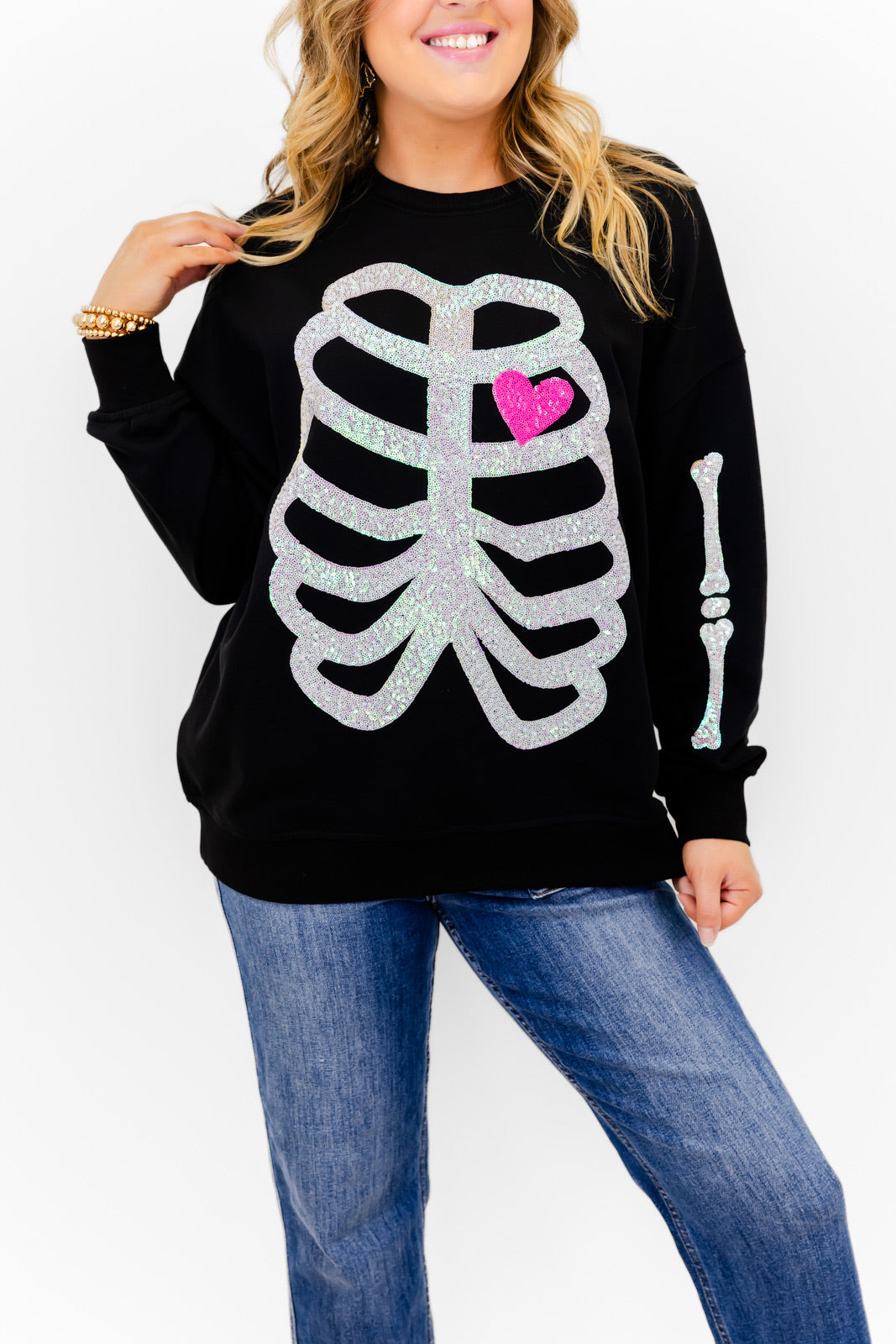 - Featuring Our Luxe French terry fabric, a ribbed crew neck, drop shoulder long sleeves, a straight banded hem, and is completed with an iridescent sequin skeleton rib cage and iridescent sequin bones on the arms.