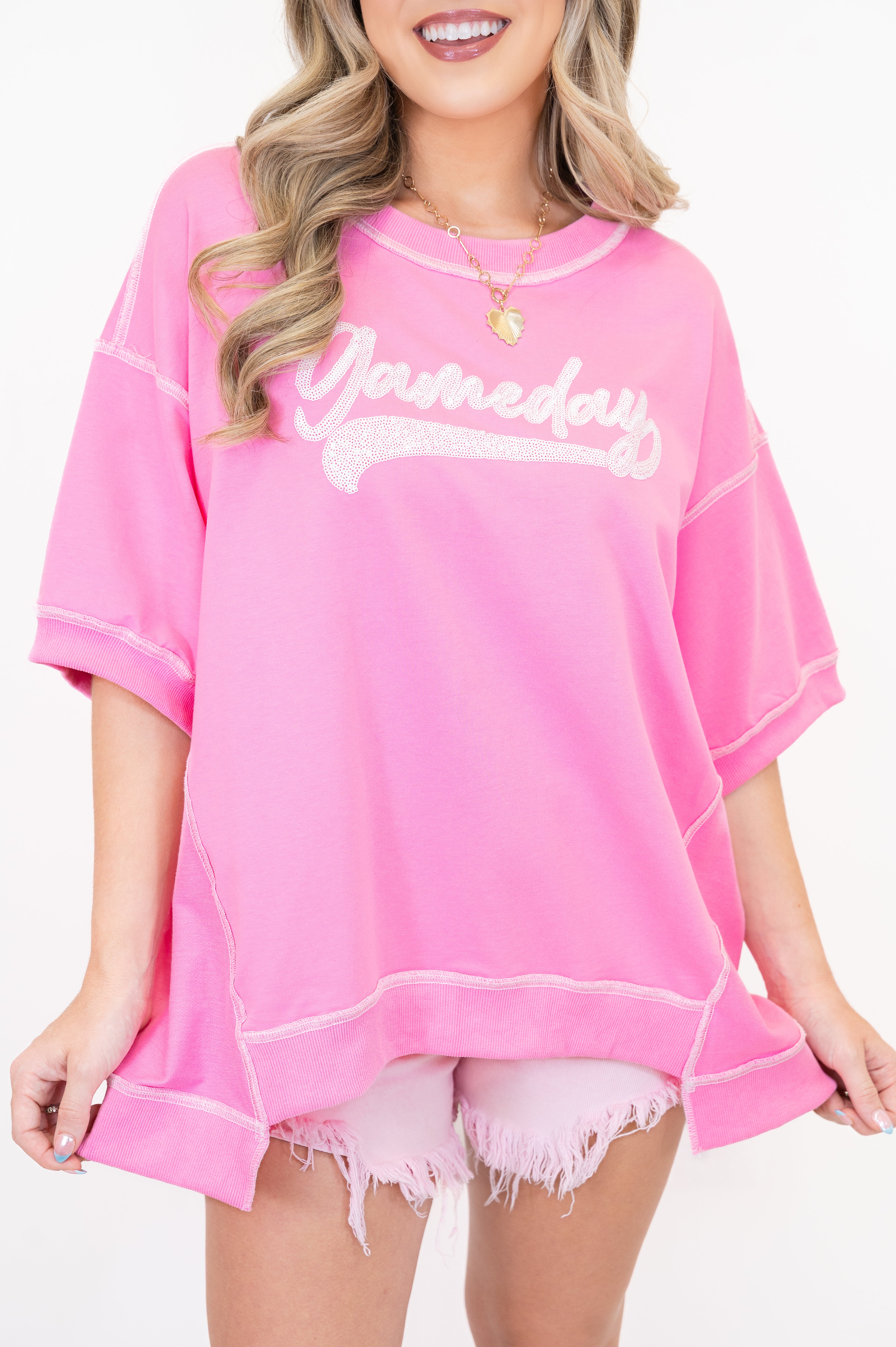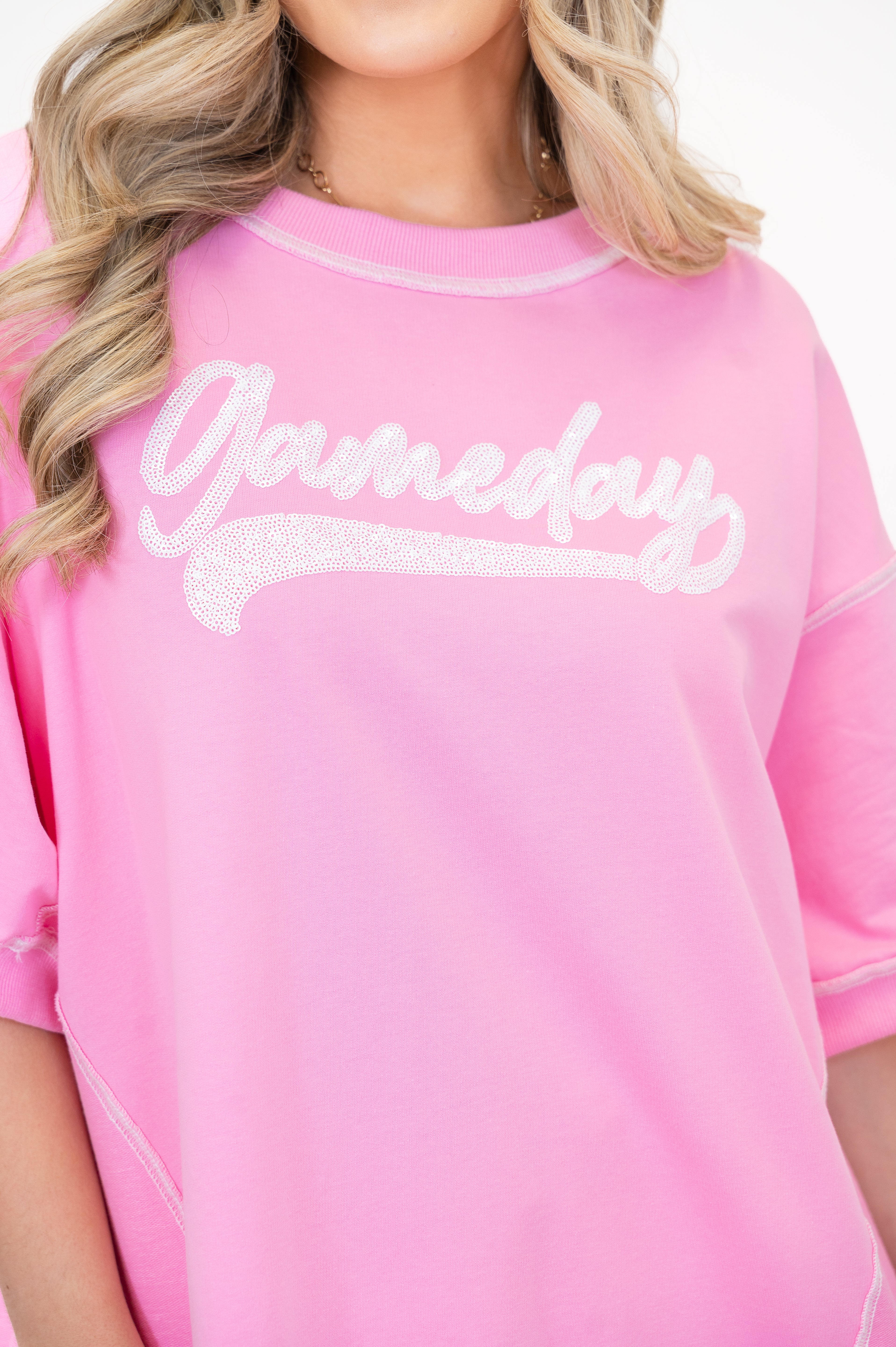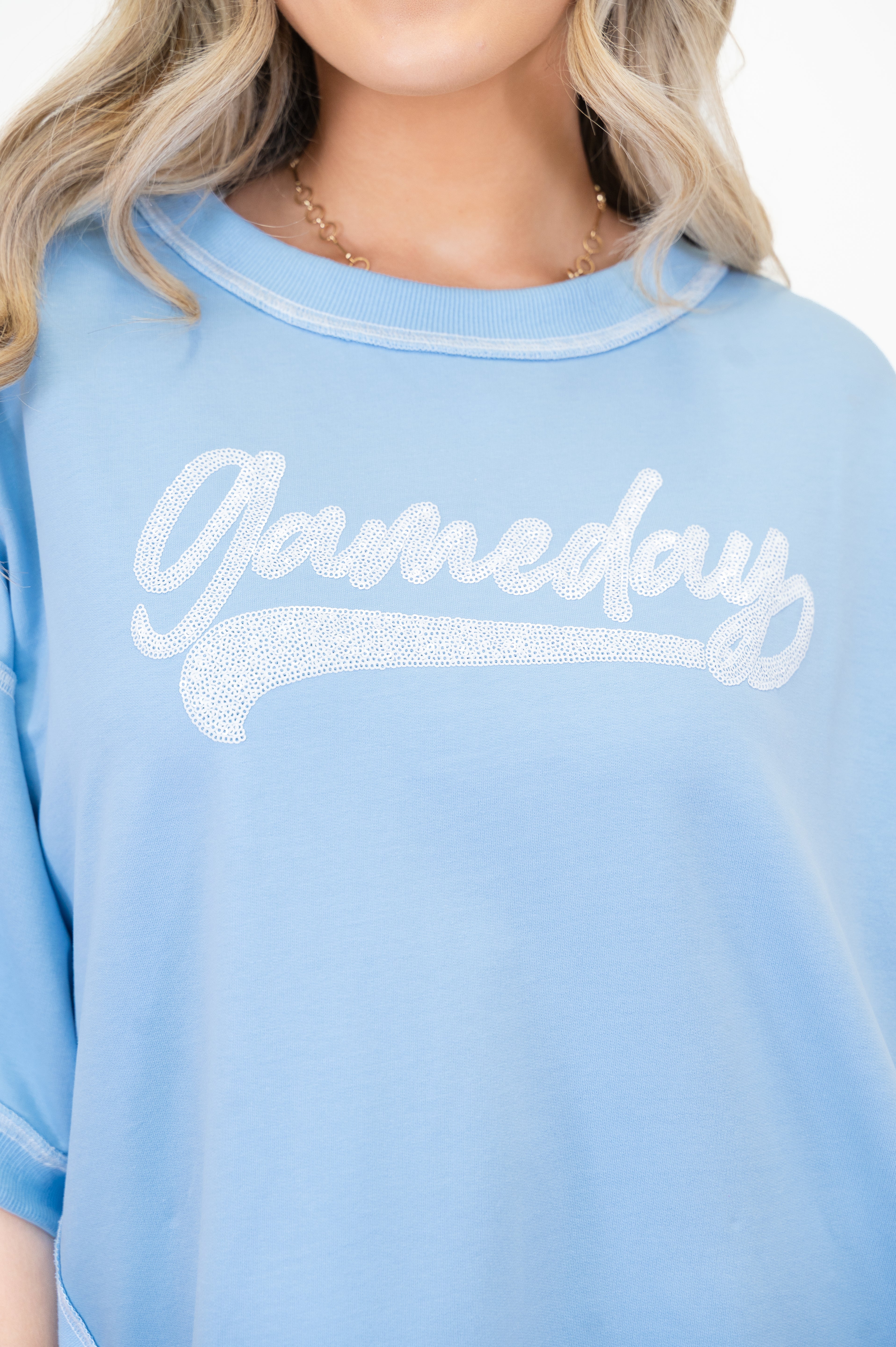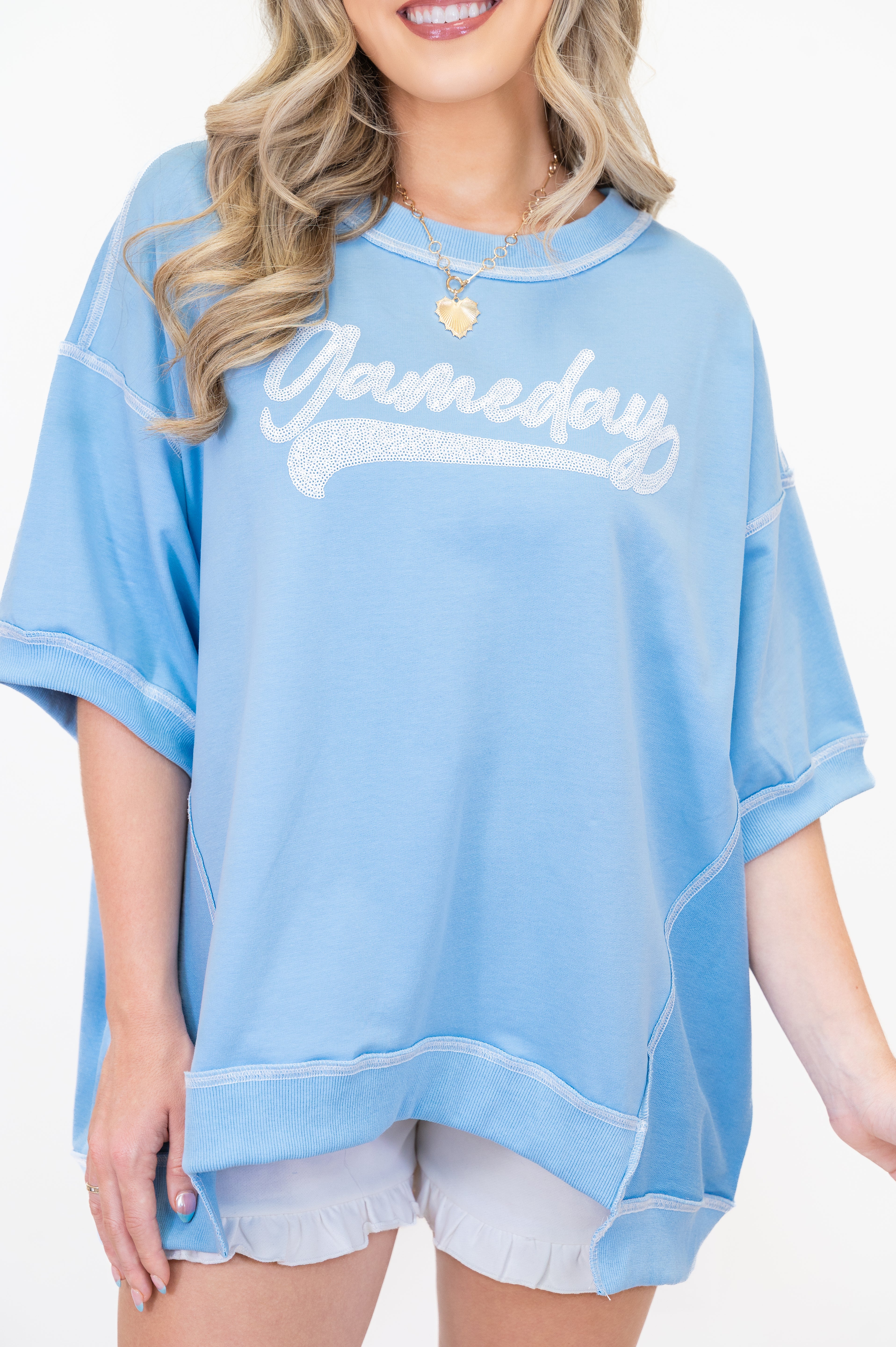 - Features a soft french terry fabric, embroidered sequin spelling "game day" on the front, short drop shoulder sleeves, reverse seam detailing throughout, a round neck, and a hi-lo step hem.